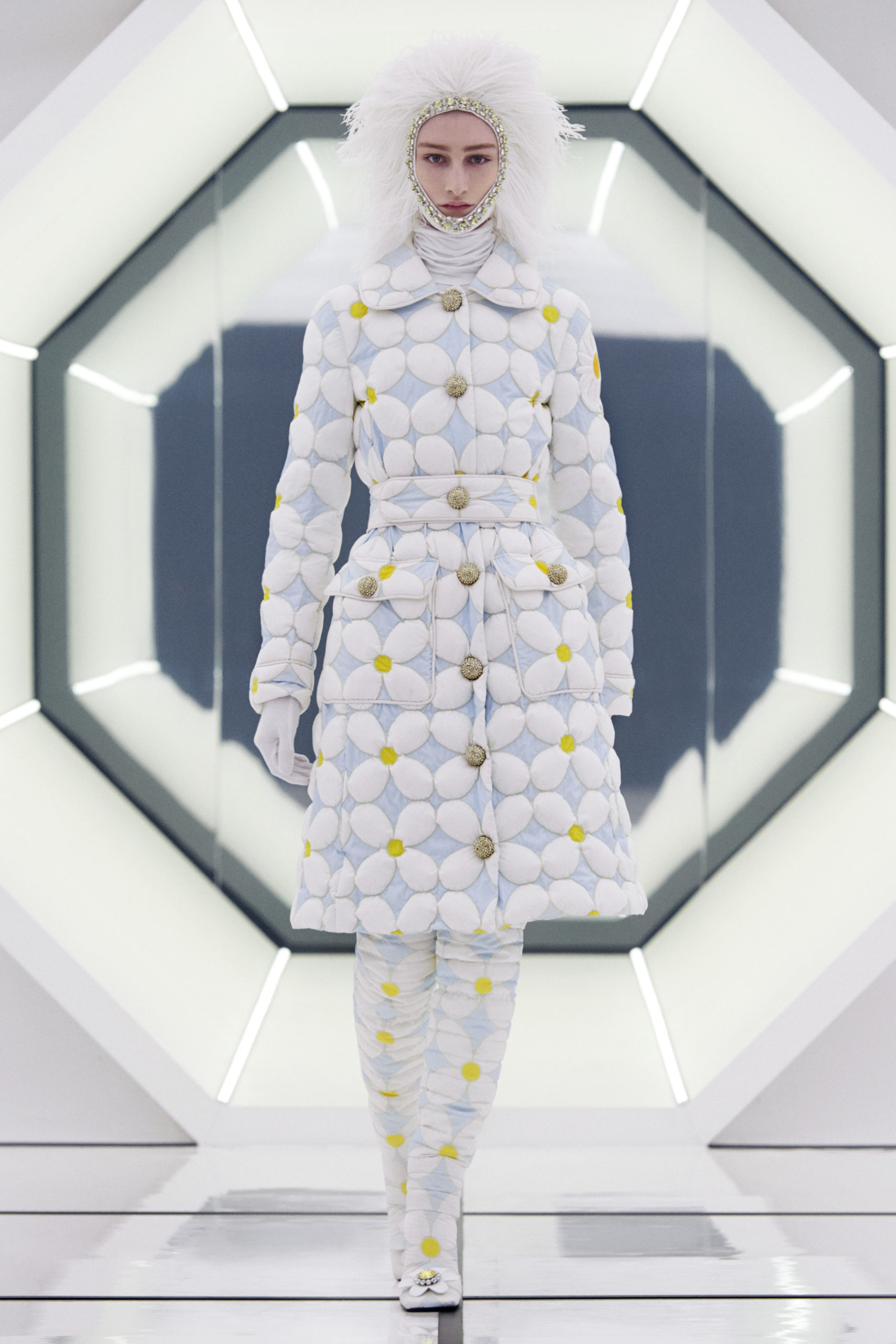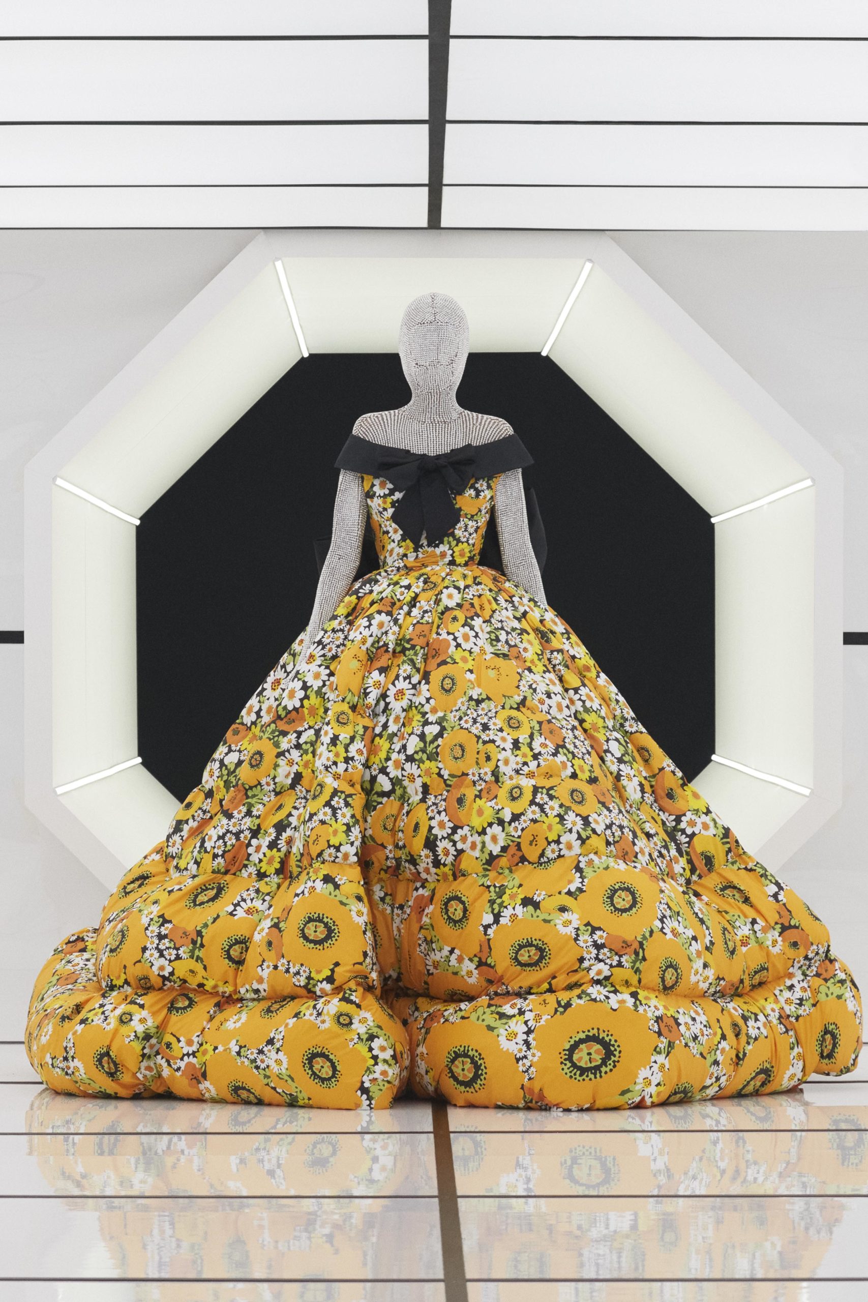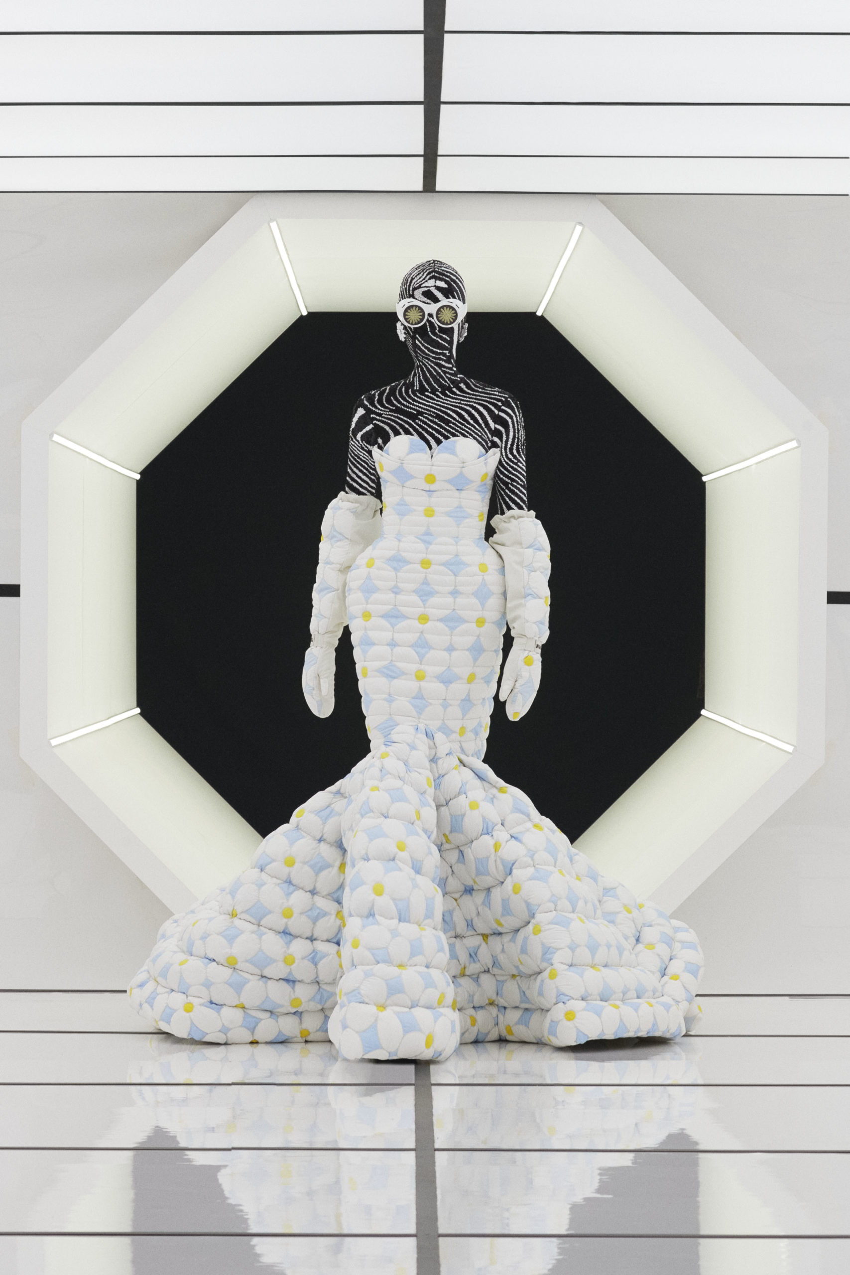 Les matières utilisées sont le nylon laqué, la gabardine enduite de résine pour une coupe droite, le satin duchesse et le twill de nylon technique. Cagoules à plumes, escarpins décorés, bottes matelassées de duvet à talon haut, cabas et sacs Sfera complètent la collection. Une capsule de robes et de jupes haute couture brodées porte le maximalisme à son paroxysme.