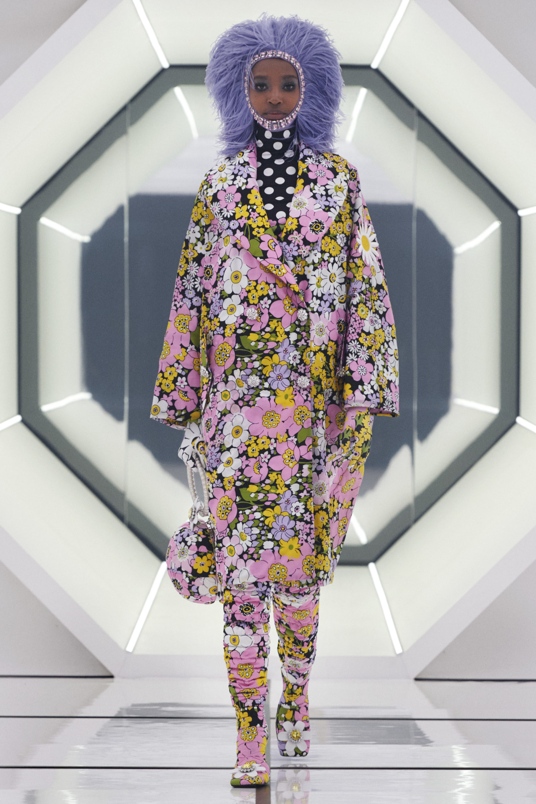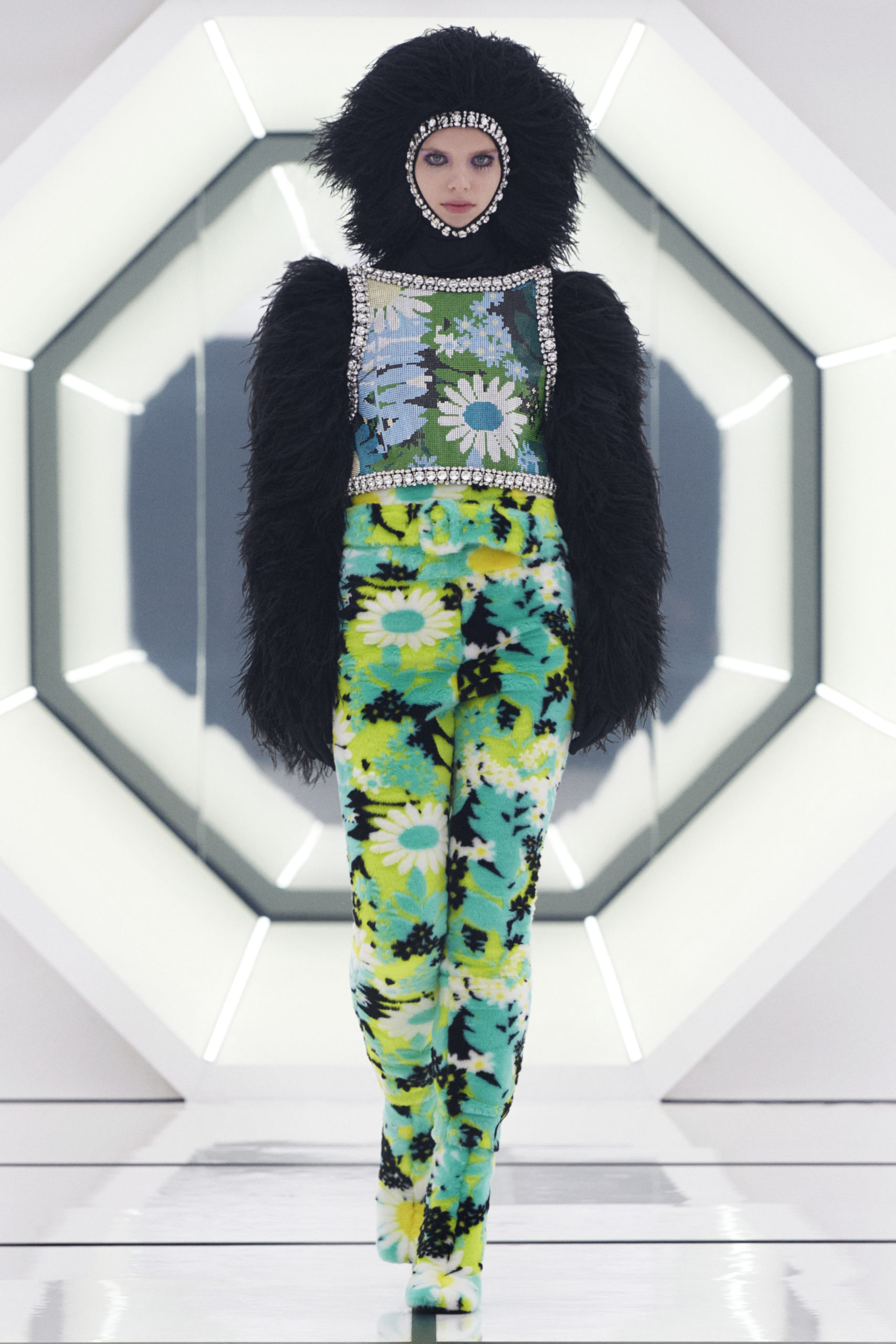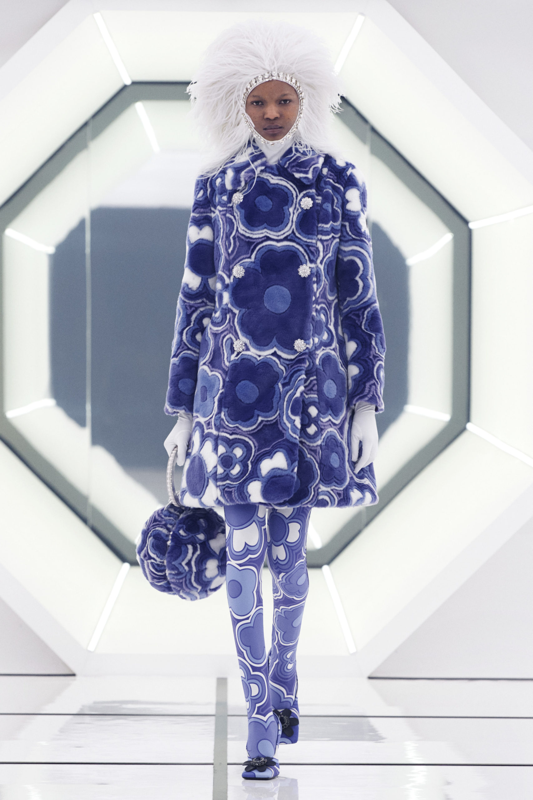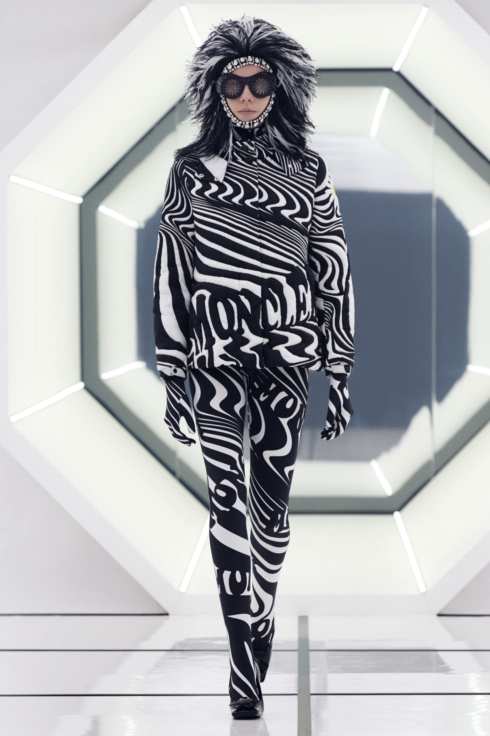 Les matières utilisées sont le nylon laqué, la gabardine enduite de résine pour une coupe droite, le satin duchesse et le twill de nylon technique. Cagoules à plumes, escarpins décorés, bottes matelassées de duvet à talon haut, cabas et sacs Sfera complètent la collection. Une capsule de robes et de jupes haute couture brodées porte le maximalisme à son paroxysme.