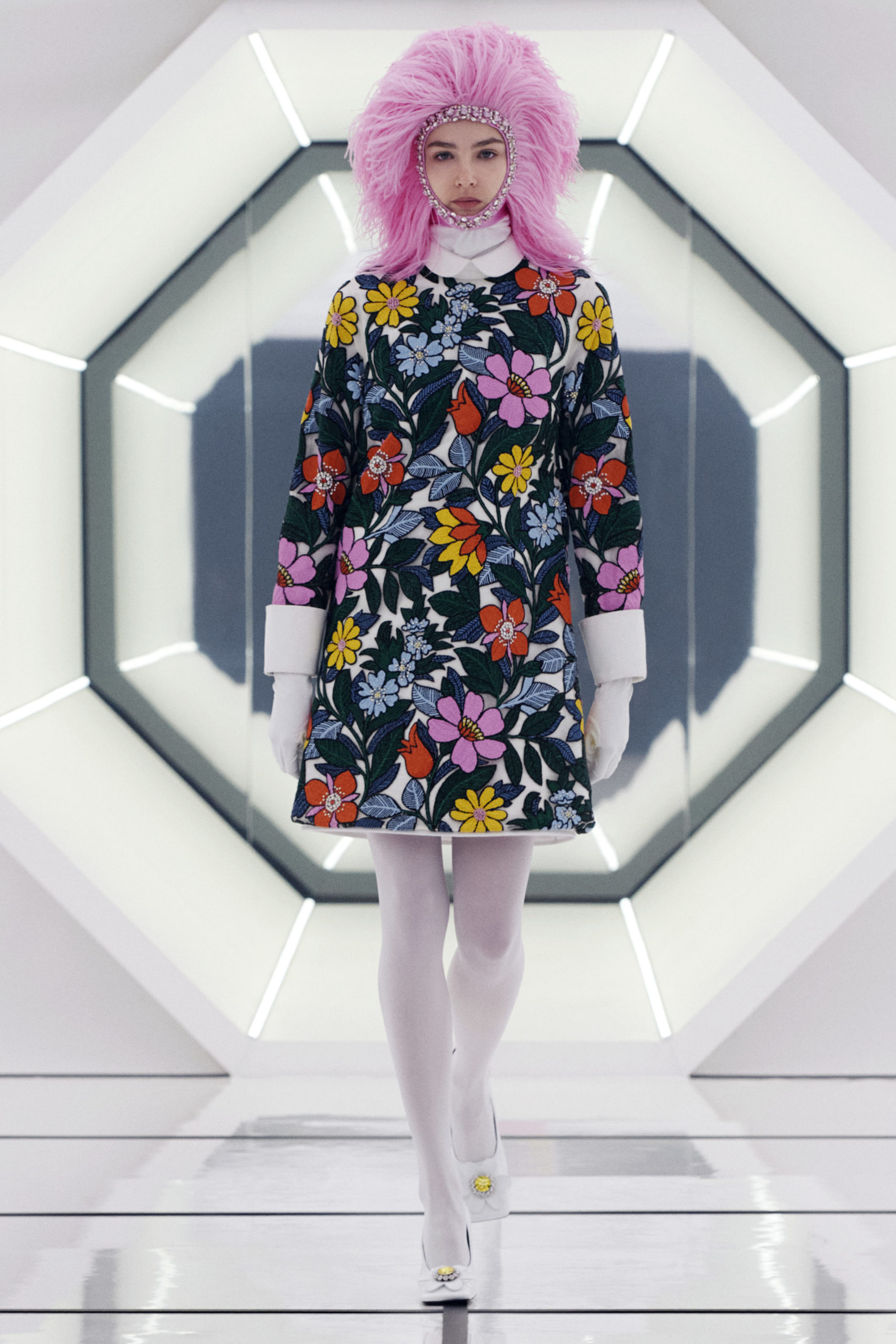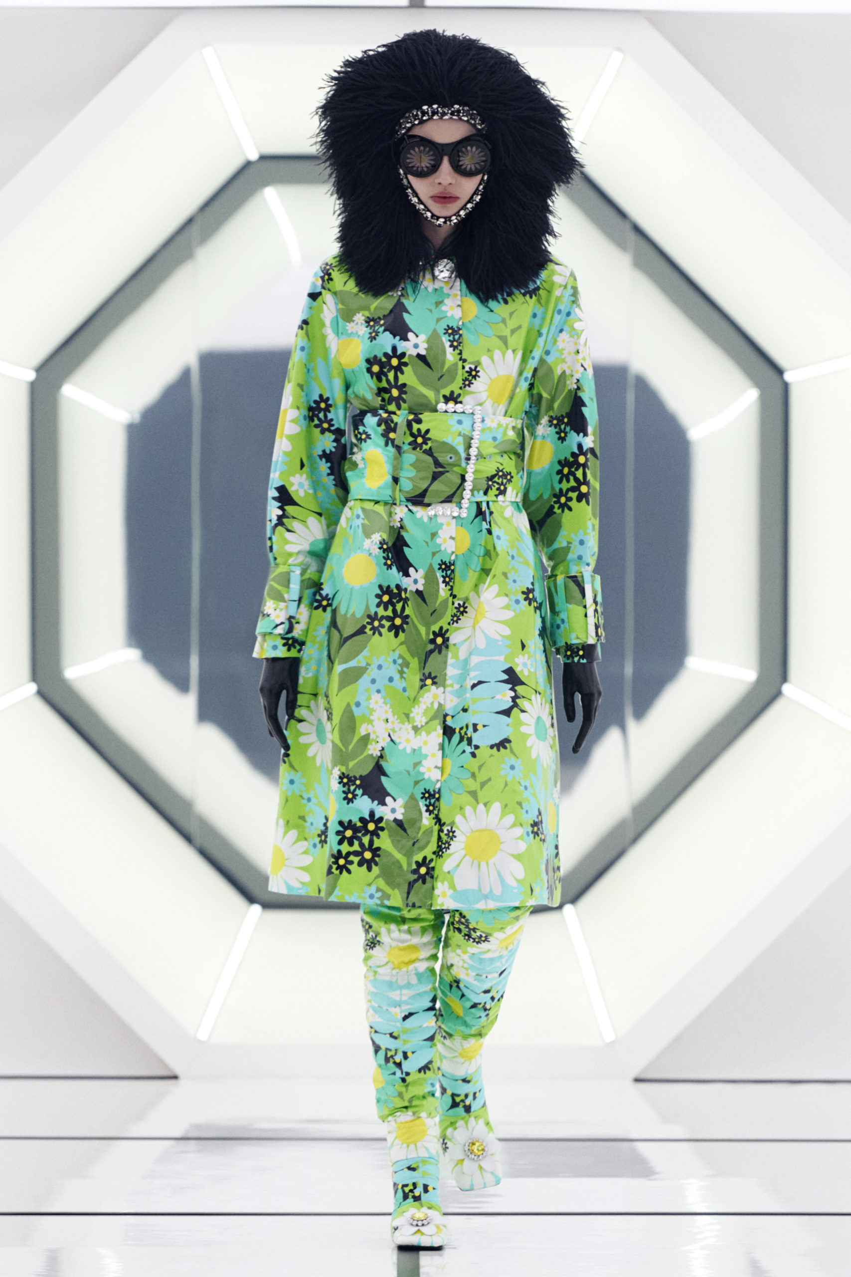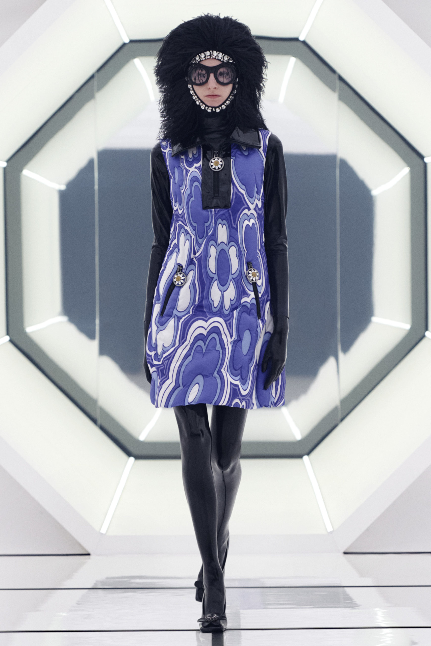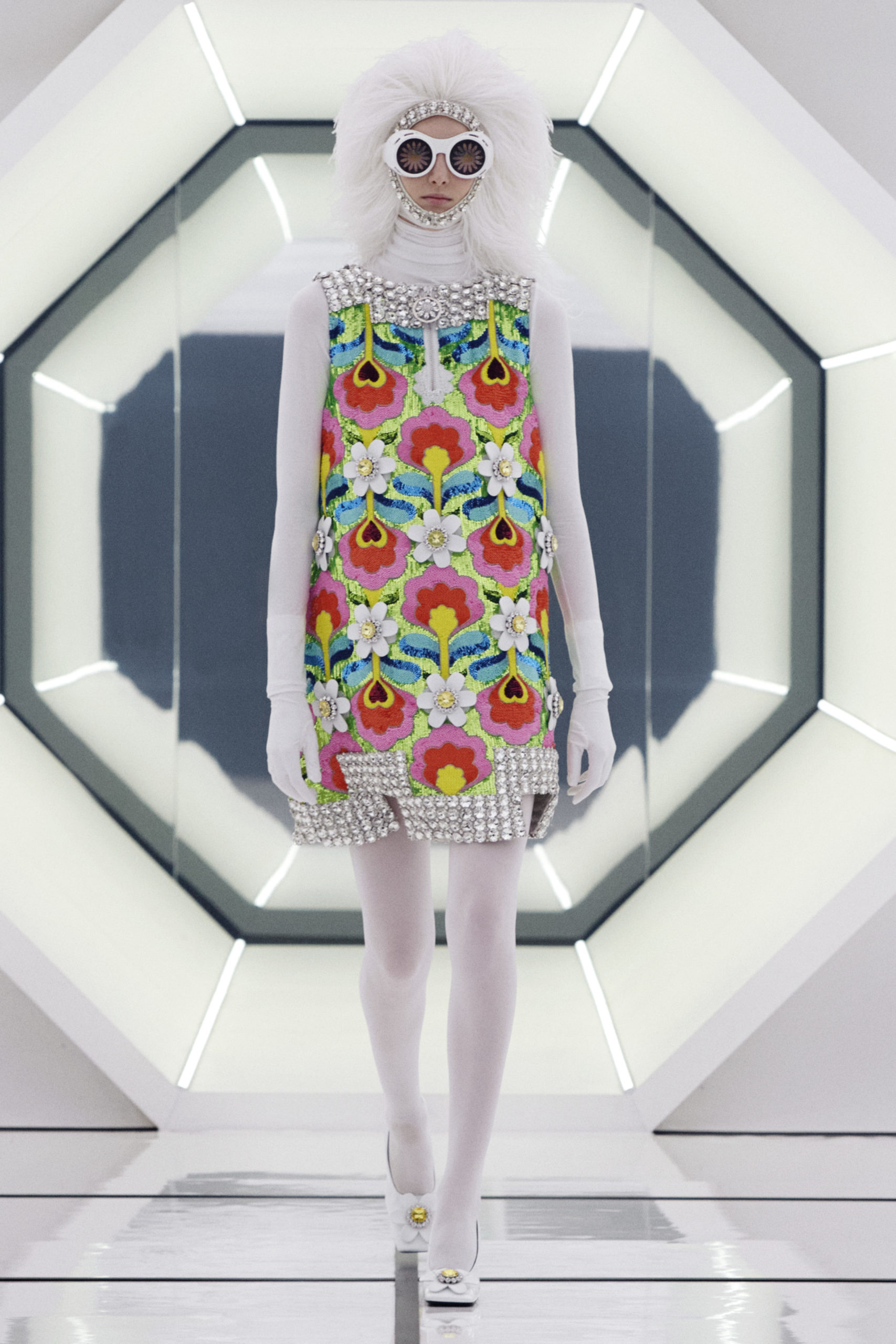 Les silhouettes de la collection sont graphiques : les robes courtes trapèze et les manteaux sobres aux boutons ornés de pierres précieuses s’inspirent de l’élégance des années 60, sans aucune note de nostalgie.