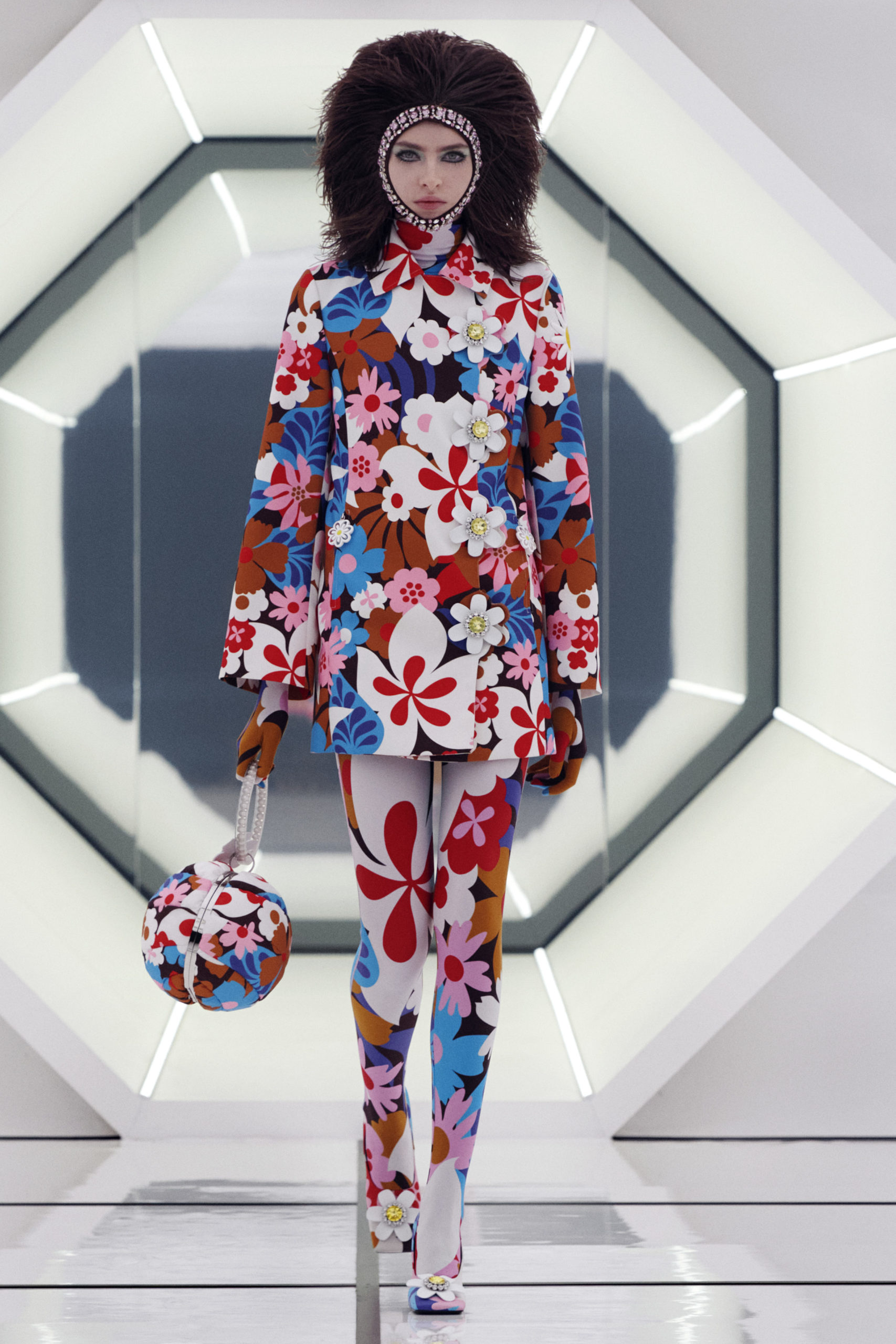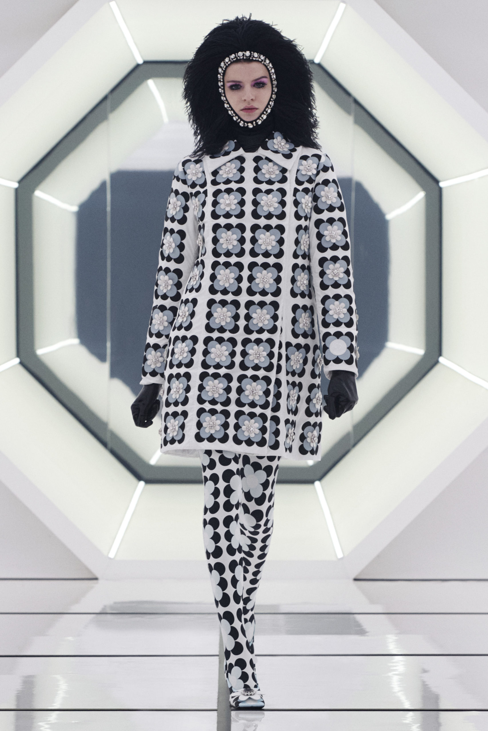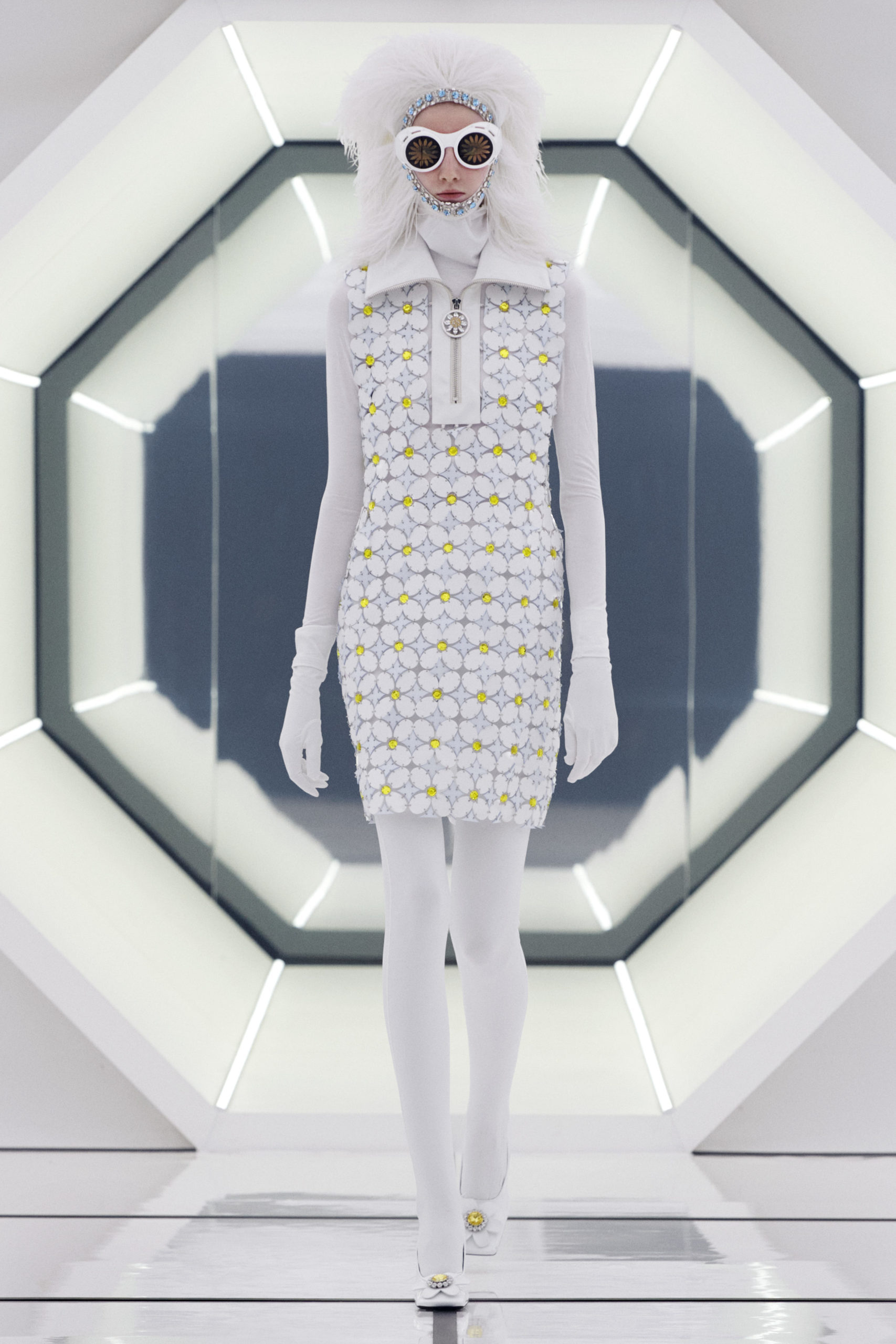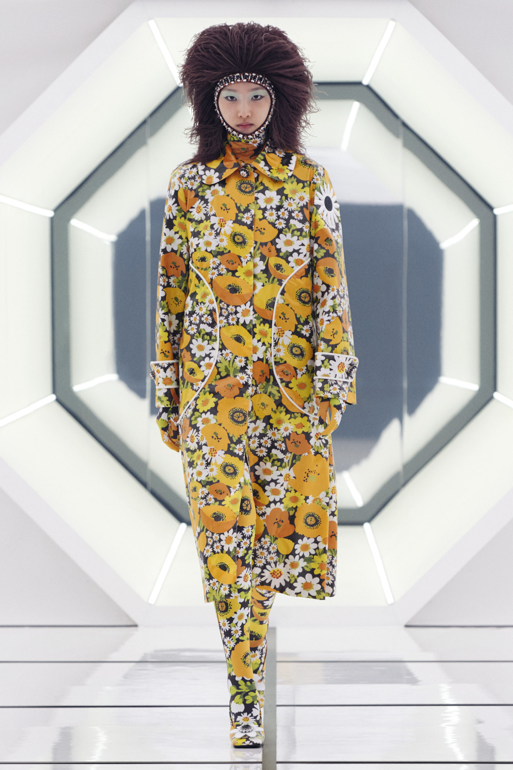 Les silhouettes de la collection sont graphiques : les robes courtes trapèze et les manteaux sobres aux boutons ornés de pierres précieuses s’inspirent de l’élégance des années 60, sans aucune note de nostalgie.