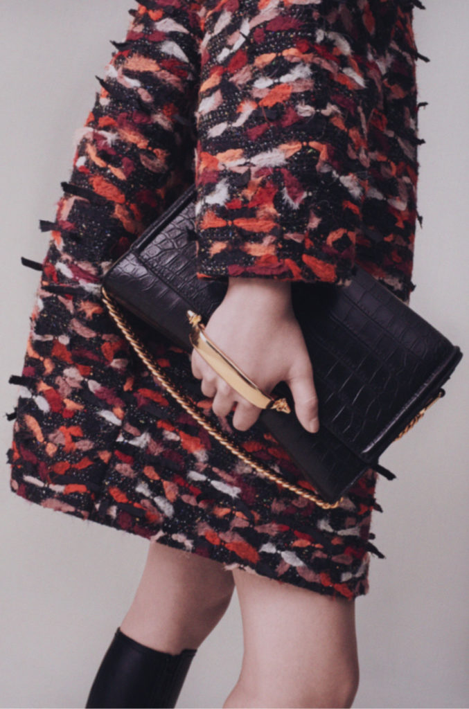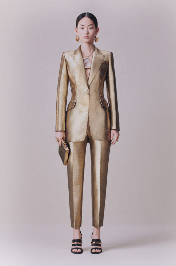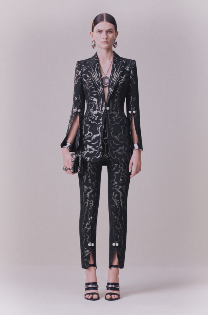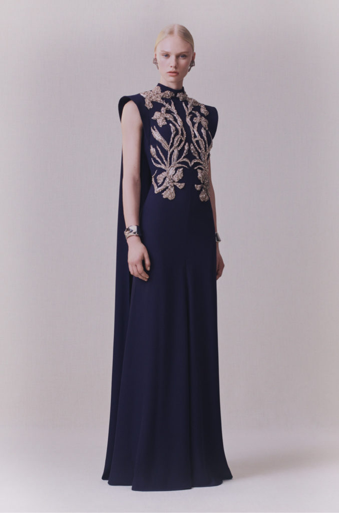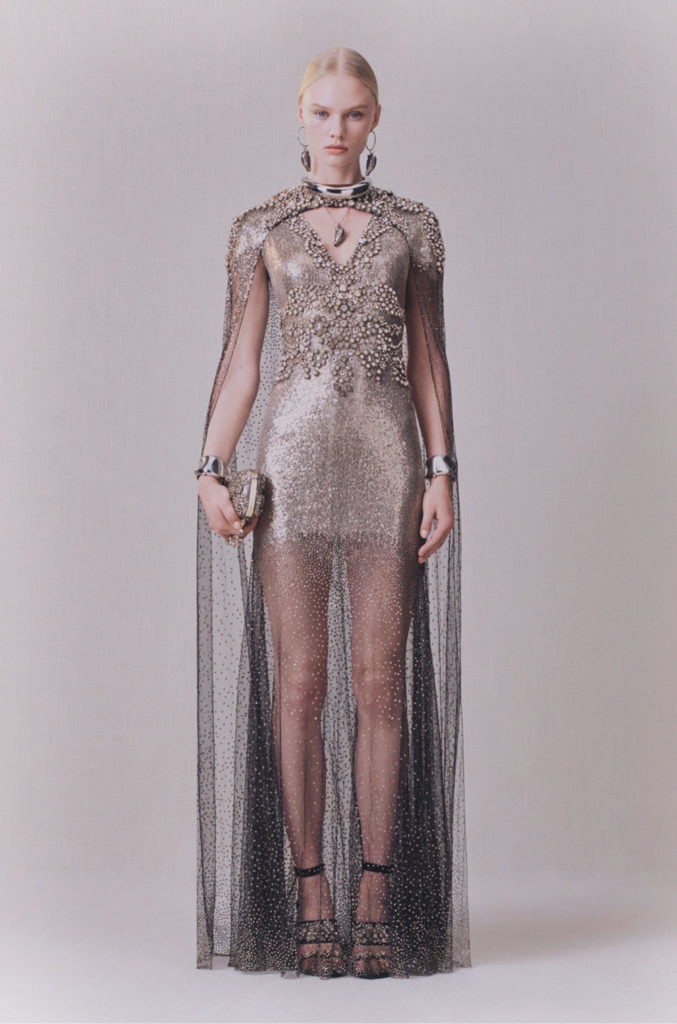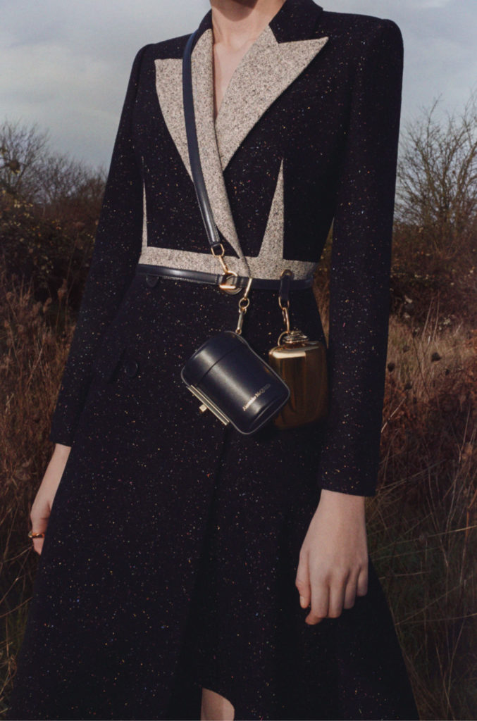Art nouveau et artisanat britanniques, l’élégance sobre du modernisme: l’iris sinueux, le chardon fier et la rose de Glasgow. La terre balayée par le vent et les paysages du Nord ont été mis à nu. Le cœur de la terre et les trésors cachés sous sa surface. Minerais métalliques: riches coutures d’or, d’argent et de cuivre partout. Minéralogie: cristal, agate, silex, roche; opaque et sculptural à l’extérieur, bijou et réfléchissant à l’intérieur. La juxtaposition entre la sobriété et la séduction, le brut et le raffiné, le texturé et le lisse, la lumière et l’obscurité, tout contraste avec l’écriture manuscrite de la maison d’Alexander McQueen.