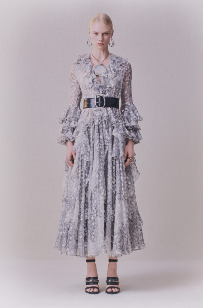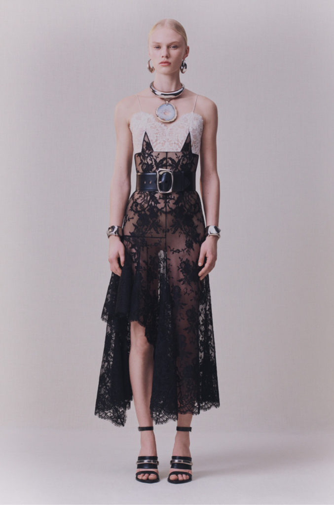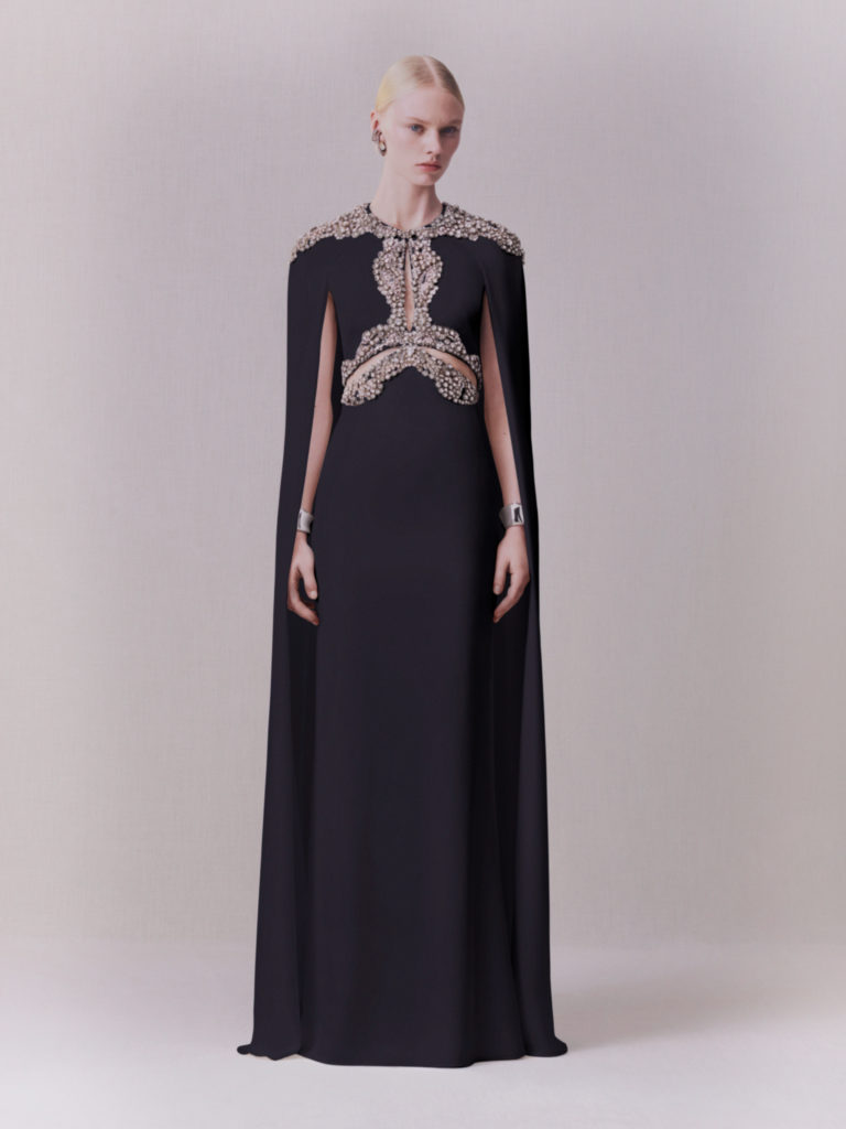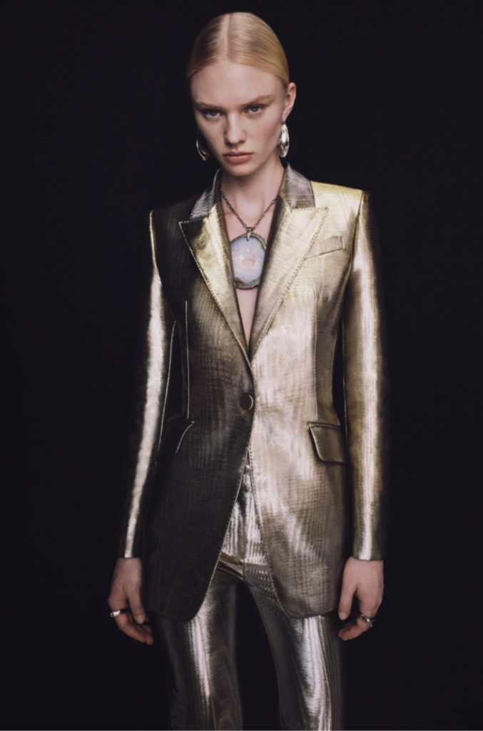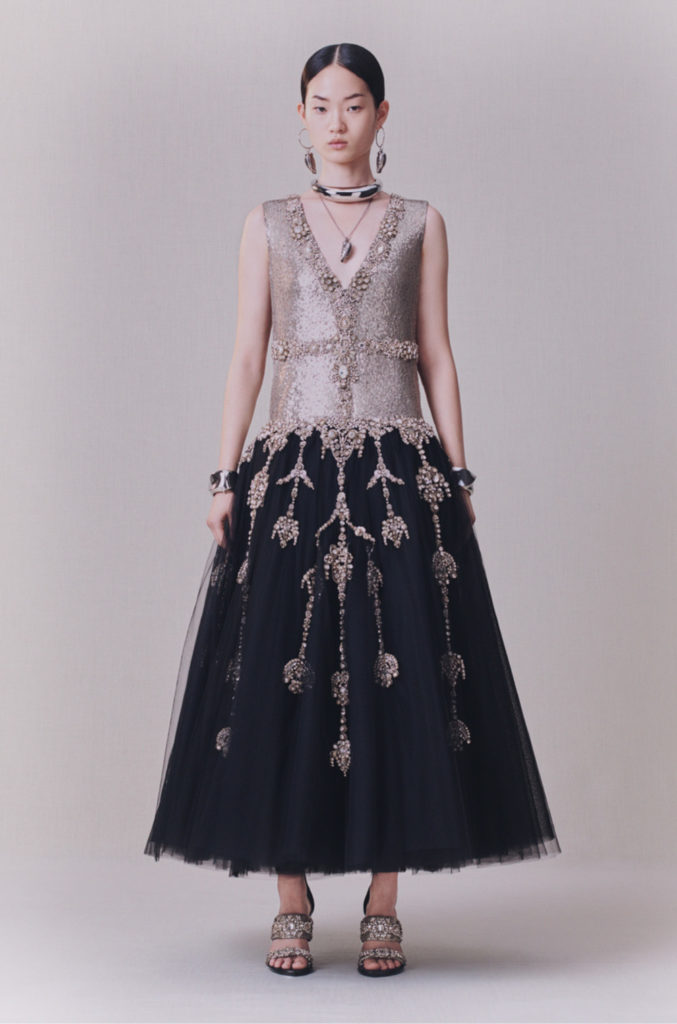 Art nouveau et artisanat britanniques, l’élégance sobre du modernisme: l’iris sinueux, le chardon fier et la rose de Glasgow. La terre balayée par le vent et les paysages du Nord ont été mis à nu. Le cœur de la terre et les trésors cachés sous sa surface. Minerais métalliques: riches coutures d’or, d’argent et de cuivre partout. Minéralogie: cristal, agate, silex, roche; opaque et sculptural à l’extérieur, bijou et réfléchissant à l’intérieur. La juxtaposition entre la sobriété et la séduction, le brut et le raffiné, le texturé et le lisse, la lumière et l’obscurité, tout contraste avec l’écriture manuscrite de la maison d’Alexander McQueen.