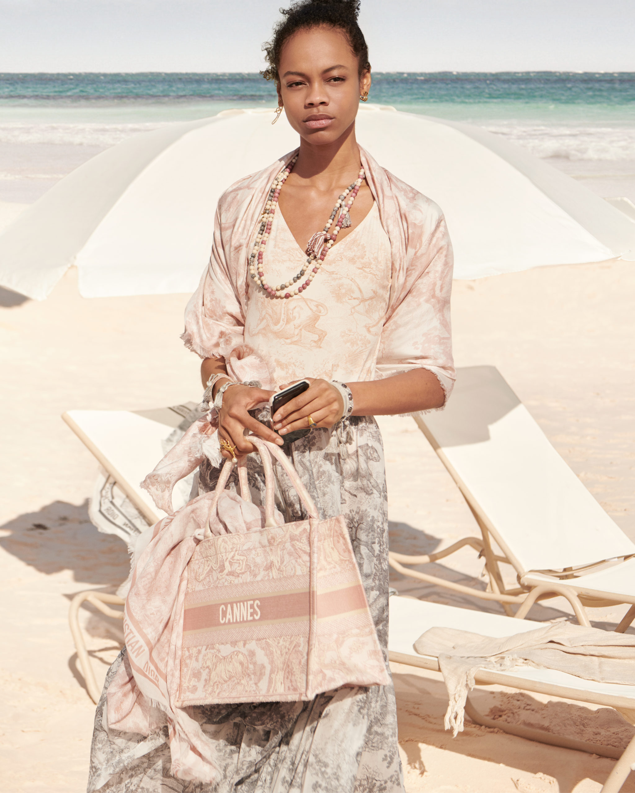 Devant l’objectif de Pamela Hanson, la capsule Dioriviera, pensée par Maria Grazia Chiuri, se met en scène dans le décor rêvé des plages des Bahamas. Ces créations aux couleurs lumineuse sinvitent à une douce échappée en bord de mer et s’habillent d’imprimés évoquant l’imaginaire du voyage. On retrouve l’iconique toile de Jouy, réinventée dans un esprit tropical ou dans des nuances pastel – de gris, de bleu et de rose –, des marinières arborant le nom de destinations ensoleillées, mais aussi des pièces issues de la capsule Dior Around the World, dévoilant les motifs camouflage et les dessins de Pietro Ruffo, artiste romain cher à Maria Grazia Chiuri, ainsi que d’autres accessoires estivaux. Une collection solaire, tendre et joyeuse promesse d’évasion.
