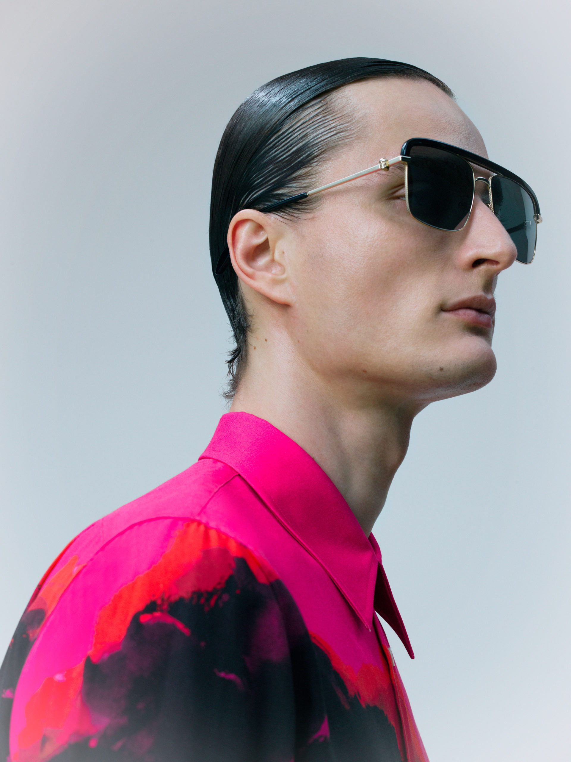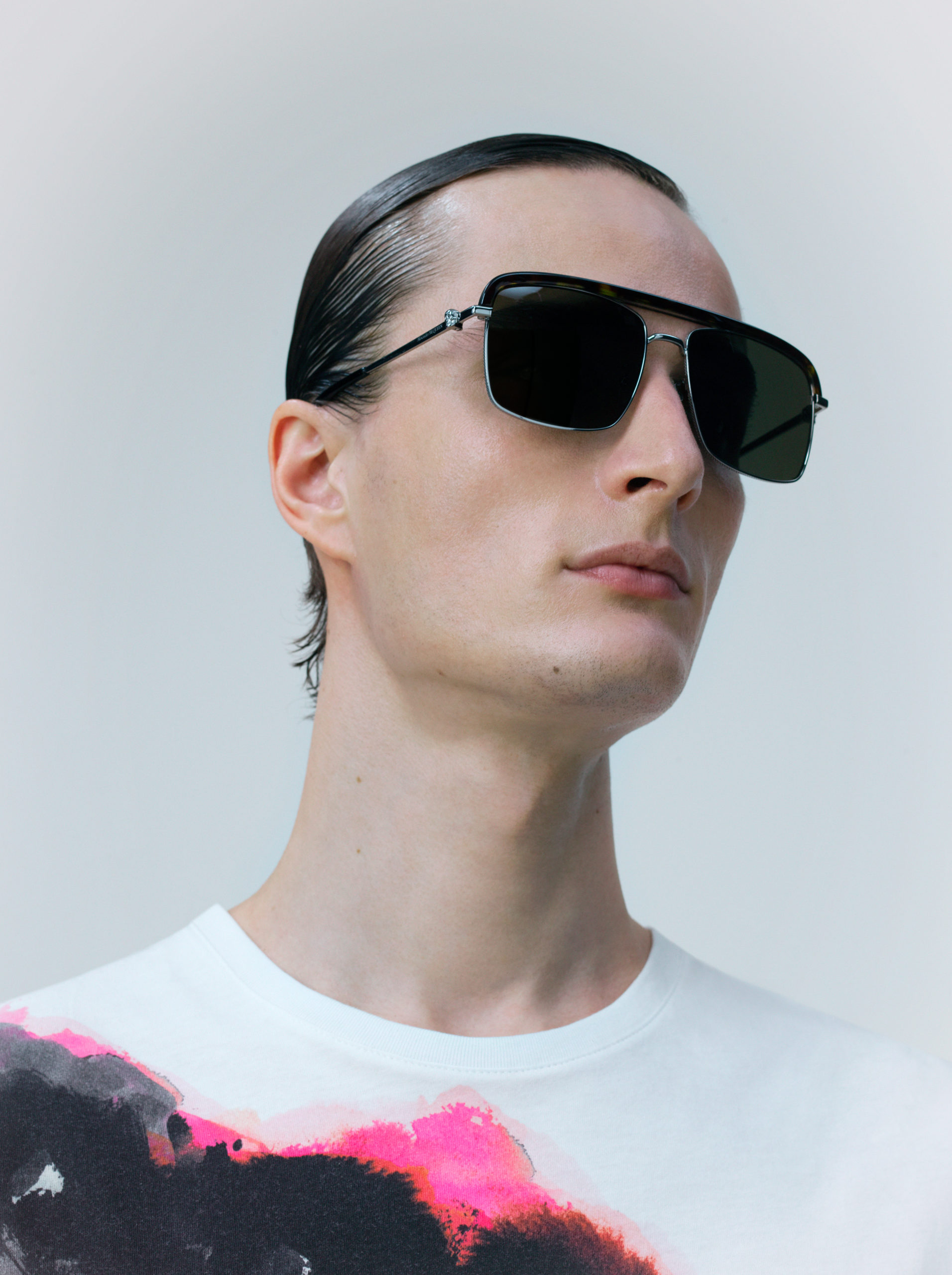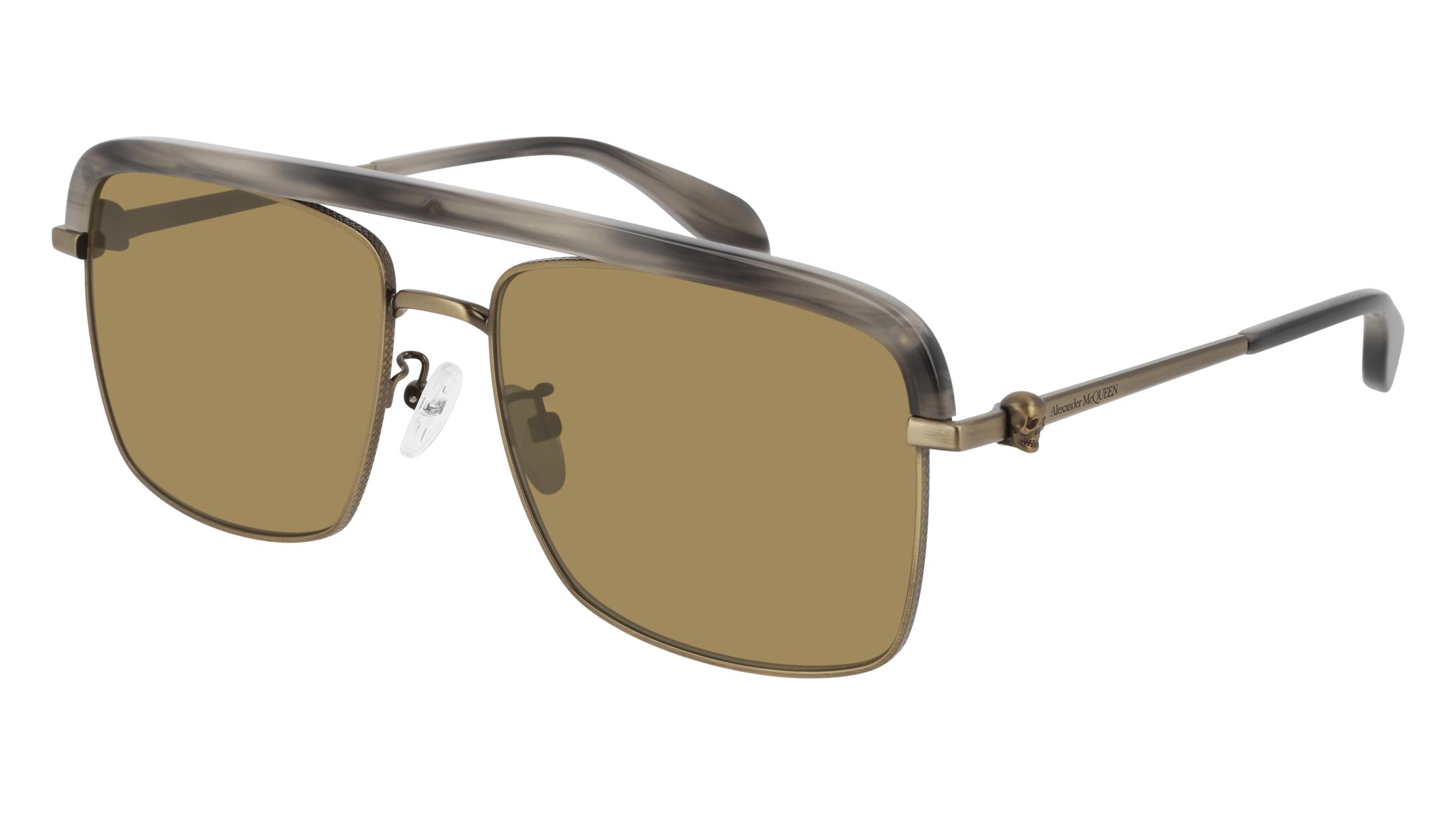 Ces lunettes de soleil en métal léger sont équipées de verres de couleur unie. Ils présentent des branches métalliques finies avec des motifs de crâne et la signature Alexander McQueen gravée ton sur ton. Les verres et les barres d’acétate sont disponibles dans une variété de couleurs et de finitions.