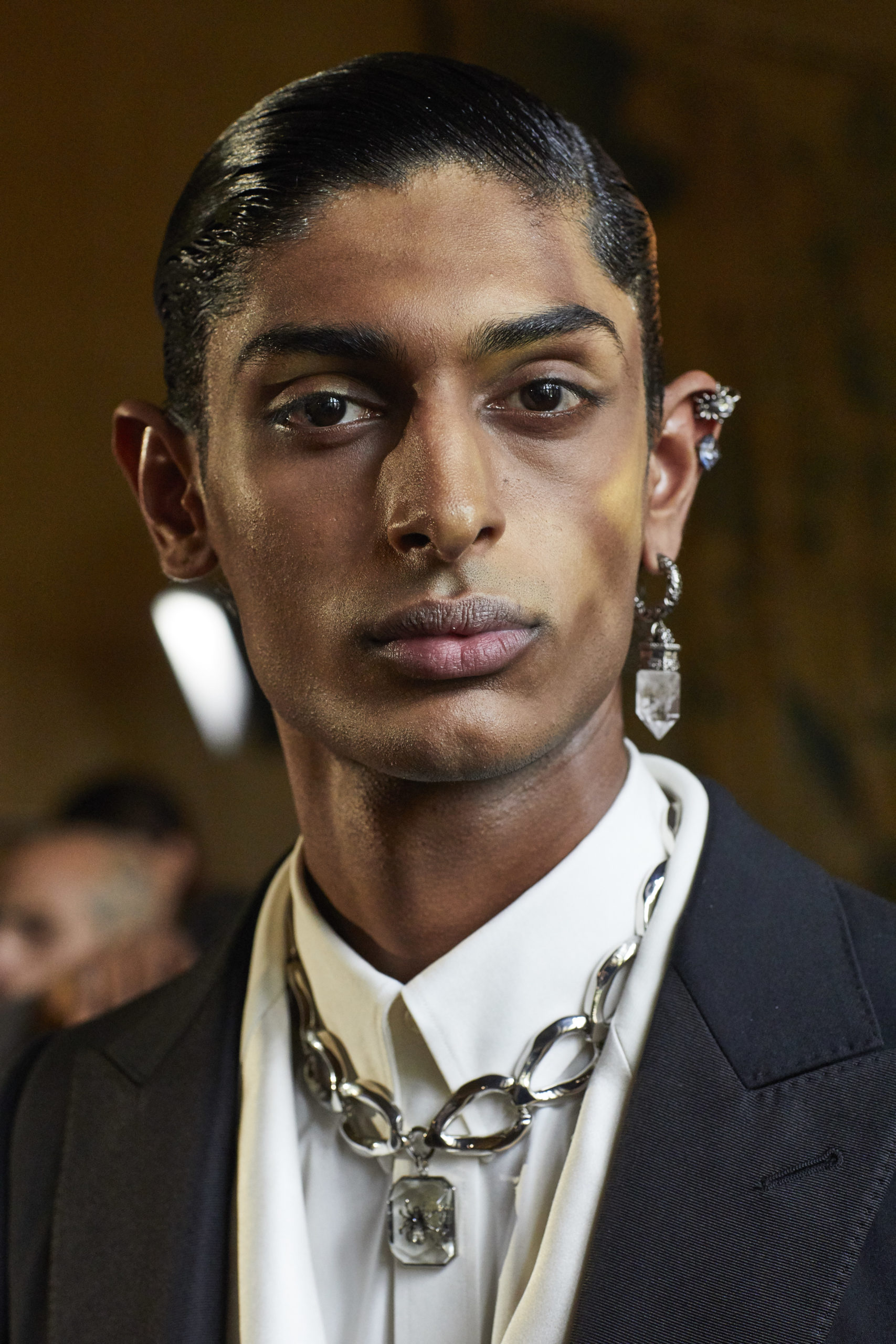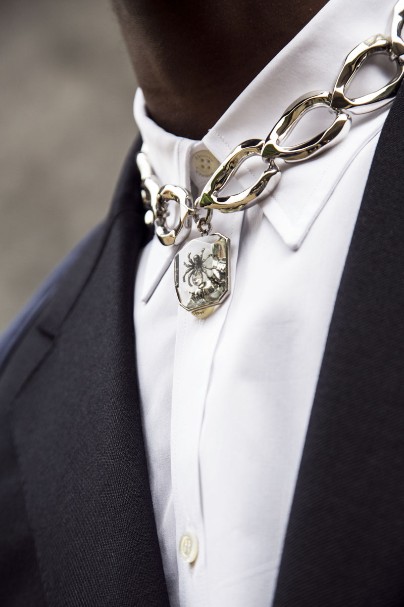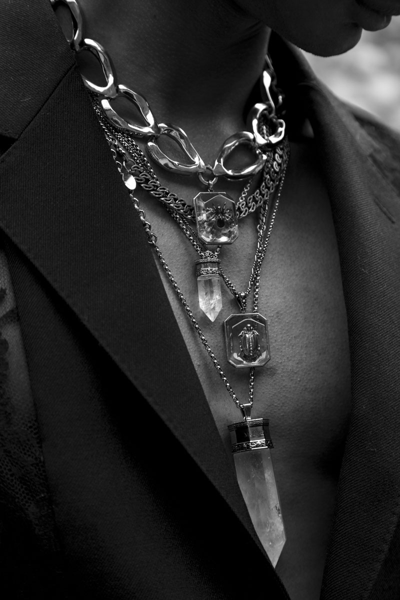 Les breloques comportent des coléoptères et des araignées piégés dans de la résine et de grands pendentifs en cristal de quartz à facettes trempés dans des pigments de couleur et sertis dans de délicates tasses en métal bordées de fleurs ornées de bijoux. Les bagues en argent antique sont serties d’insectes piégés dans de la résine ou ont des détails floraux en haut relief et des bords à facettes finis avec des microcristaux et des boules de métal écrasées.