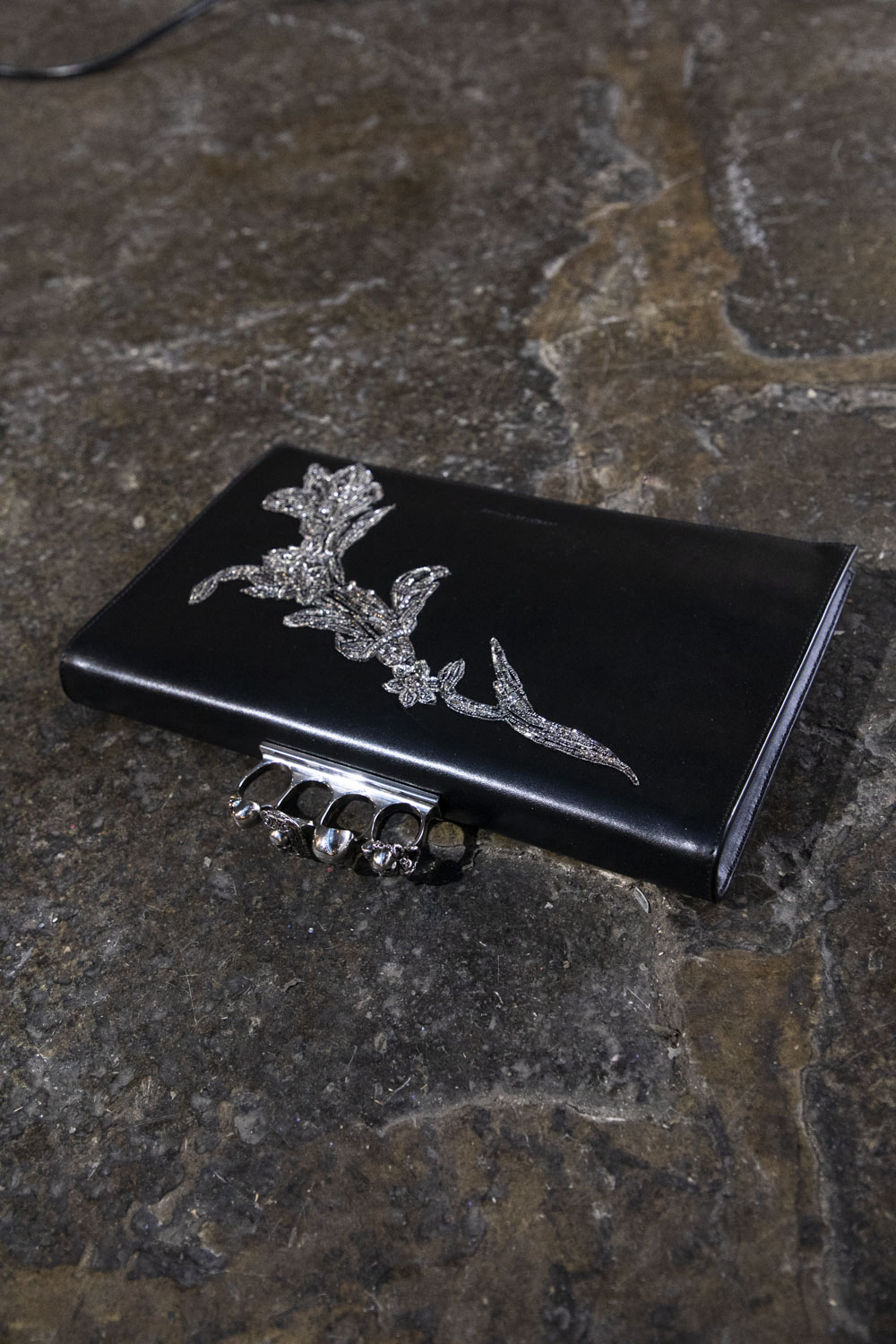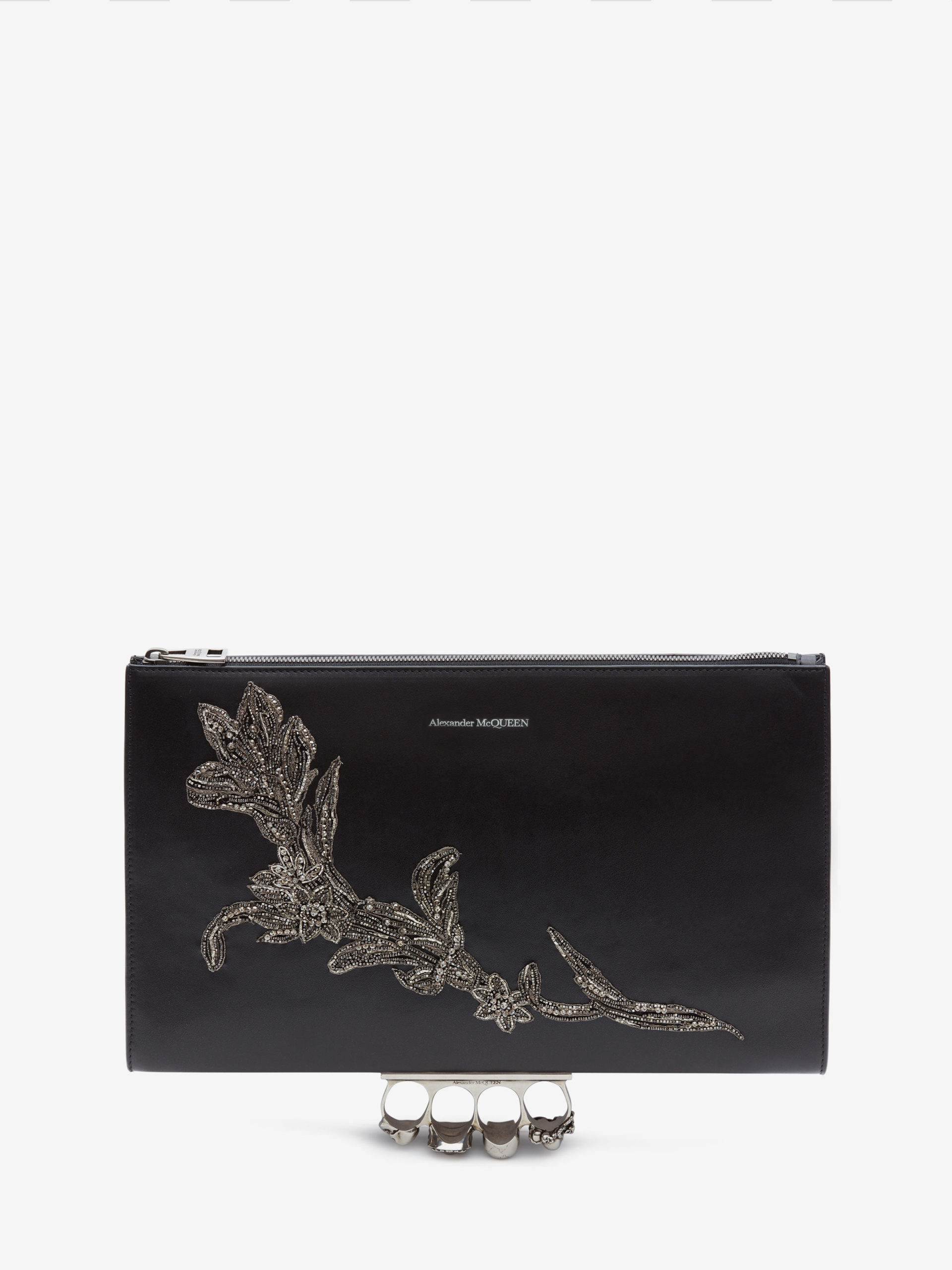 Une évolution de l’emblématique pochette McQueen à quatre anneaux pour femme, ce sac structuré est confectionné en cuir embossé croco et en cuir lisse avec une broderie à ceinture fleurie.
