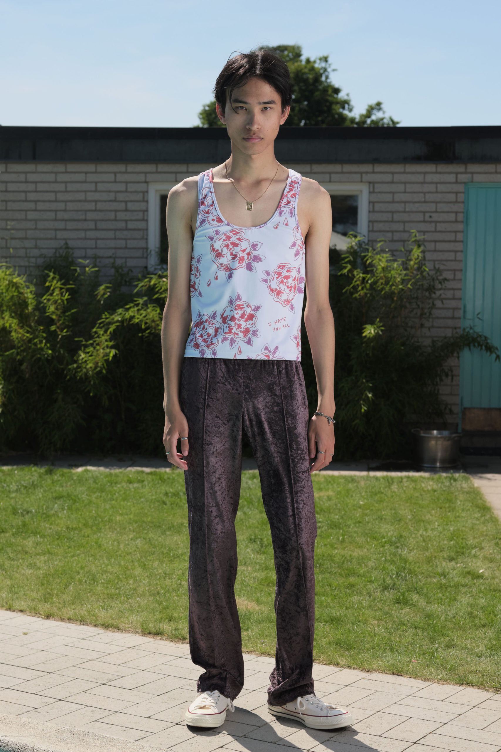 Cow-print ensembles, retro stripes and lurex glitter biker shorts underline the overall nostalgic vibe – while hand-dyed denim, sheer organza shirts and sequin applications add a touch of indulgence. We see the return of the iconic Lazoschmidl butterfy as well as a movie poster print by New York based photographer and painter Scott Csoke.