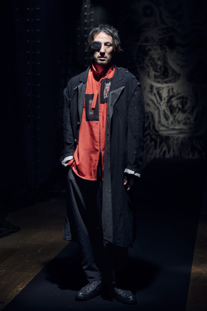 Soldiers uniforms for a Yohji army fighting the current world in crises. Global warming, social mo- vements, sanitary emergencies, animal protection. Yohji Yamamoto express his feelings in his own poetic way. Eyes printed on clothes as witnesses of what is happening today in our world and also looking into the future.