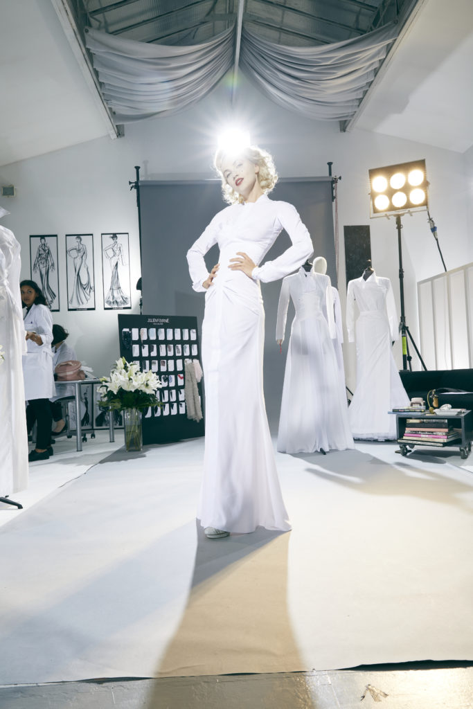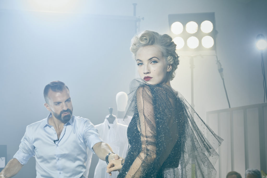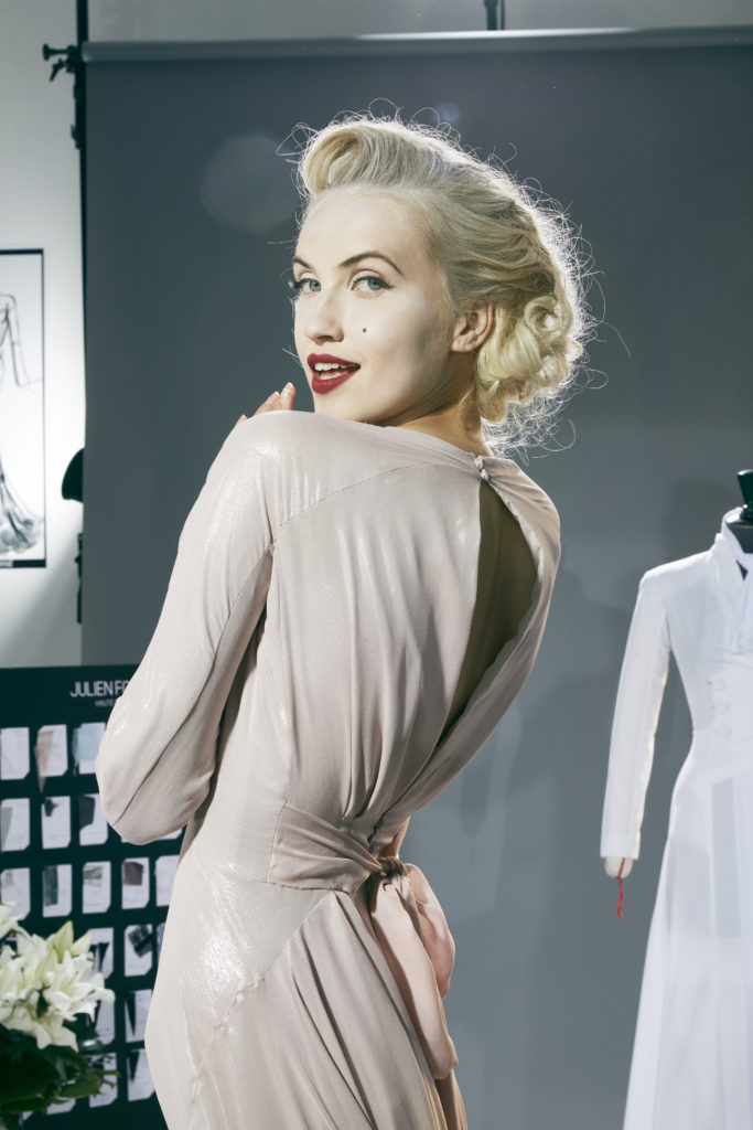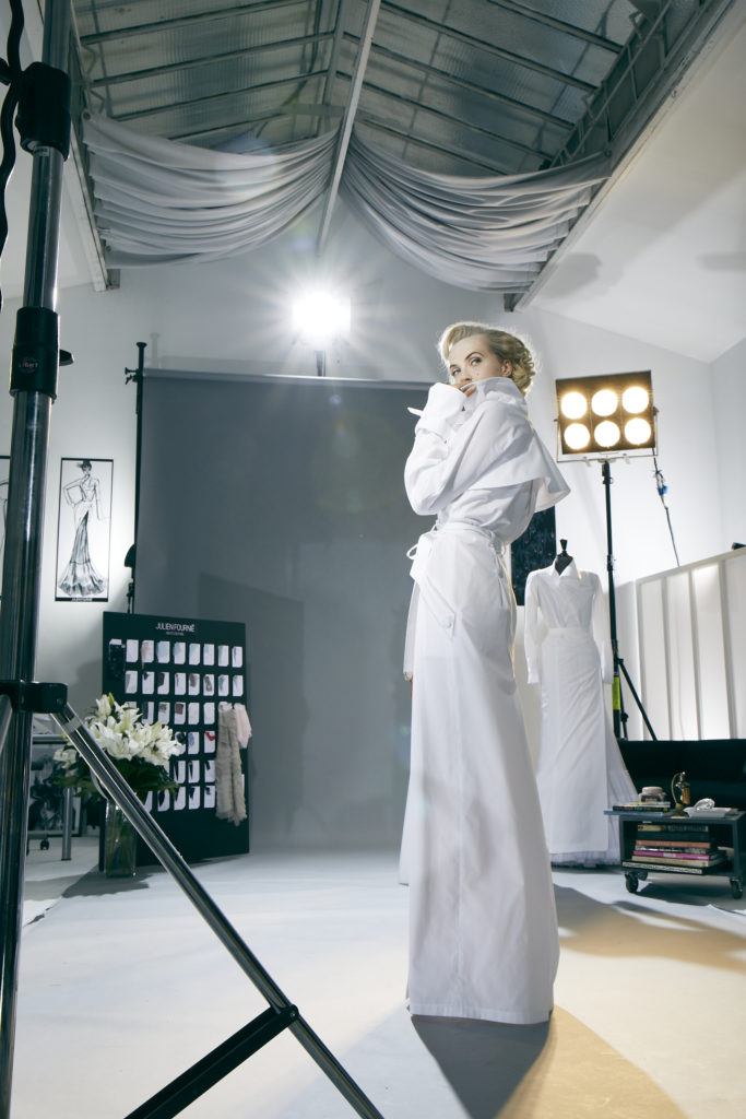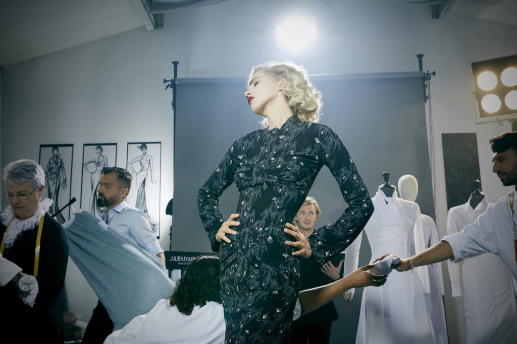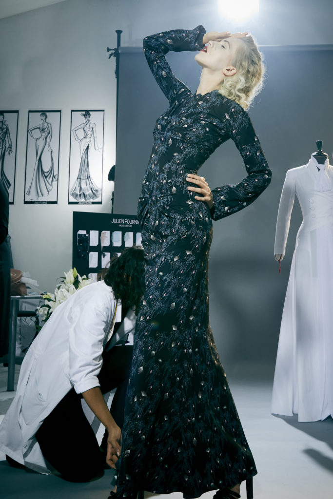 Avec cet essayage de la «toile», , Julien Fournié vérifie alors la coupe parfaite pour chaque silhouette. Ce n’est qu’alors, en collaboration avec la cliente, que Julien Fournié choisit le bon tissu, sa texture, son toucher et bien sûr sa couleur précise, les finitions exactes, les embellissements magiques ….