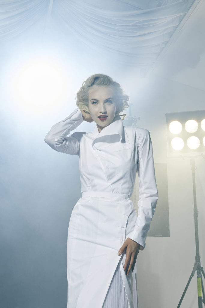 Vous voyez d’abord une esquisse du look imaginé. Après avoir passé votre commande, vous effectuerez un premier essayage, sur un prototype réalisé dans un tissu blanc uni et simple.