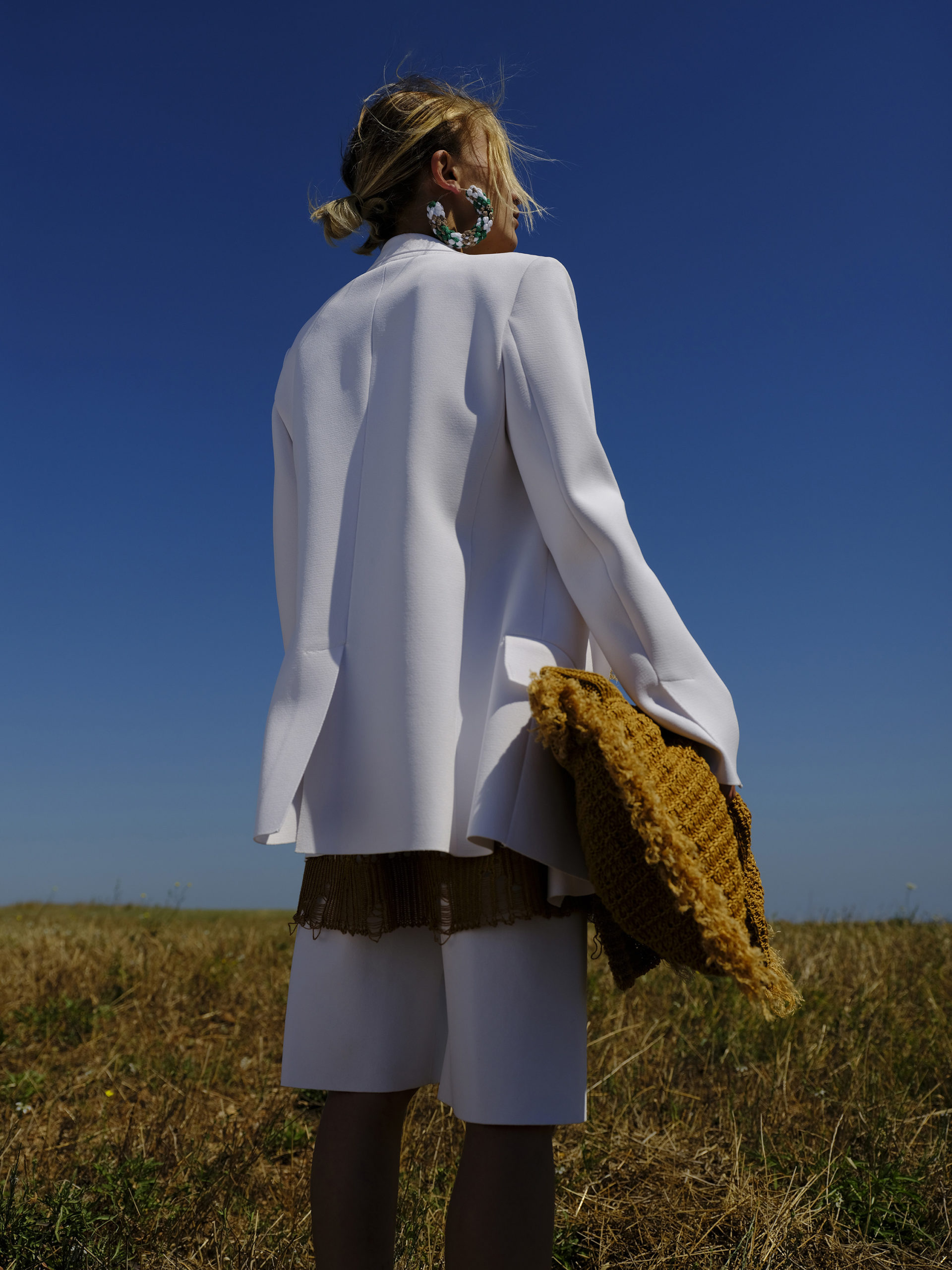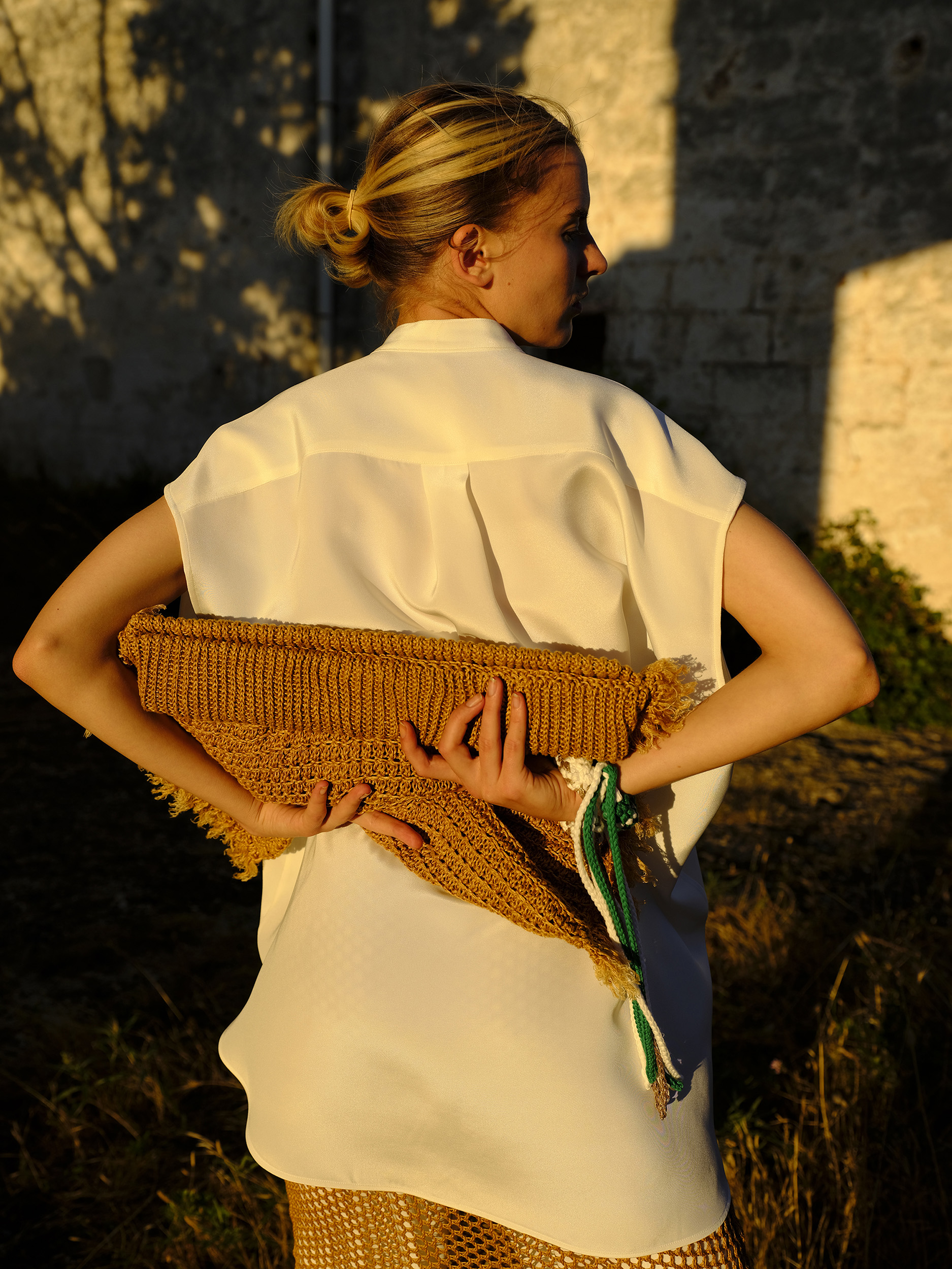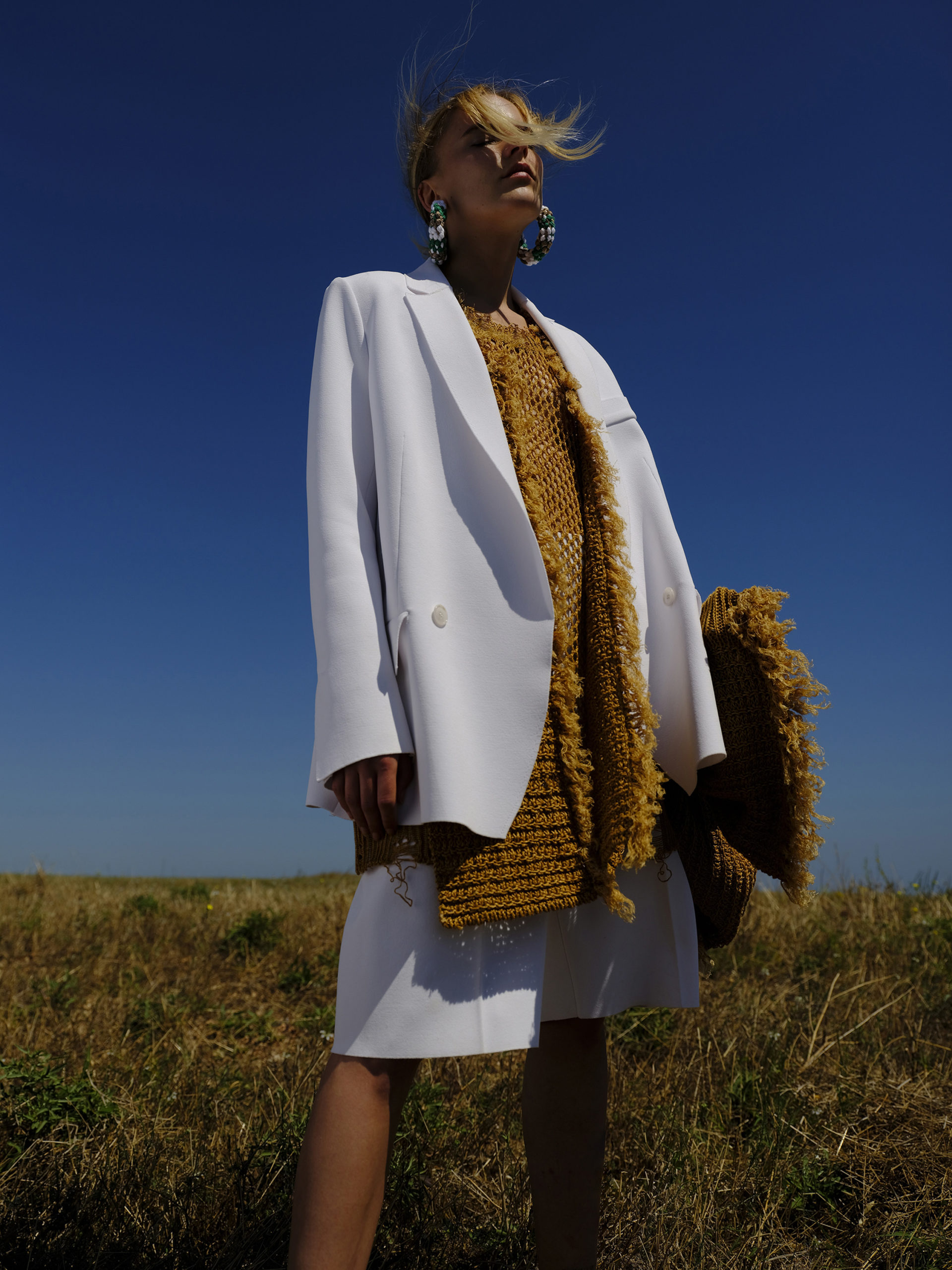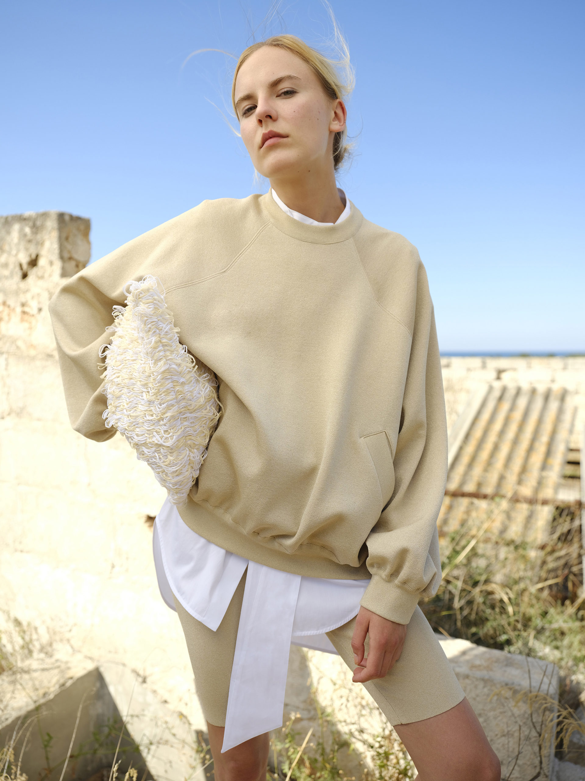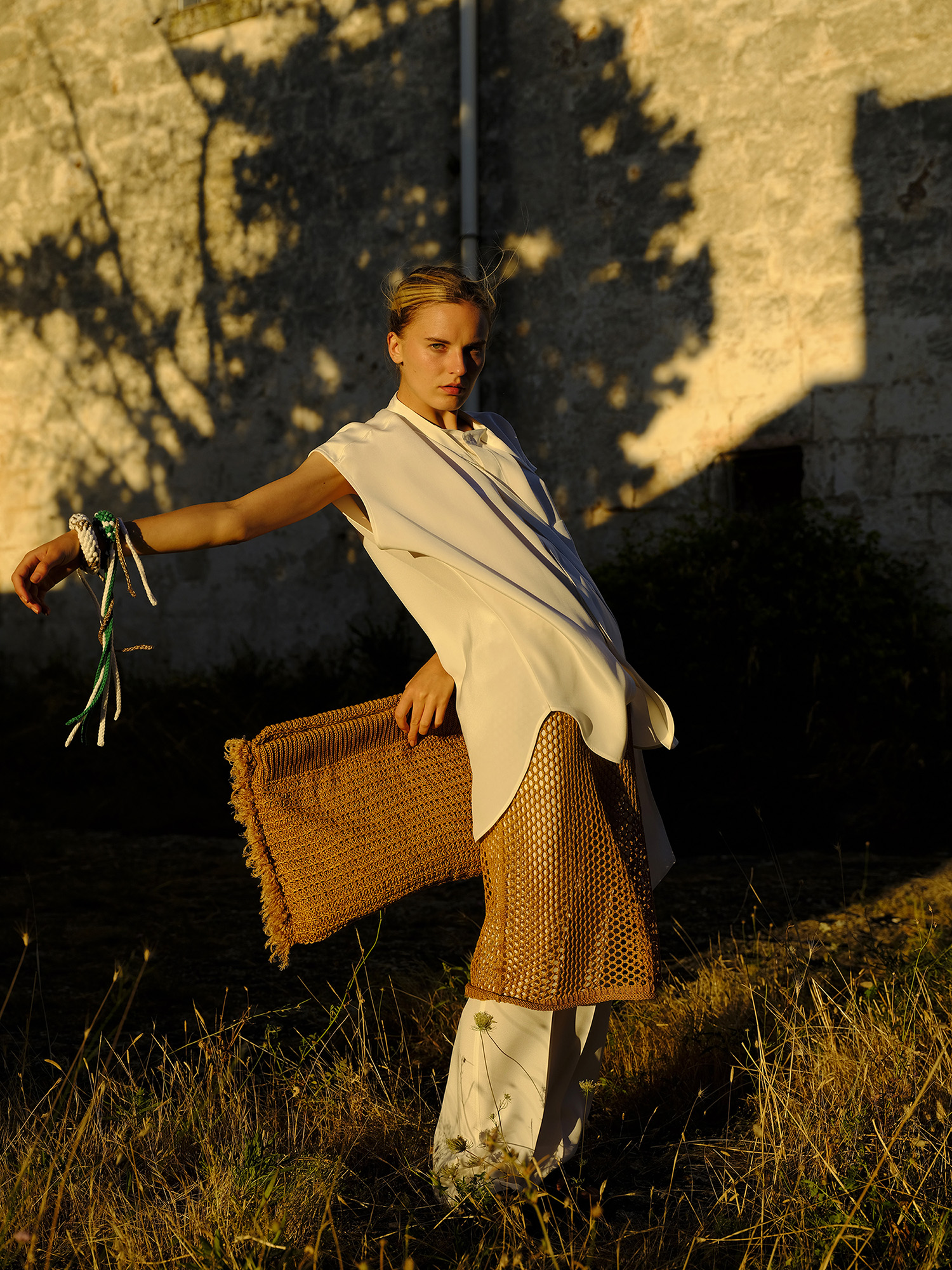 Simona Marziali presents a collection on the edge of contrasts, between rigor and creativity, between past and present: drawing inspiration from the works of Alberto Burri. The MRZ Spring/Summer 2021 Collection combines urban style with a rural dimension, at the origins of the matter, creating a contemporary elegance full of visual contrasts, starting from the choice of heterogeneous materials. In an imaginary atmosphere, the essential and minimalist design merges with folk references, creating a chorus of dissonances that coexist in perfect harmony with each other. The Simona Marziali’s expressive language is inspired by the famous series « I Sacchi » by Alberto Burri, master of matter and informal painting. Following the example of the great Umbrian artist, the designer evokes the vitality, the strength of the matter, the symbolic power of the essential simplicity obtained with the display of different materials, only apparently juxtaposed randomly. Simona Marziali pays particular attention to the representation of canvases composed of scraps of stitched, worn-out and frayed fabric, restoring the Burri’s emotional and poetic dimension through the use of simple and natural yarns – cotton and linen – combined with technical fibers and enhanced by elaborate manipulations. The collection Mannish cut knitted tailleur, return an oversized silhouette, never exaggerated, emblem of a contemporary femininity. Original workings interrupt the continuity of the surface and create a three-dimensionality with patterned, openwork and floating points. The rigor of the suits is contrasted by the knitwear, with a deliberately raw, unfinished appearance, which is enhanced, just like the matter of the worn-out jute pieces never hidden or confused with layers of color in Burri’s canvases. The collection is made up of a capsule linked to the world of sportswear, to underline the concept of a relaxed elegance with volumes taken to the extreme, but no less rigorous, according to the stylistic codes of MRZ. The abstract tones of Alberto Burri’s art can also be found in the used shades: optical white, milk, beige, gold and black are mostly used in a monochromatic way or treated in contrast. Hints of red and green embellish the whole. The collection follows a structural and balanced scheme of spaces, dimensions and relationships between the chromatic masses and, albeit in an unusual way, it determines accents with a classic taste, exploiting the diversity of materials and their surface and volumetric characteristics.
