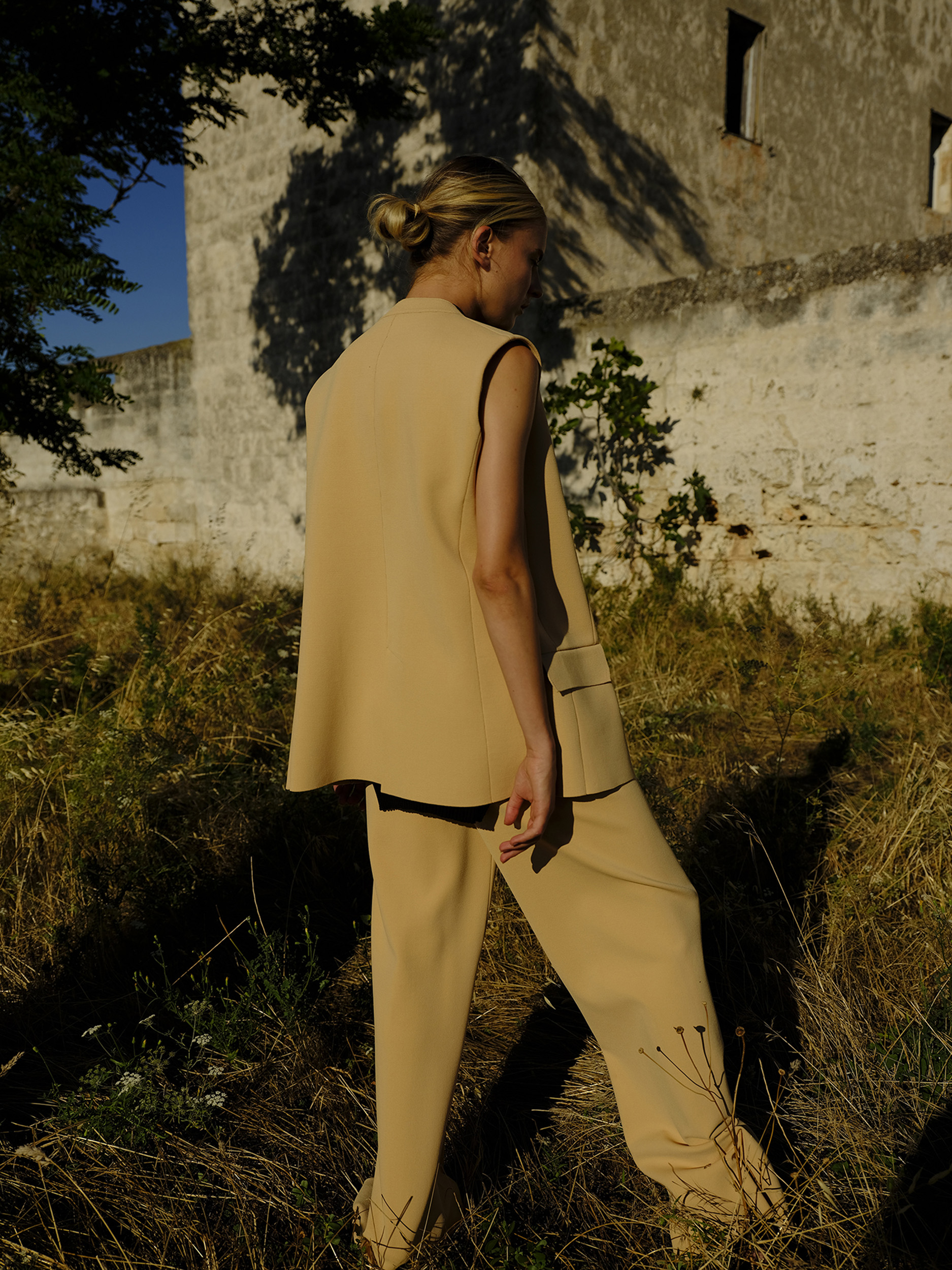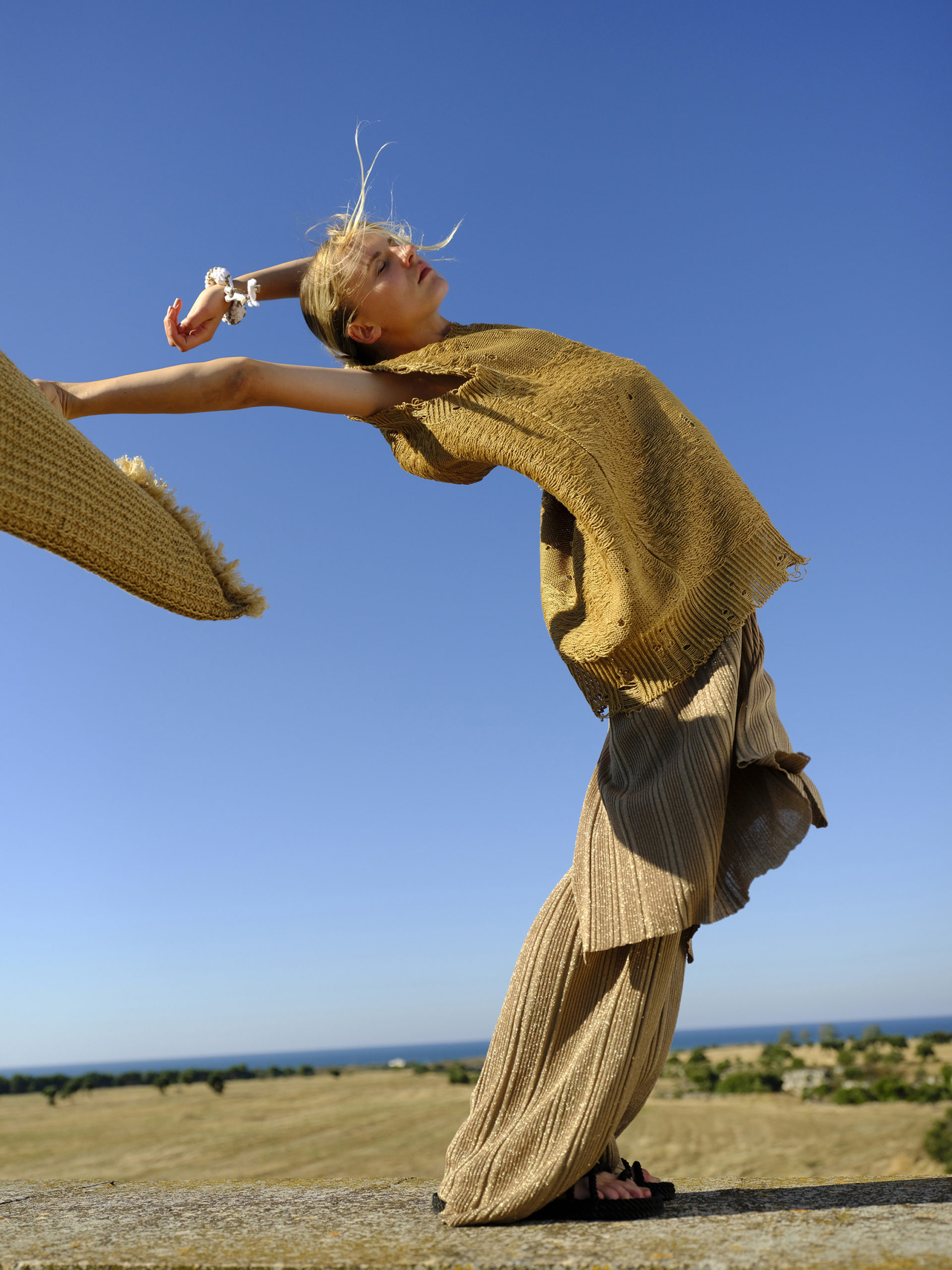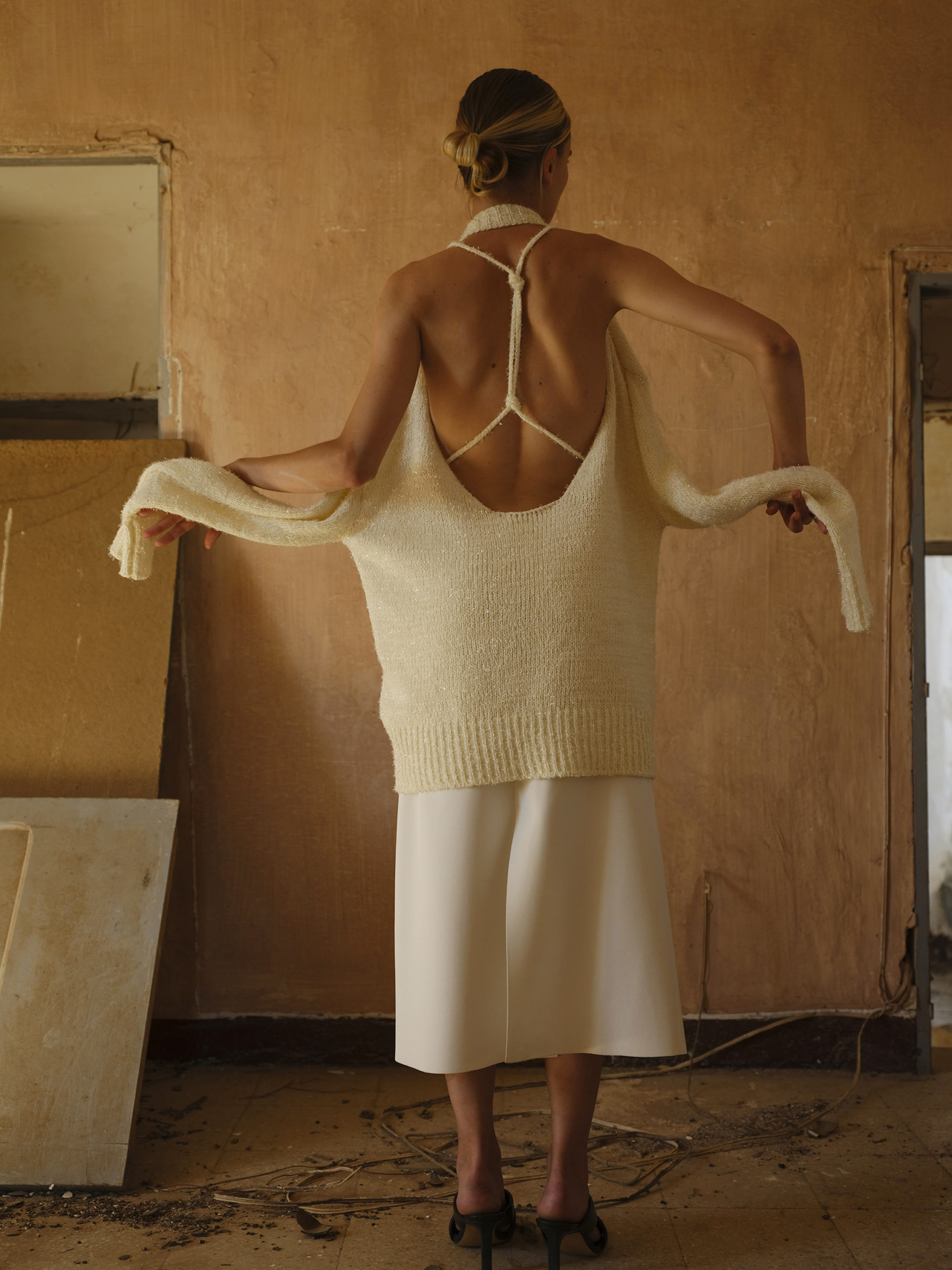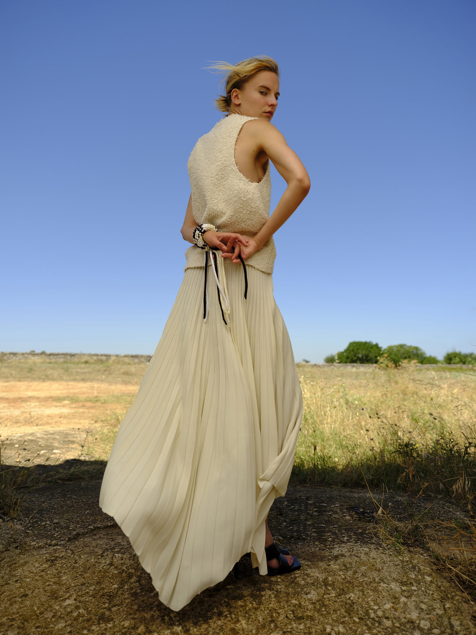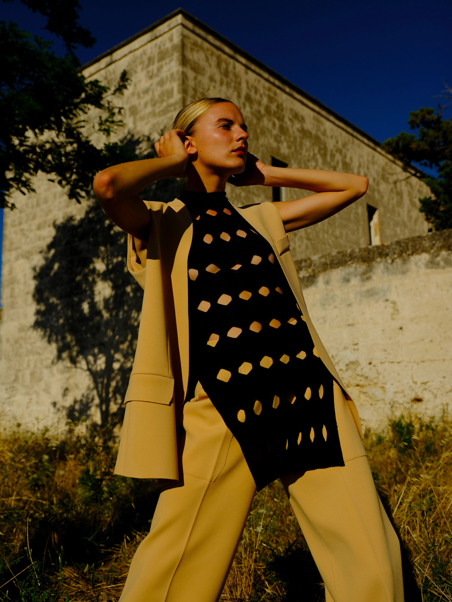 Simona Marziali presents a collection on the edge of contrasts, between rigor and creativity, between past and present: drawing inspiration from the works of Alberto Burri. The MRZ Spring/Summer 2021 Collection combines urban style with a rural dimension, at the origins of the matter, creating a contemporary elegance full of visual contrasts, starting from the choice of heterogeneous materials. In an imaginary atmosphere, the essential and minimalist design merges with folk references, creating a chorus of dissonances that coexist in perfect harmony with each other. The Simona Marziali’s expressive language is inspired by the famous series « I Sacchi » by Alberto Burri, master of matter and informal painting. Following the example of the great Umbrian artist, the designer evokes the vitality, the strength of the matter, the symbolic power of the essential simplicity obtained with the display of different materials, only apparently juxtaposed randomly. Simona Marziali pays particular attention to the representation of canvases composed of scraps of stitched, worn-out and frayed fabric, restoring the Burri’s emotional and poetic dimension through the use of simple and natural yarns – cotton and linen – combined with technical fibers and enhanced by elaborate manipulations. The collection Mannish cut knitted tailleur, return an oversized silhouette, never exaggerated, emblem of a contemporary femininity. Original workings interrupt the continuity of the surface and create a three-dimensionality with patterned, openwork and floating points. The rigor of the suits is contrasted by the knitwear, with a deliberately raw, unfinished appearance, which is enhanced, just like the matter of the worn-out jute pieces never hidden or confused with layers of color in Burri’s canvases. The collection is made up of a capsule linked to the world of sportswear, to underline the concept of a relaxed elegance with volumes taken to the extreme, but no less rigorous, according to the stylistic codes of MRZ. The abstract tones of Alberto Burri’s art can also be found in the used shades: optical white, milk, beige, gold and black are mostly used in a monochromatic way or treated in contrast. Hints of red and green embellish the whole. The collection follows a structural and balanced scheme of spaces, dimensions and relationships between the chromatic masses and, albeit in an unusual way, it determines accents with a classic taste, exploiting the diversity of materials and their surface and volumetric characteristics.