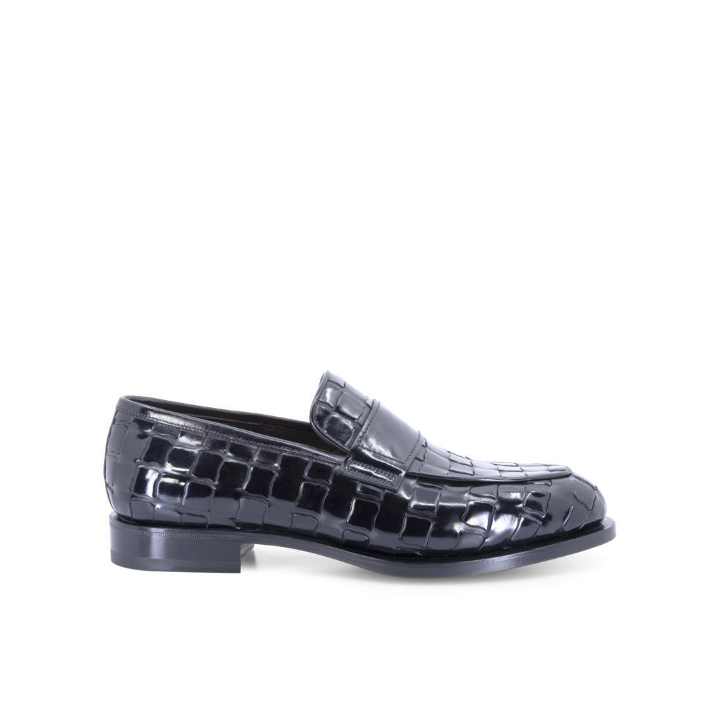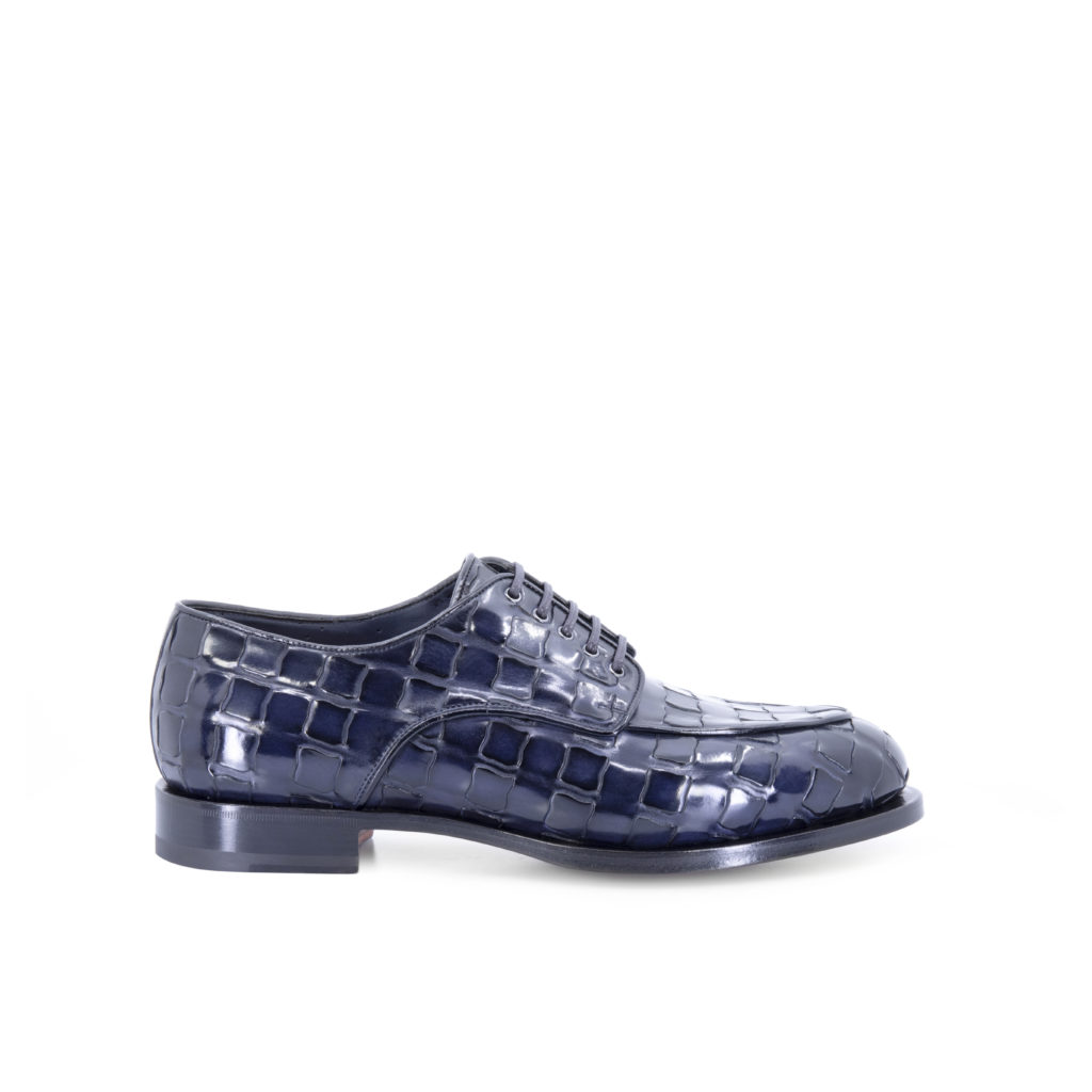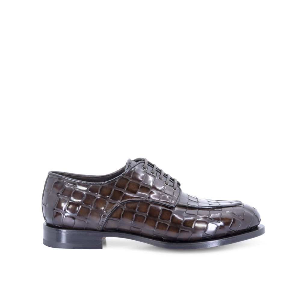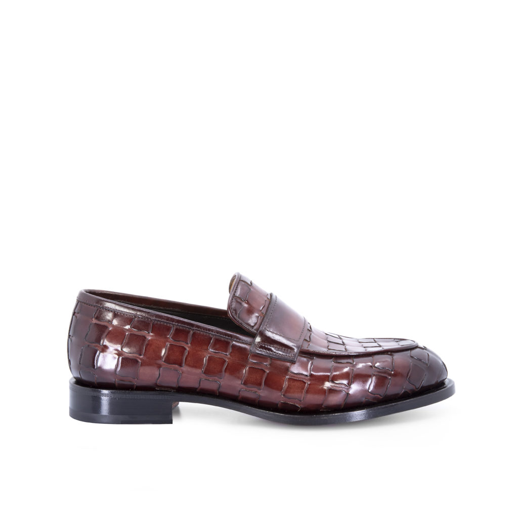 TRAMA est le point culminant du caractère distinctif du savoir-faire de Santoni : un motif entrelacé créé sur cuir de veau, nubuck et suède qui rappelle la texture du cuir d’alligator, donnant un effet tridimensionnel sophistiqué au produit.