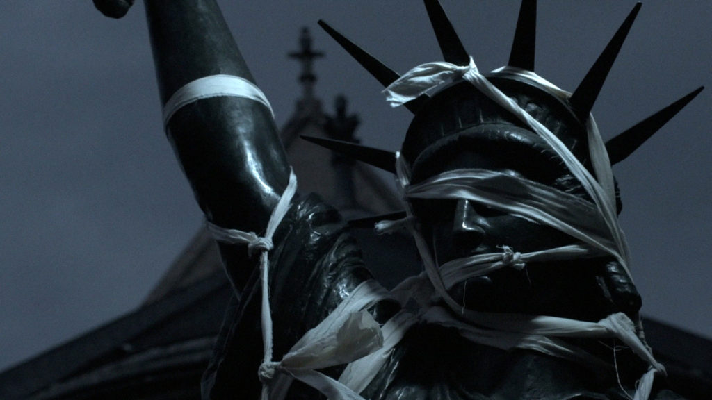 La statue de la Liberté apparaît ligotée, emballée, bâillonnée, tout un Symbole … Quant à la peste alias la COVID 19, elle est incarnée par Ophélia Kolb et Il Medico, par Alexandre Risso, alias le corps médical, à qui nous ne pouvons que rendre hommage.