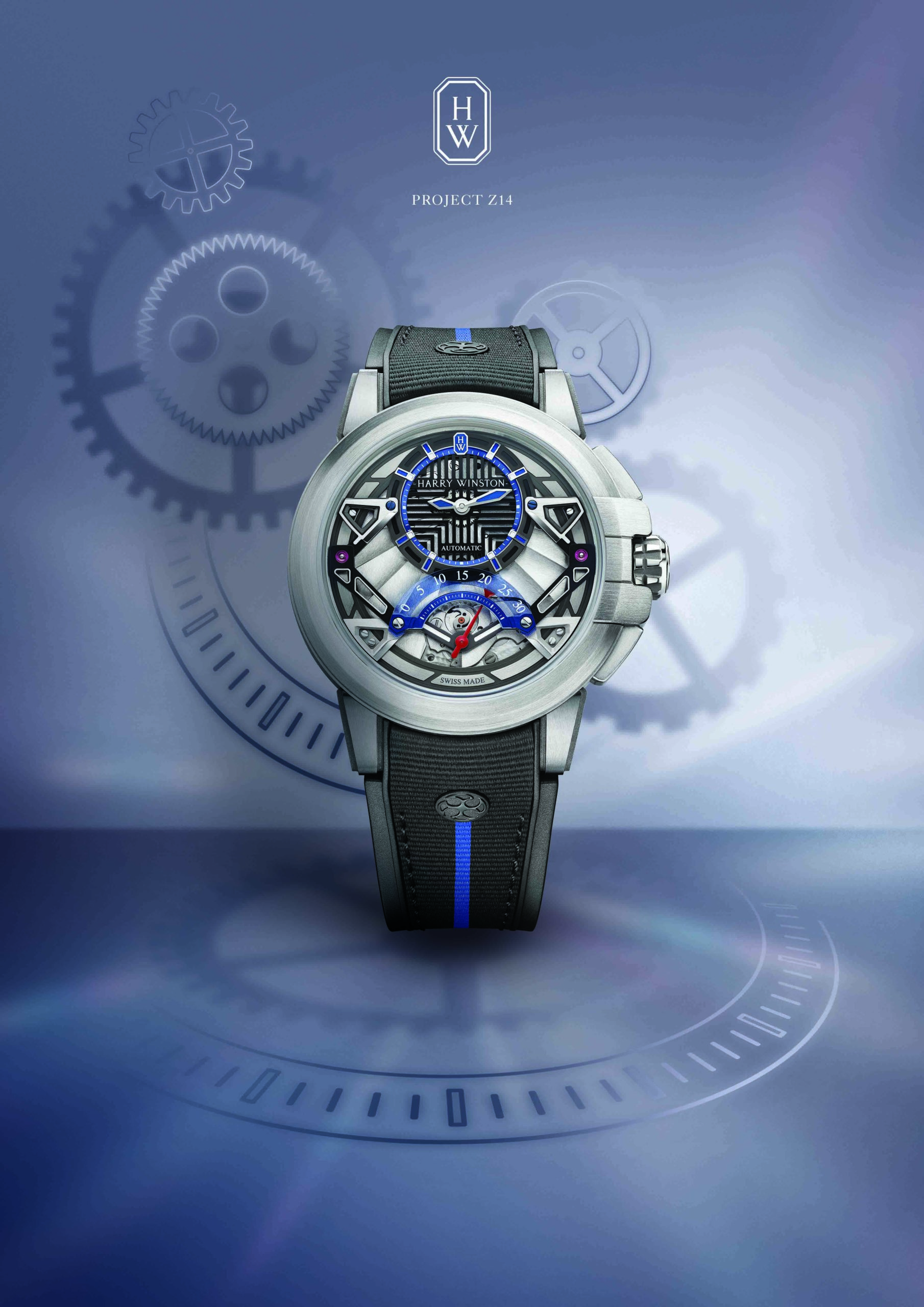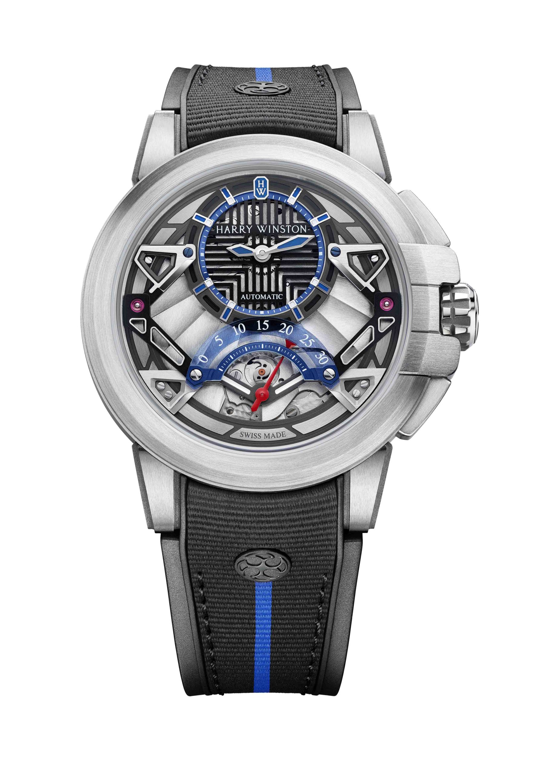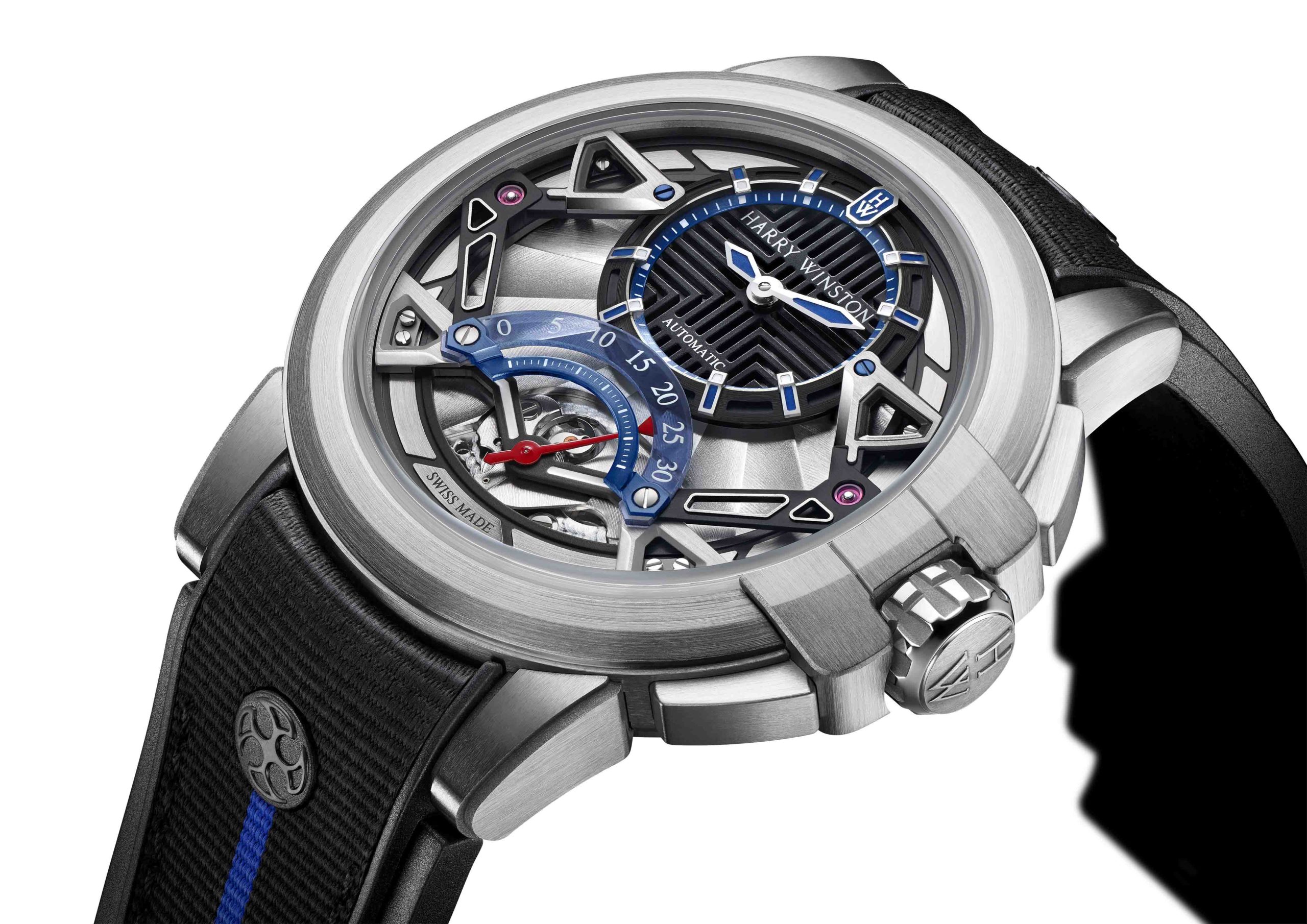 Le 14e garde-temps à rejoindre la surprenante série Project Z d’Harry Winston se distingue par son architecture moderne, ses matériaux innovants et par le fascinant spectacle de ses secondes rétrogrades. La boîte ultra légère en Zalium de la Project Z14 affiche un compteur des secondes rétrogrades bleu transparent gradué jusqu’à 30, un compteur des heures et des minutes excentré, ainsi qu’une nouvelle structure ajourée. La complication des secondes rétrogrades est bel et bien la star de ce garde-temps, avec son aiguille rouge qui, une fois arrivée à 30, effectue un subtil saut dans le sens antihoraire pour revenir à zéro. Les finitions de la boîte de 42.2 mm rejoignent celles appliqués au cardan avec des facettes, chanfreins. Project Z14 est équipée du calibre HW2202, un mouvement mécanique automatique possédant un rotor en or blanc.