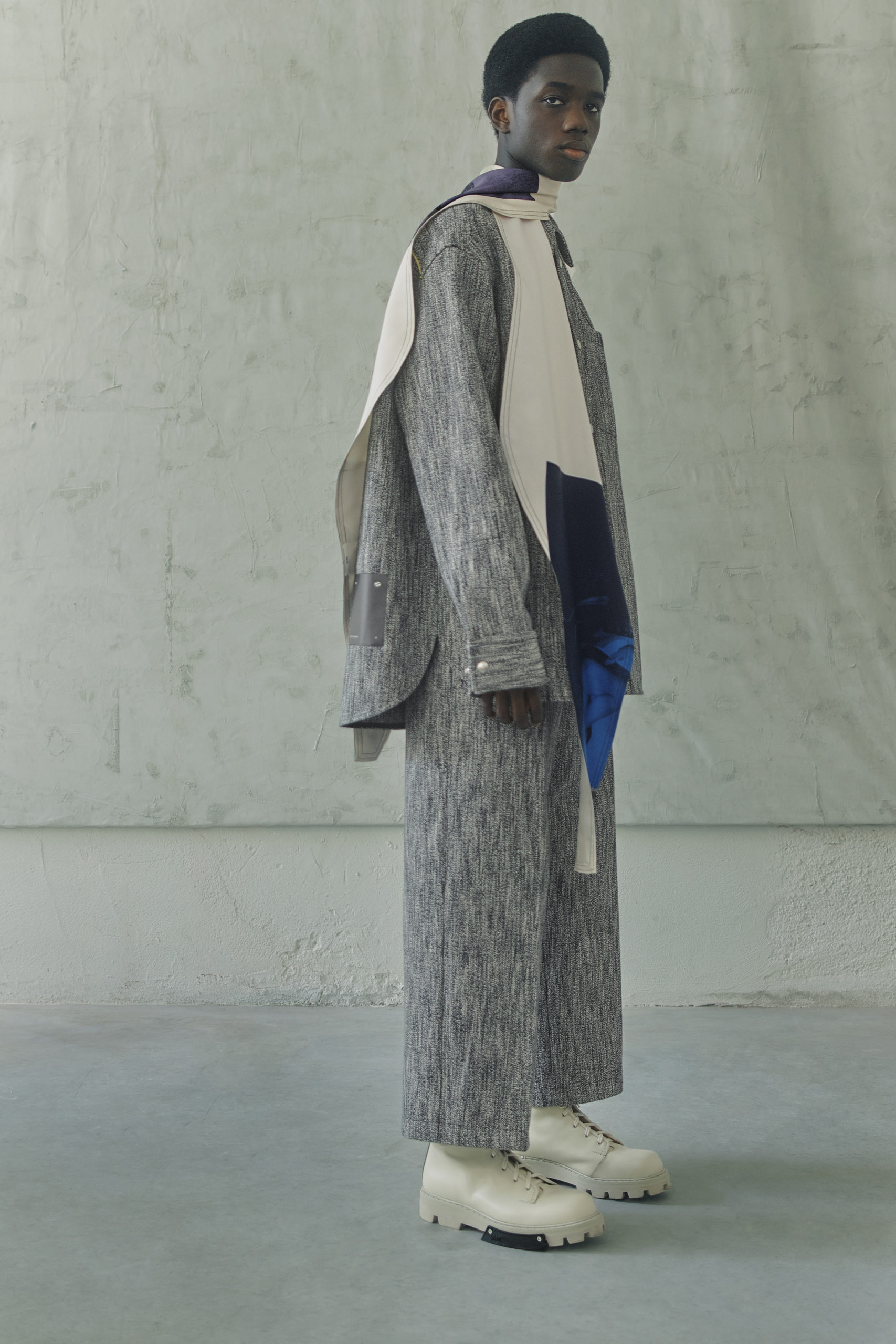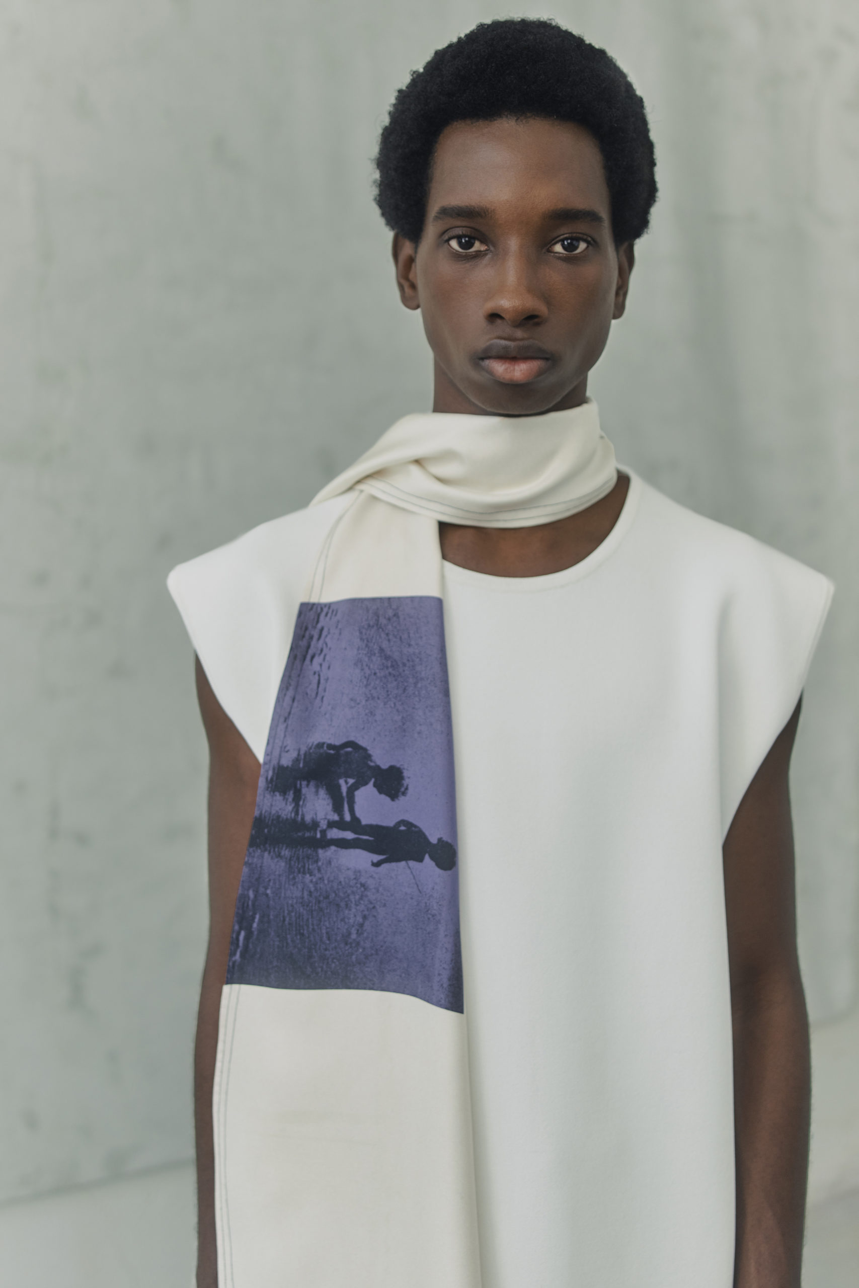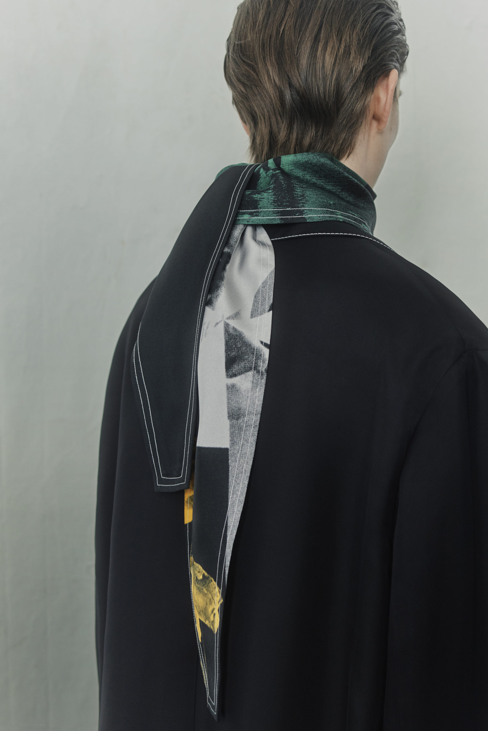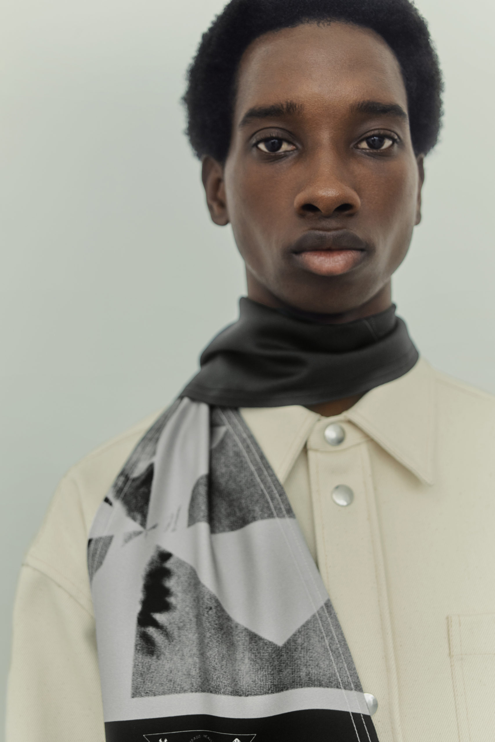 However, as the collection, mood, and circumstance developed, it was important to balance. To create a feeling of lightness, of hope, of positivity. Softer, more _uid fabrics were included and cut into coats, shirts, and trousers. Long, shaped foulards added an elegance and a sophistication.