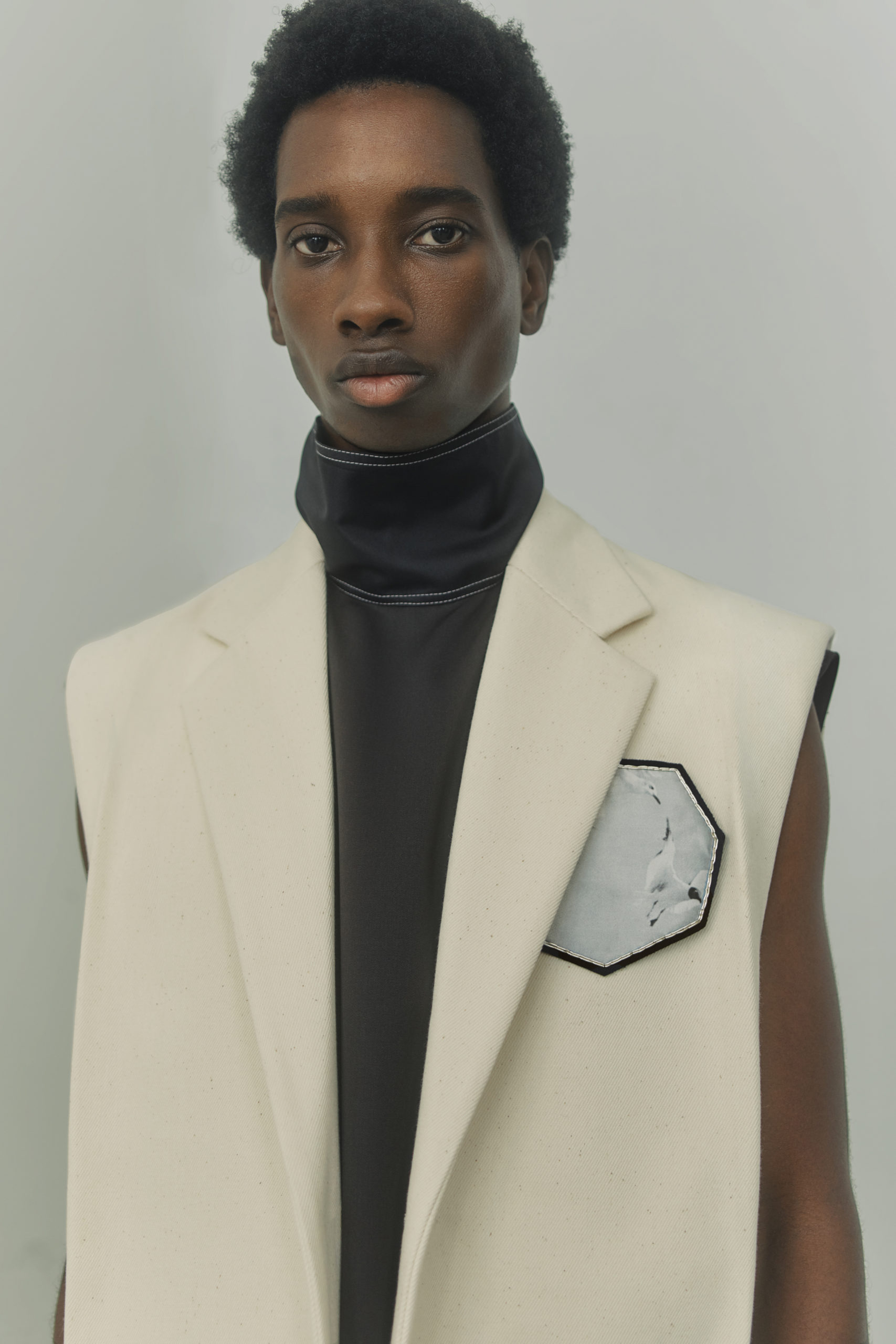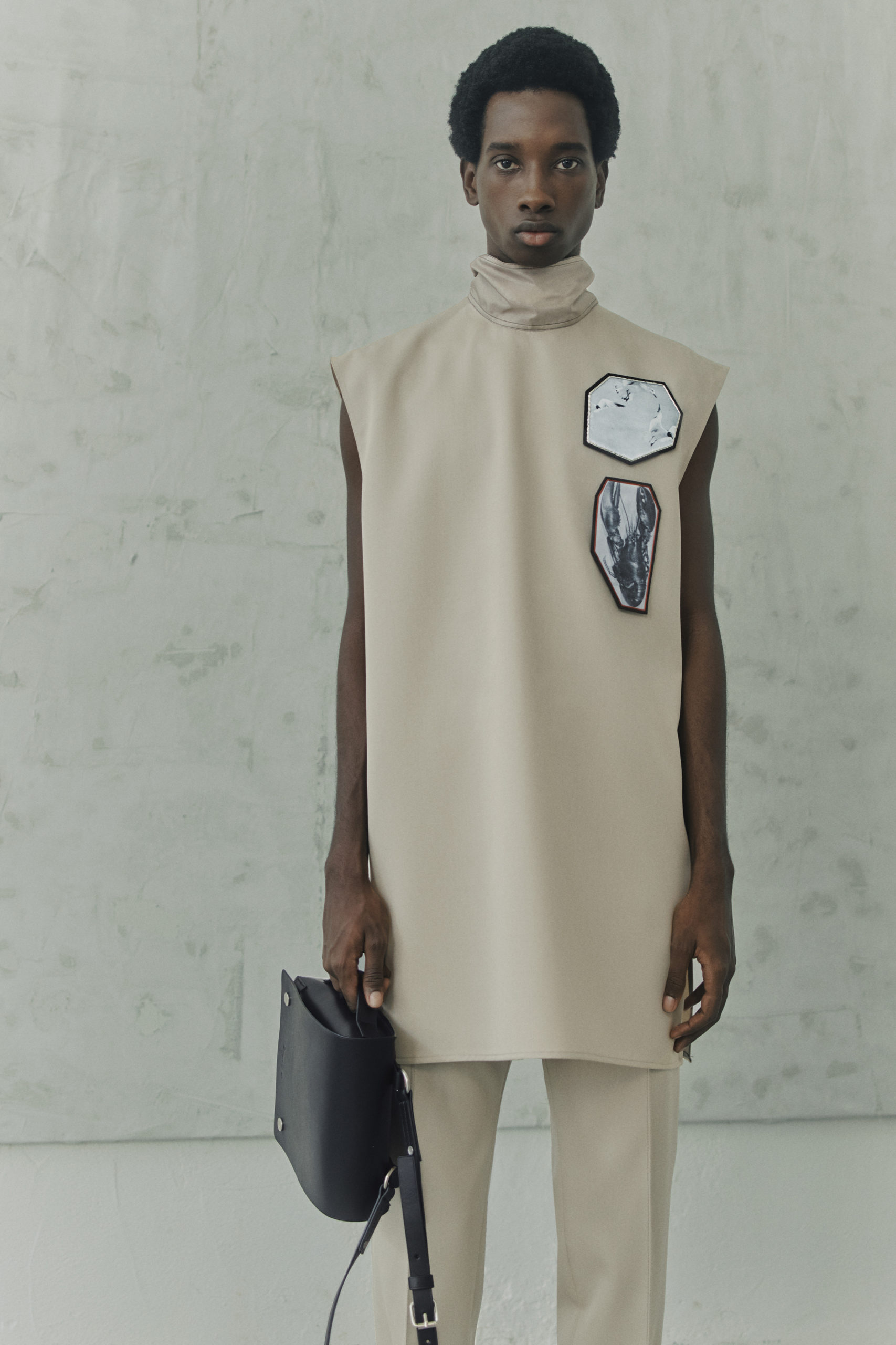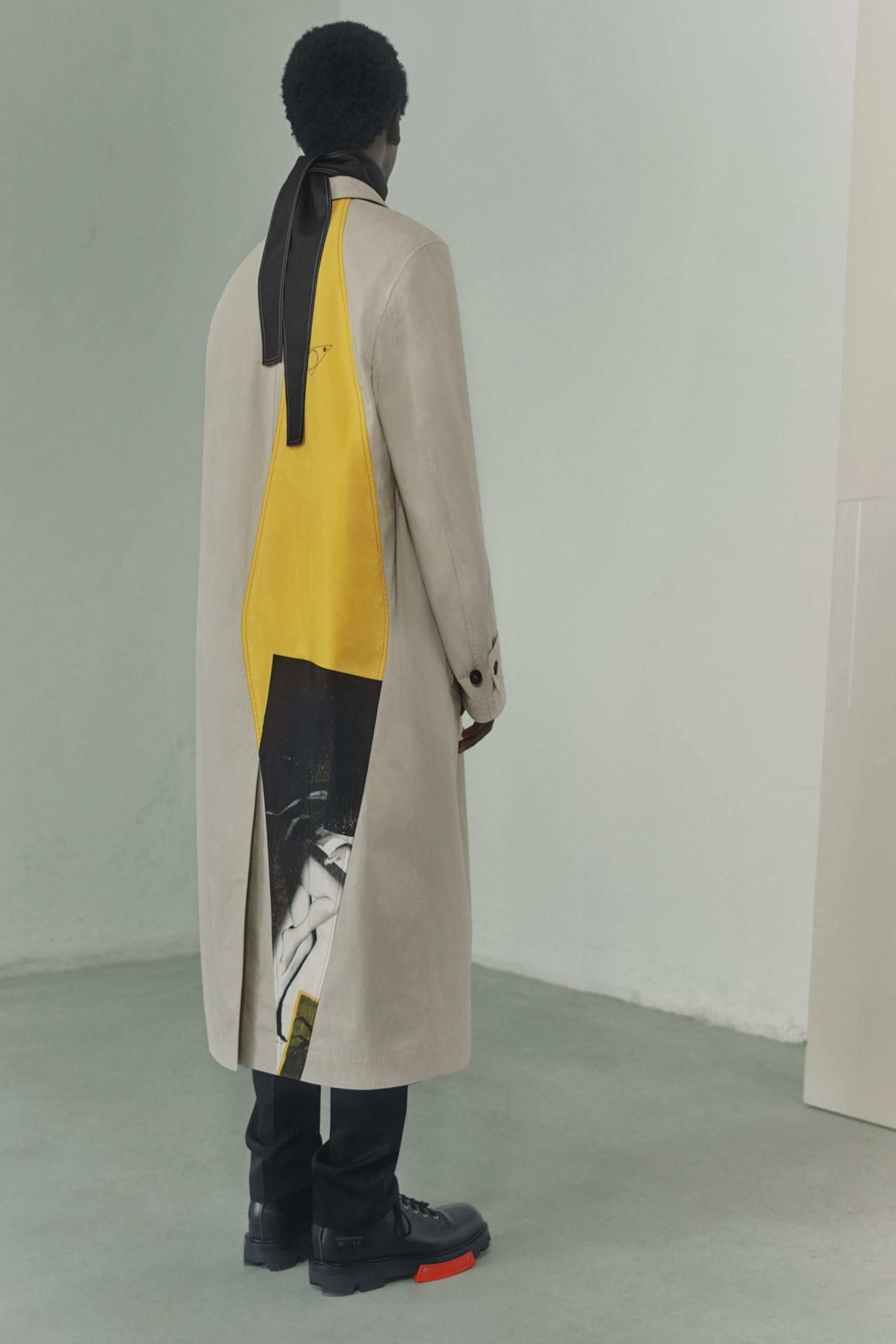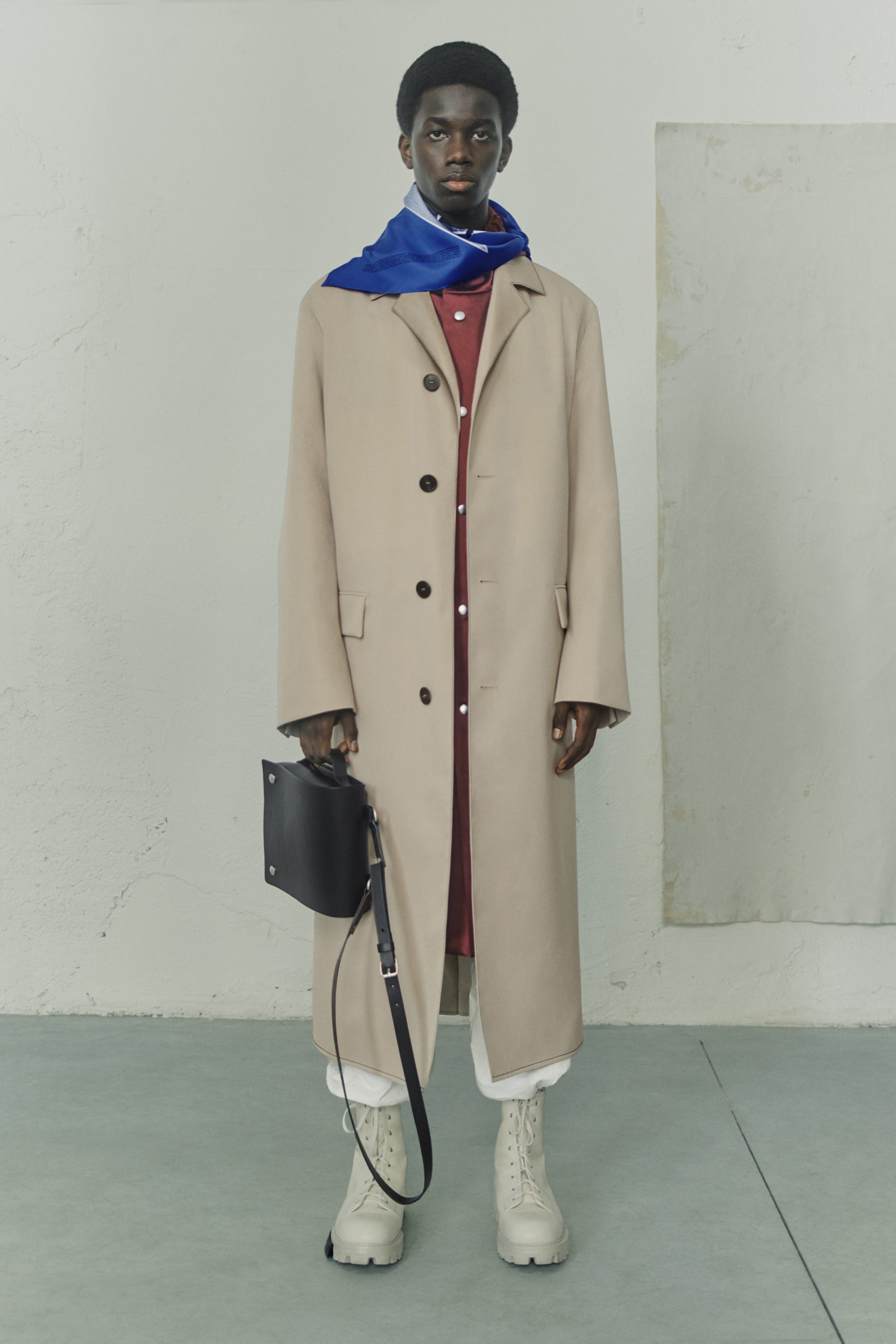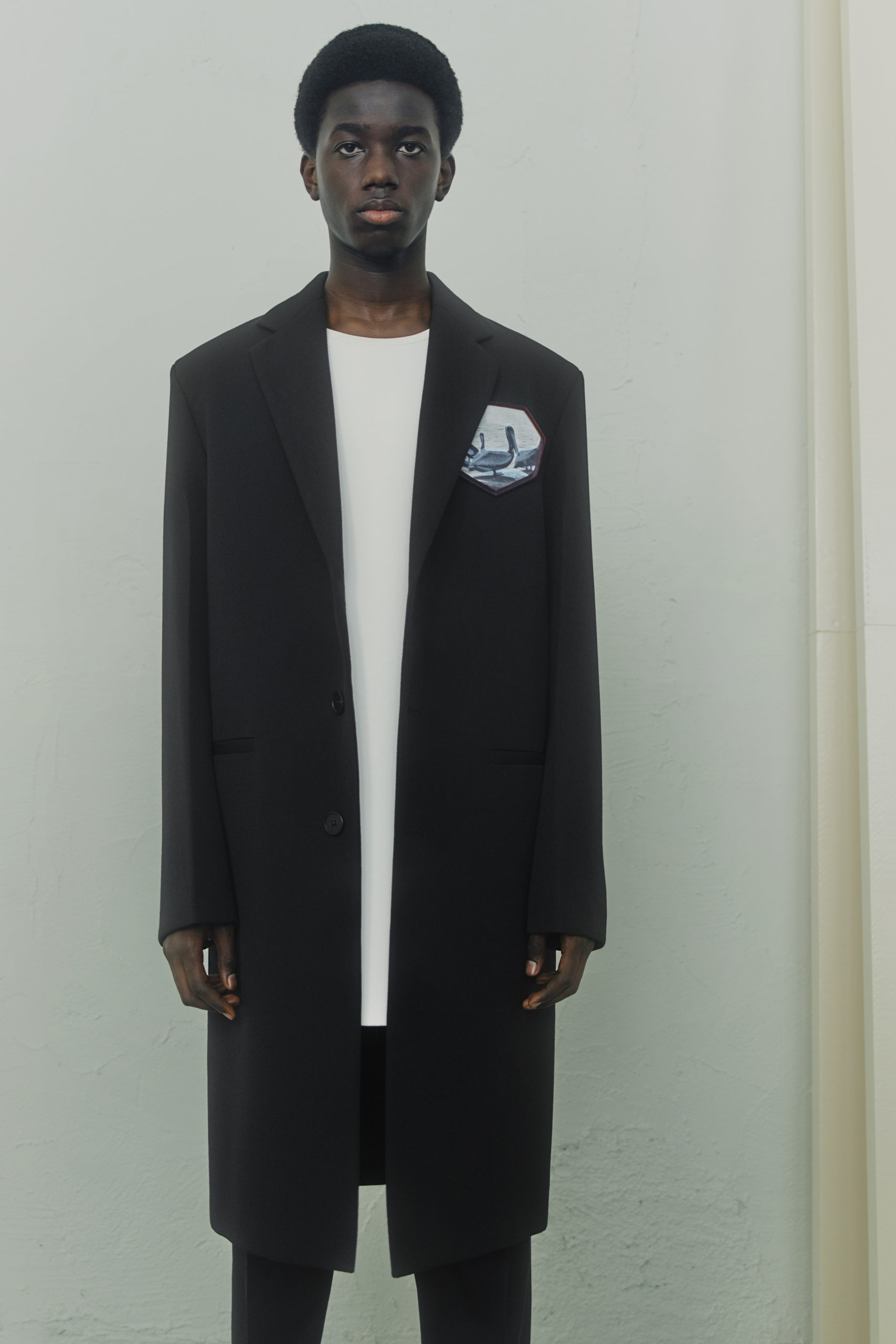 However, as the collection, mood, and circumstance developed, it was important to balance. To create a feeling of lightness, of hope, of positivity. Softer, more _uid fabrics were included and cut into coats, shirts, and trousers. Long, shaped foulards added an elegance and a sophistication.