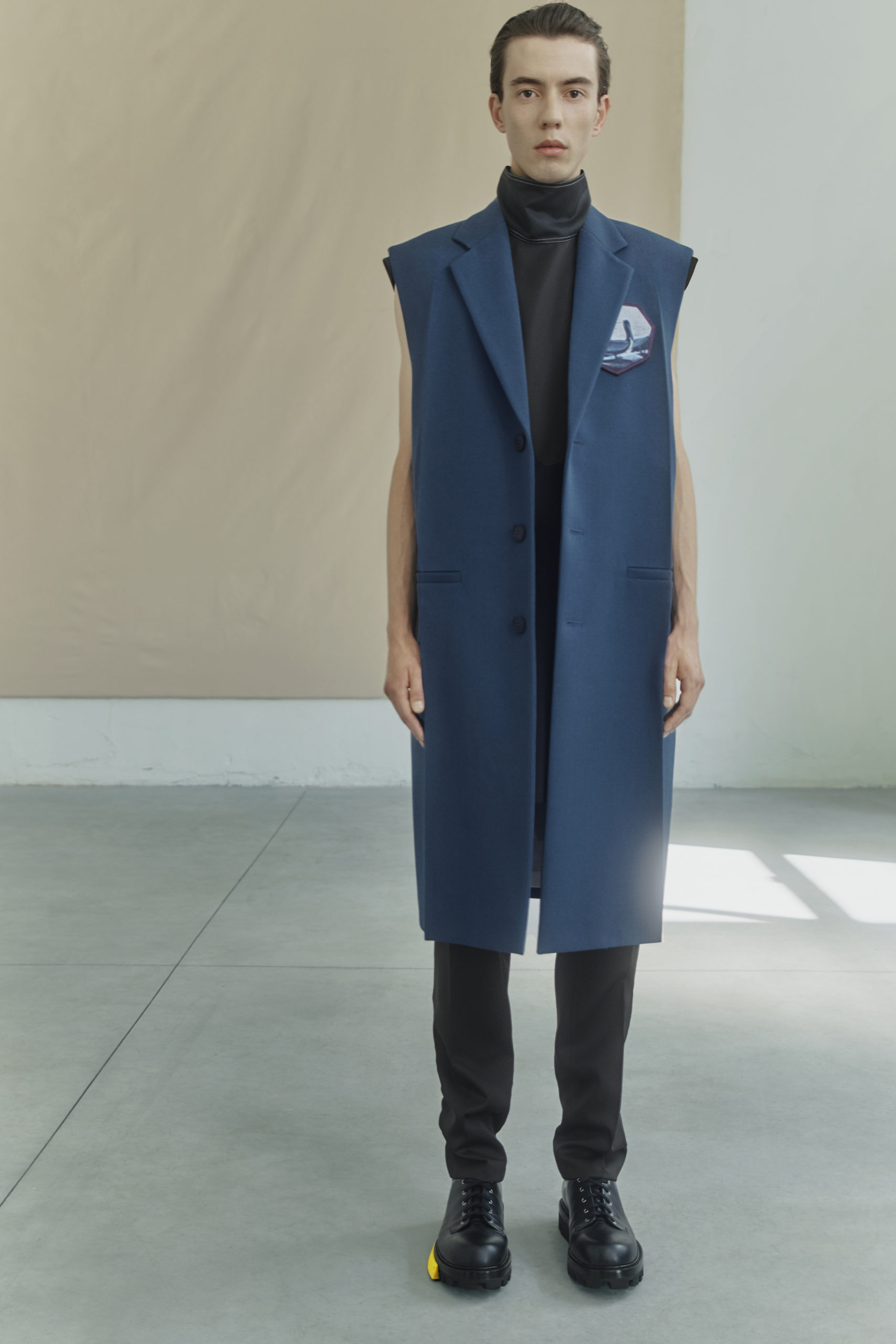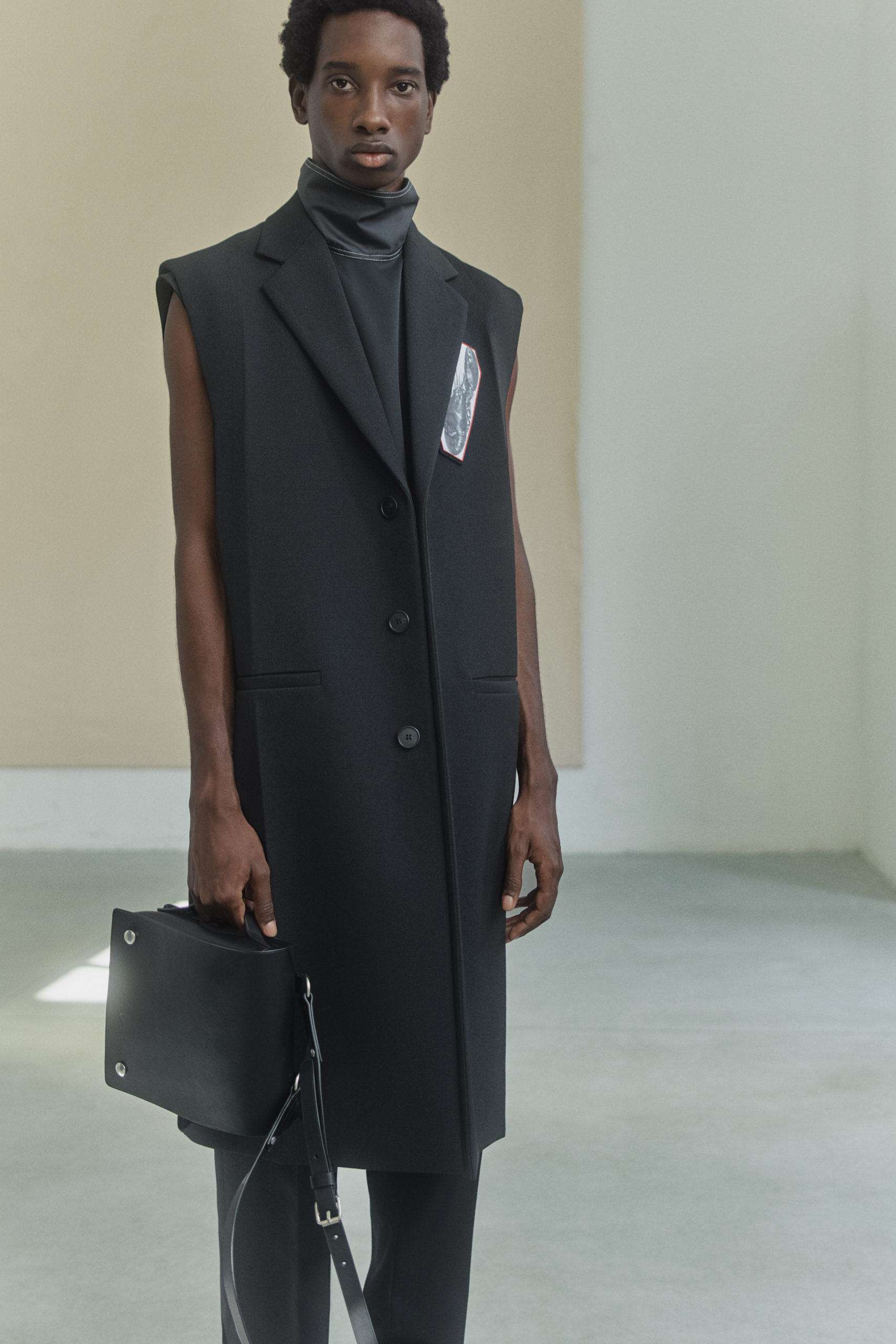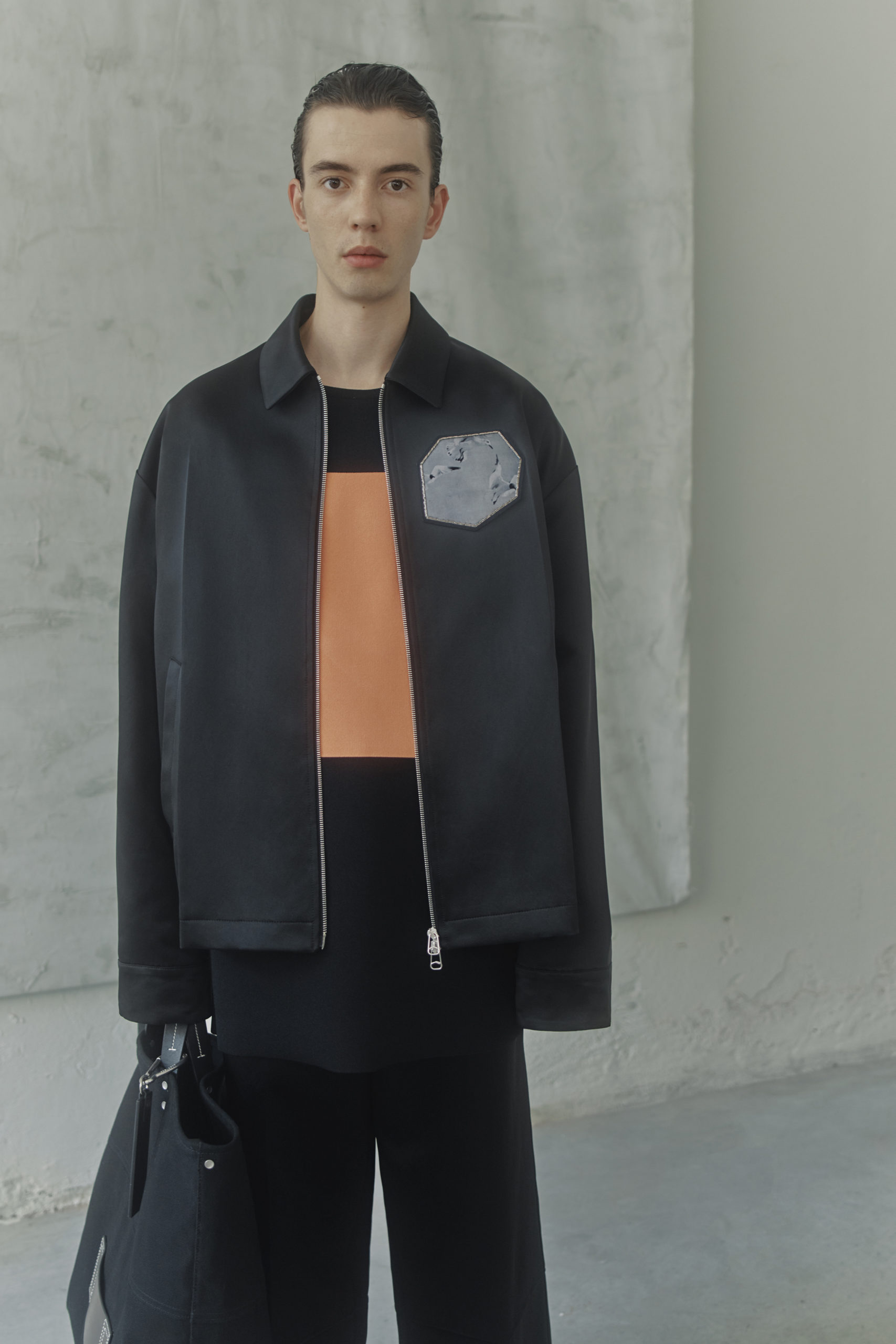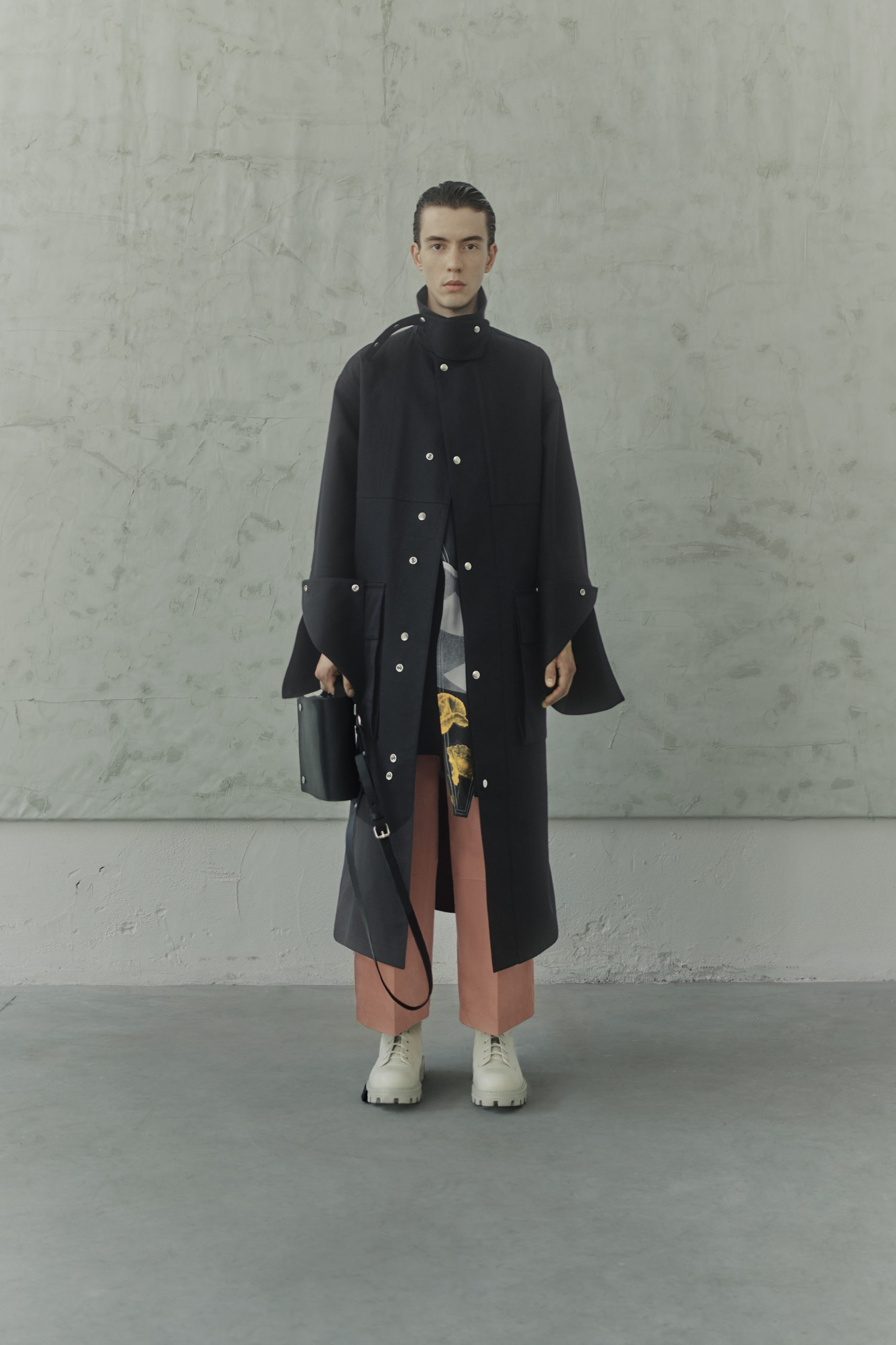 However, as the collection, mood, and circumstance developed, it was important to balance. To create a feeling of lightness, of hope, of positivity. Softer, more _uid fabrics were included and cut into coats, shirts, and trousers. Long, shaped foulards added an elegance and a sophistication.