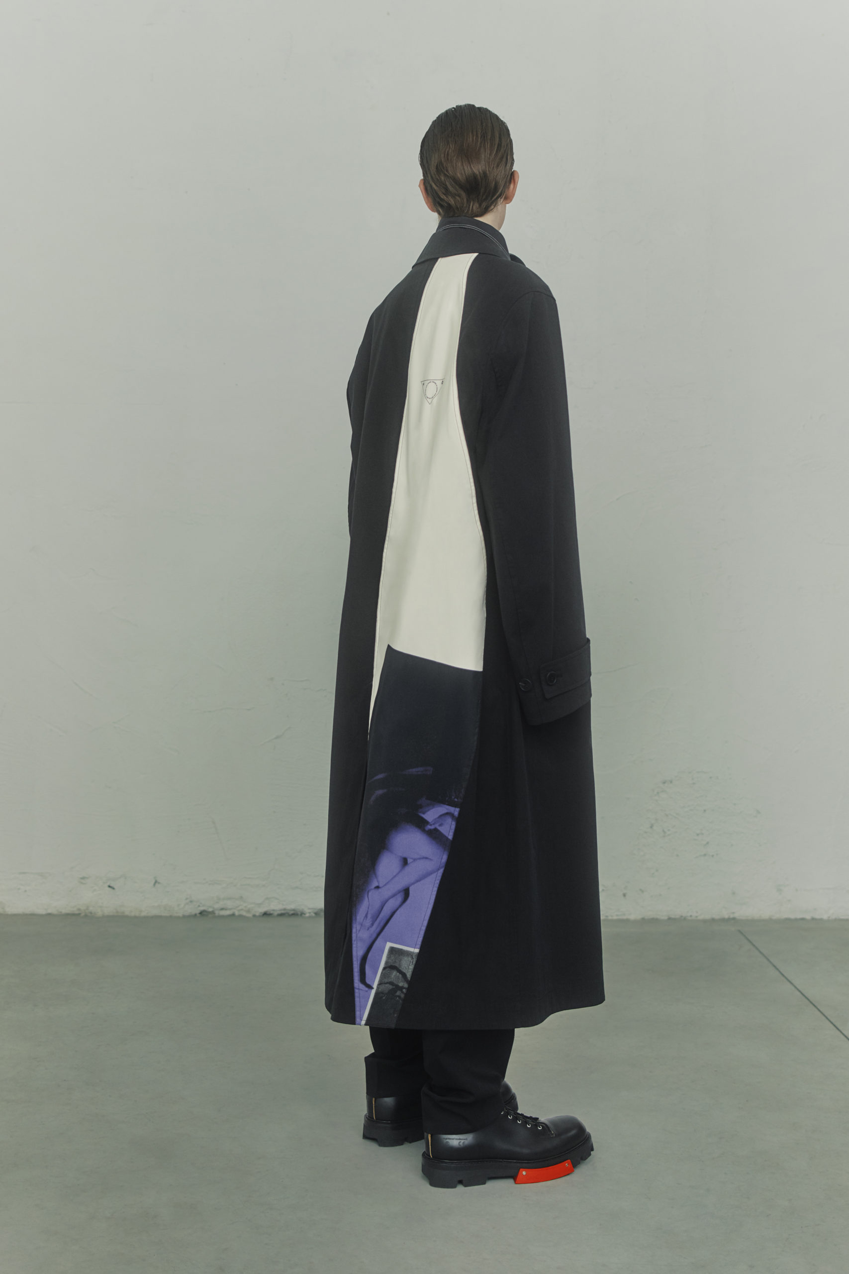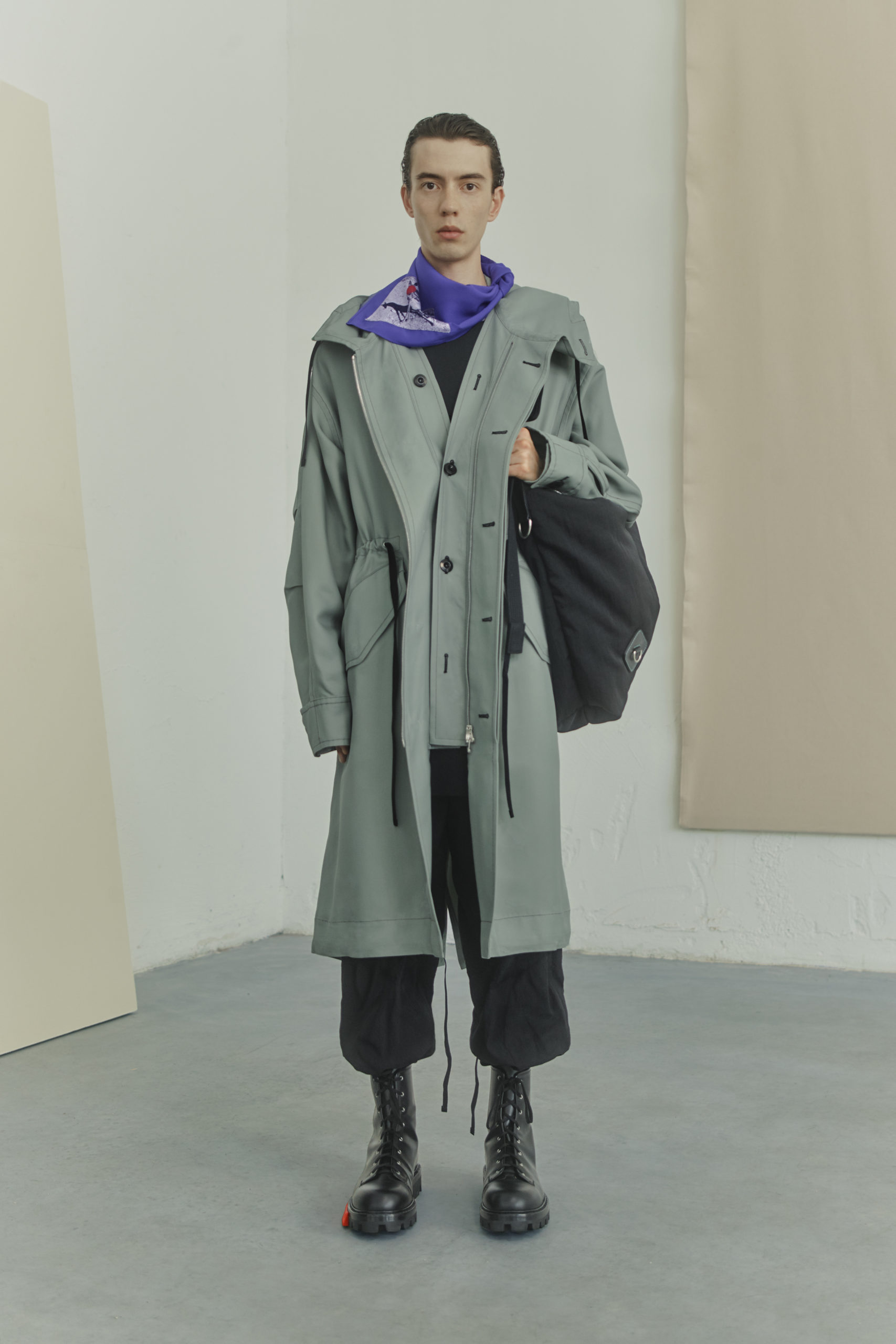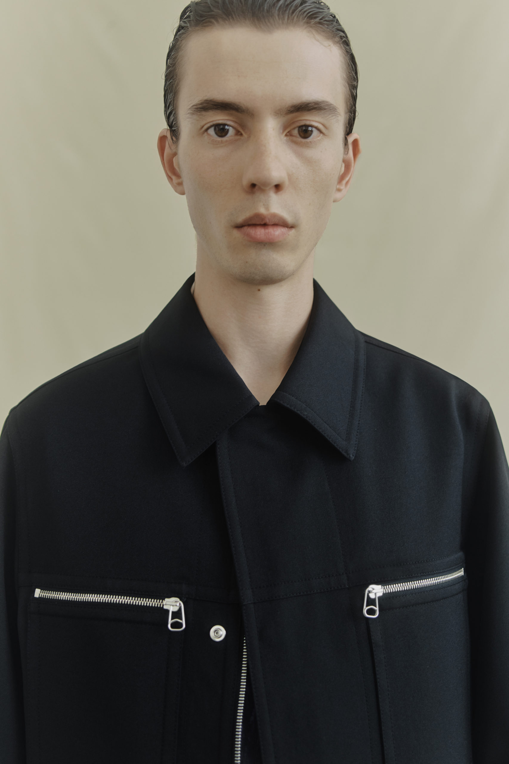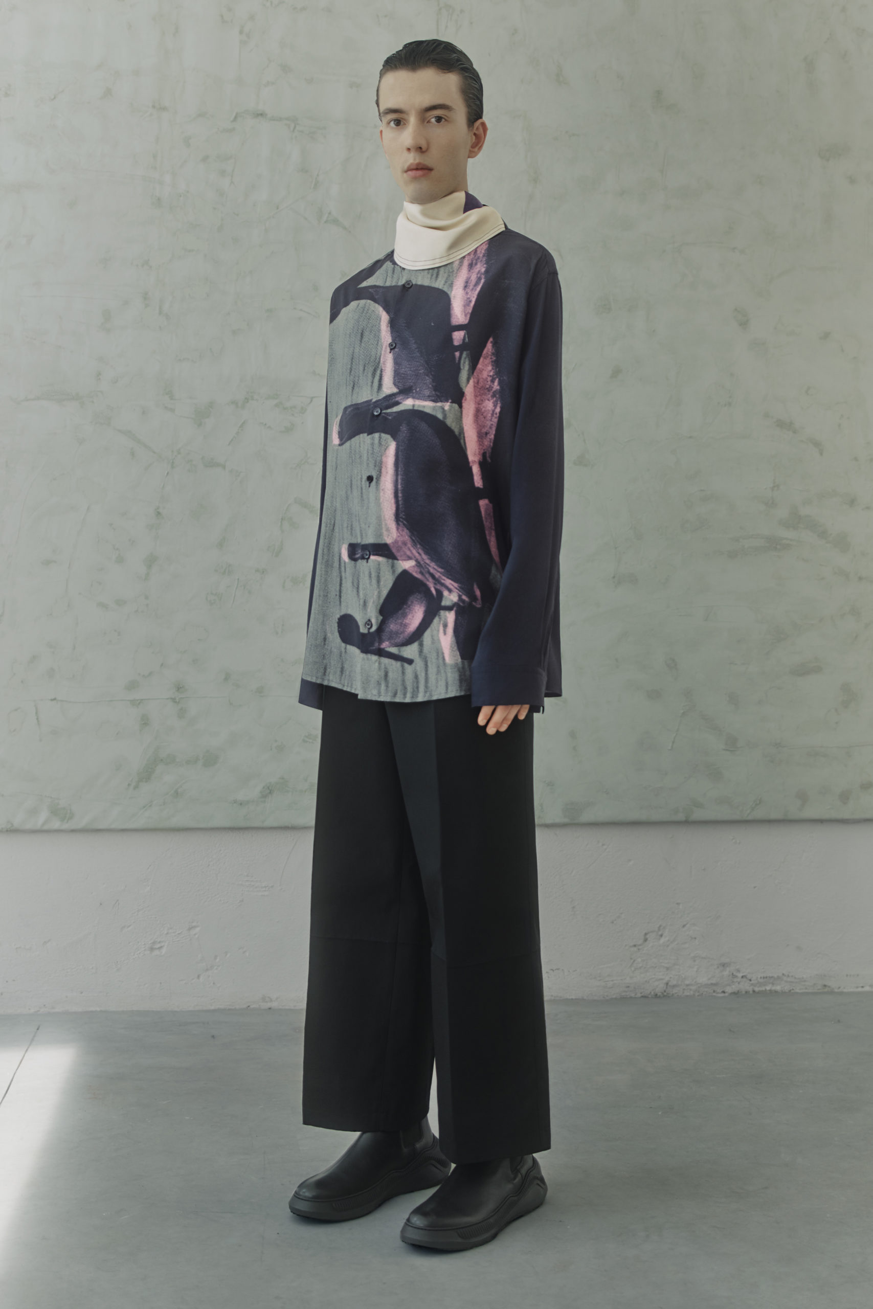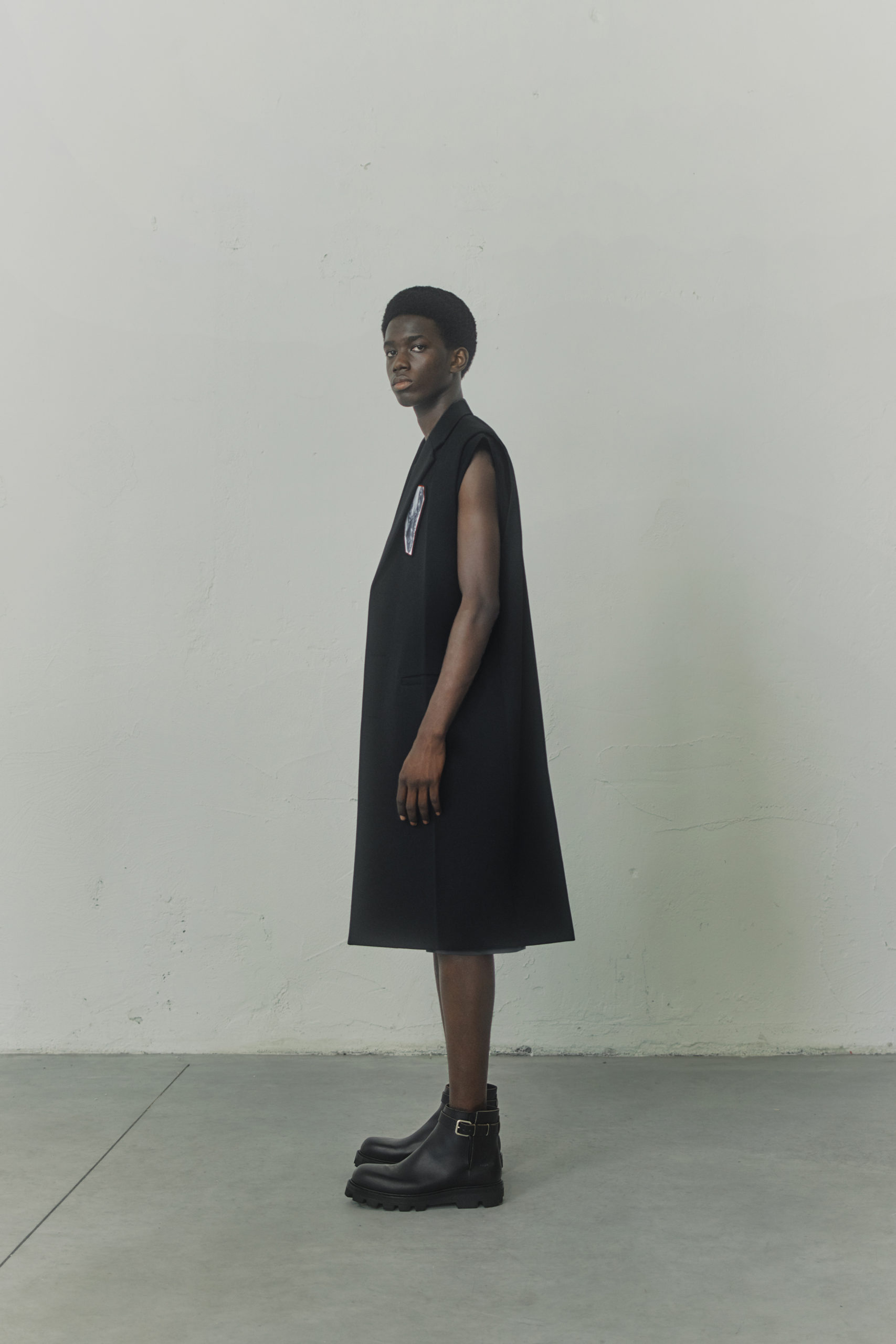 However, as the collection, mood, and circumstance developed, it was important to balance. To create a feeling of lightness, of hope, of positivity. Softer, more _uid fabrics were included and cut into coats, shirts, and trousers. Long, shaped foulards added an elegance and a sophistication.