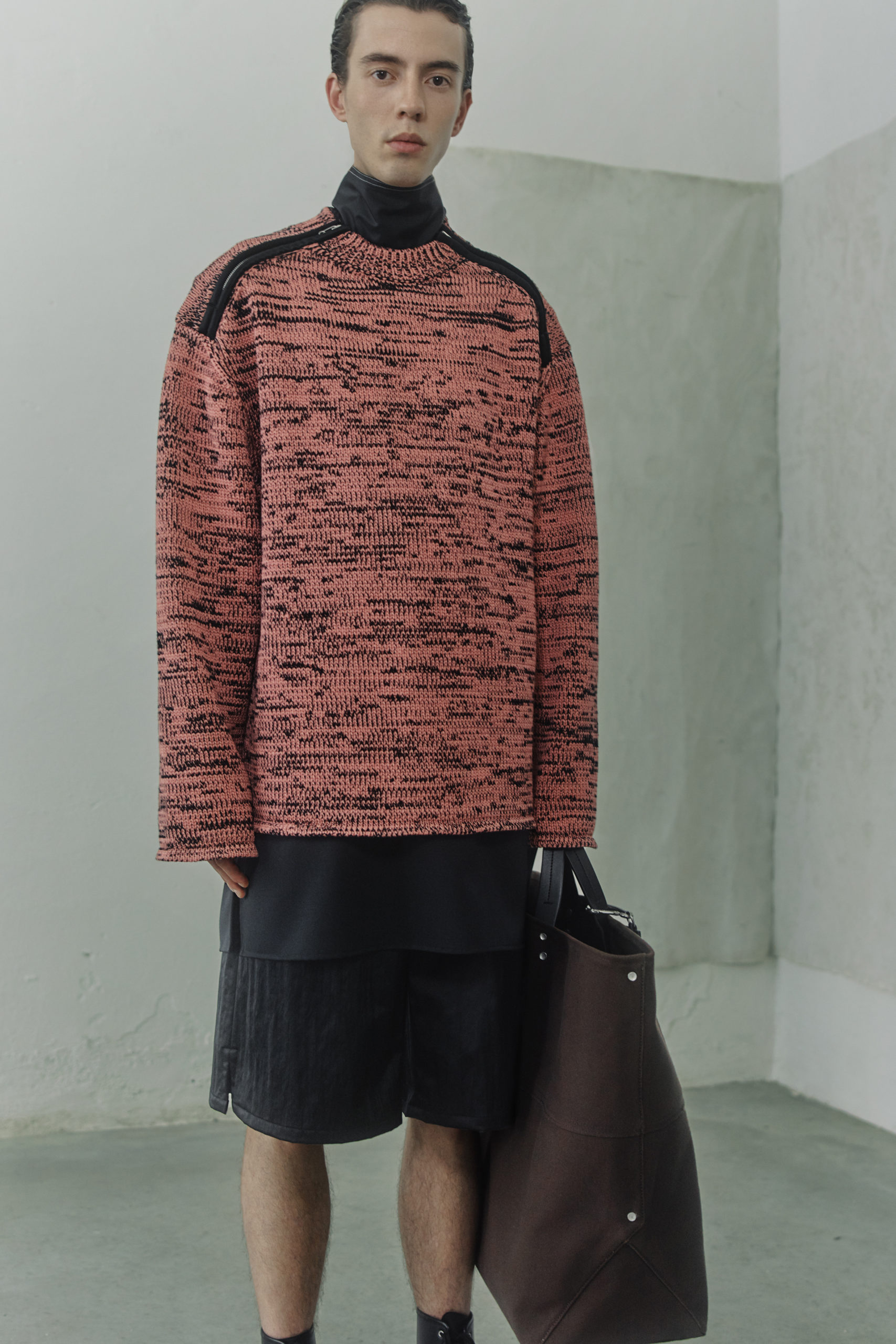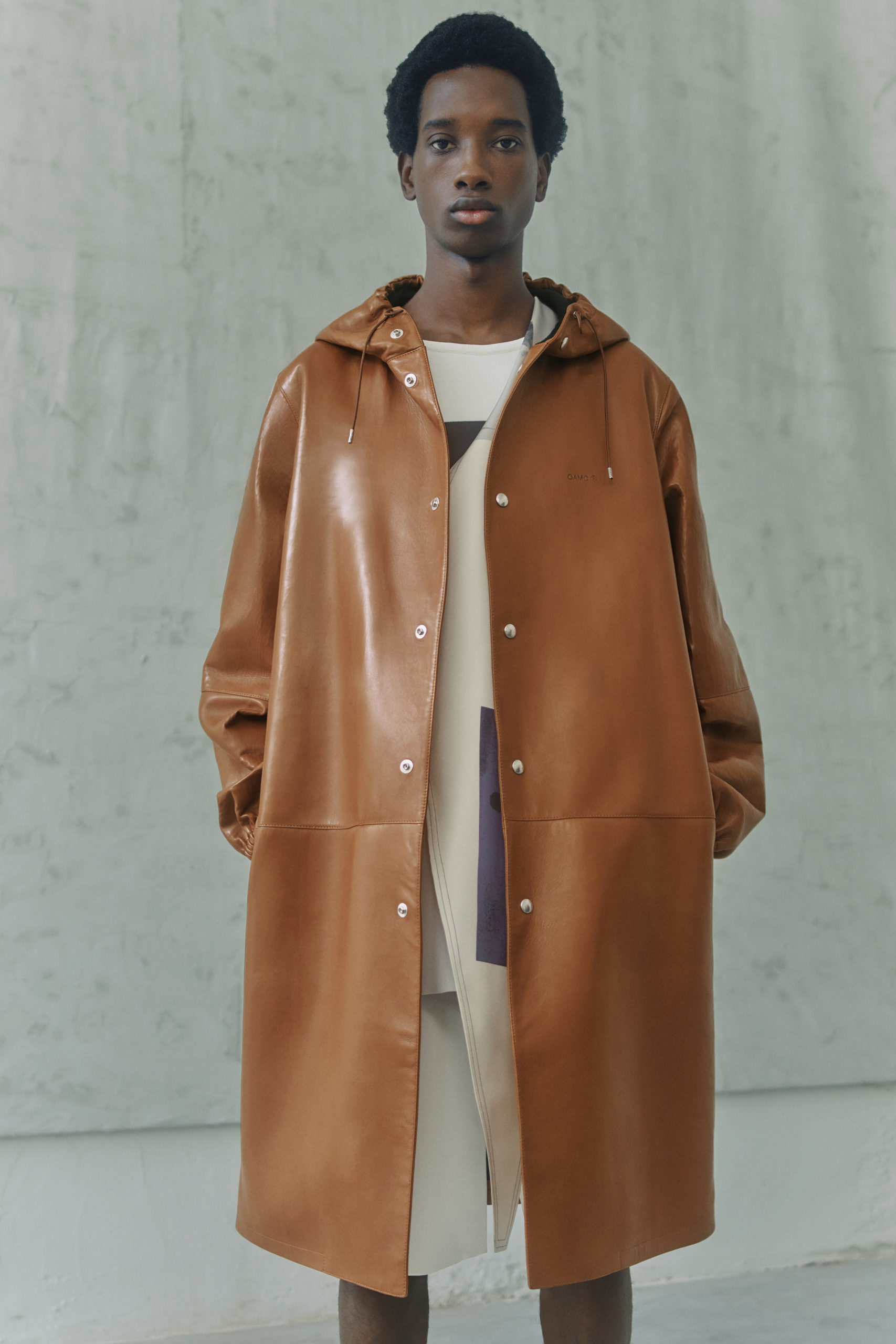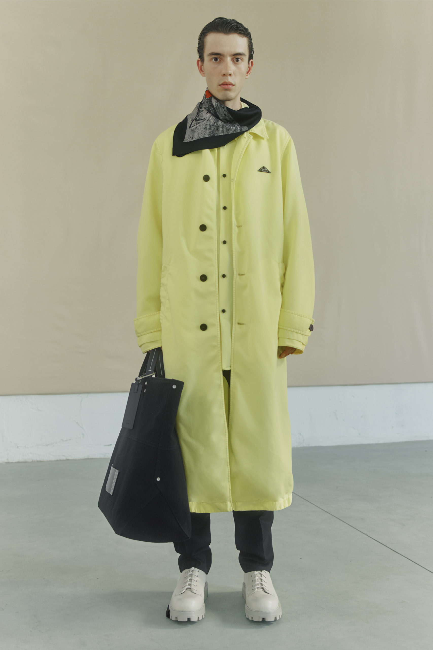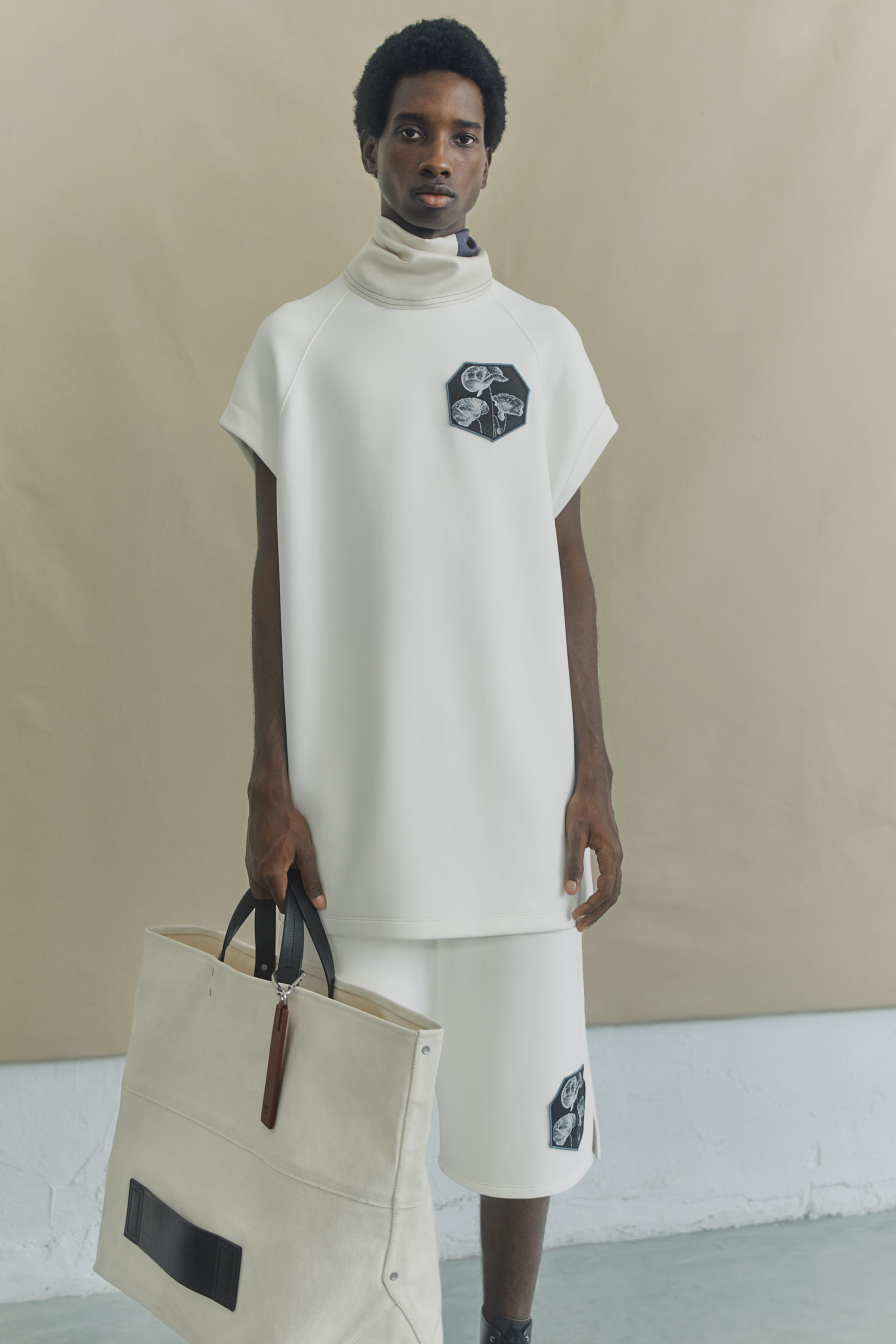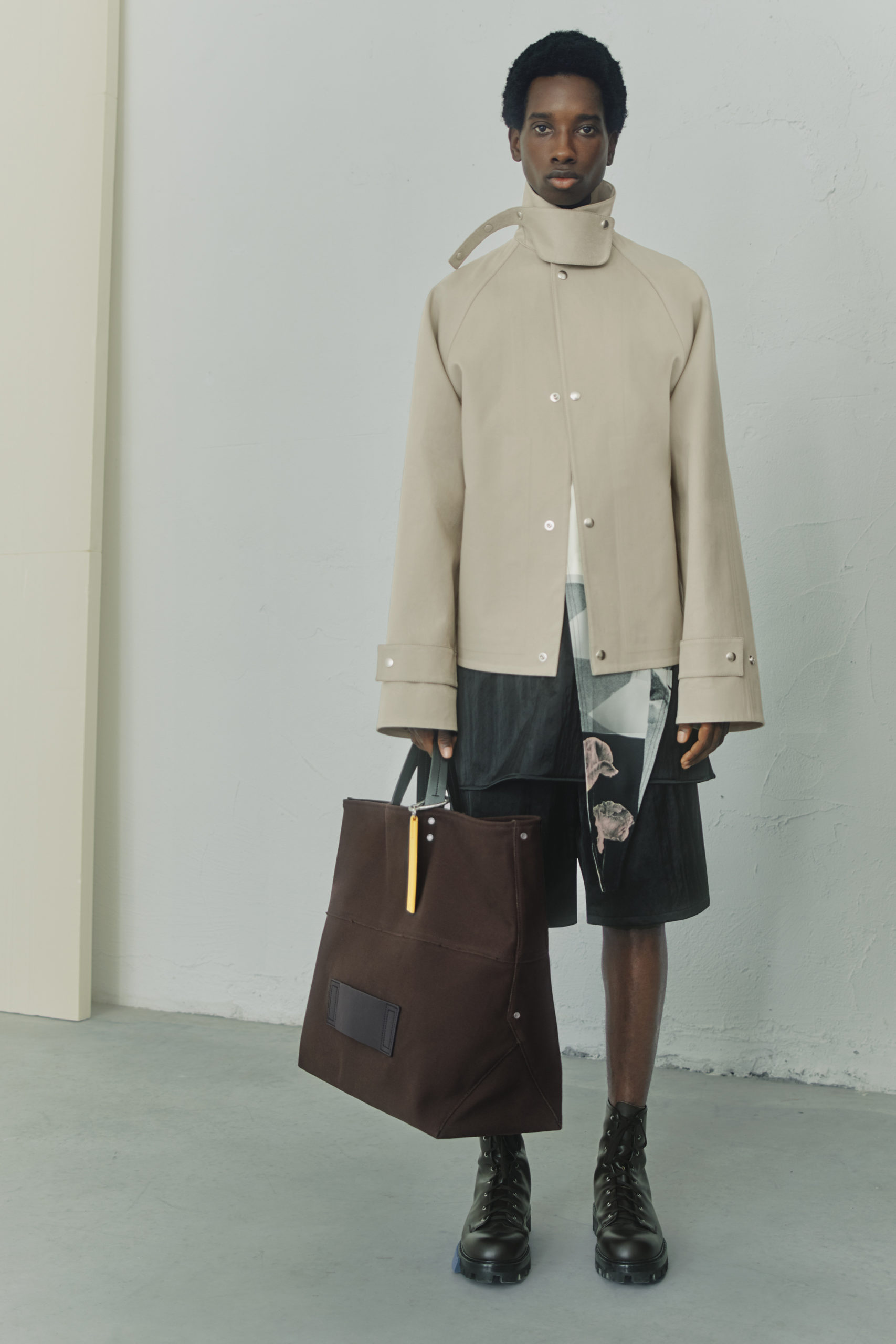 Shoes and boots are military in feel, with an asymmetrical custom lug outsole featuring a removable rubber insert which adds a color touch as well as a secondary tread pattern. The custom Free Solo sneaker outsoles have been utilized in a new, clean form, and vulcanized shapes are present. Bags are geometric, with cues coming from a functional utilitarian language: clean leather crossbody transit bags, oversized canvas tote
