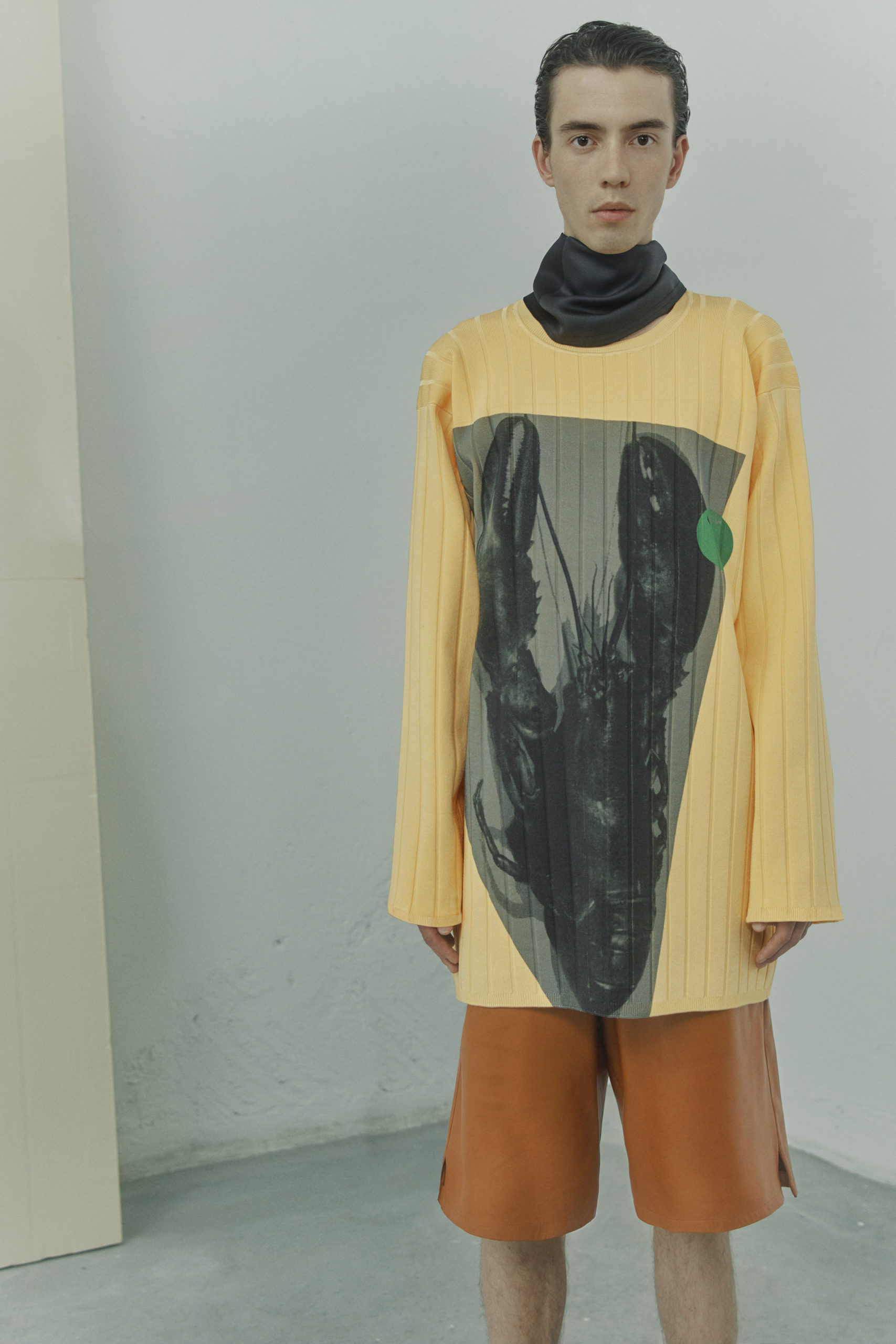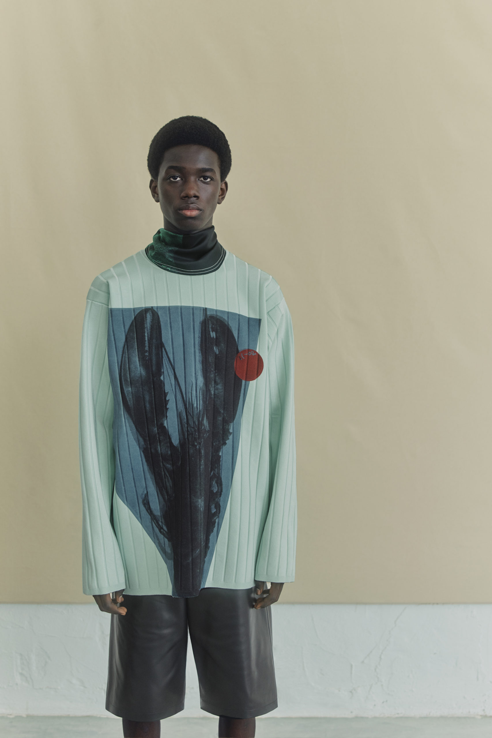 As the collection emerged, the visual language of the artwork also found a progressive point of view. Imperfect geometric forms were created by collaging and chopping up images, both found and created. The touch of human decoration and handwork, deliberately analogue. Patches that at once seem military are hand embroidered and add images of serenity, of flowers and sea birds, or of surreality, lobsters and pelicans. A commentary on how we can be resilient in this moment, and how it’s important to remember the beauty and softness in our world, no matter how strange things become.