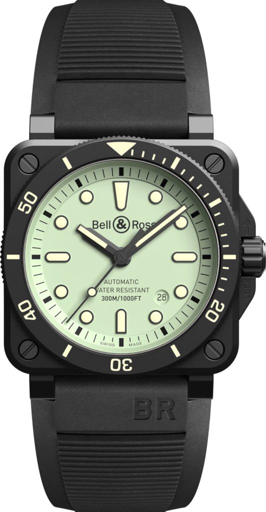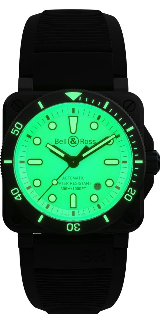 Avec la BR 03-92 DIVER FULL LUM, Bell & Ross adapte son concept Lum à sa collection de plongée et renverse les principes traditionnels de lisibilité de jour comme de nuit en jouant avec des contrastes inversés, la marque horlogère travaille également avec différentes nuances de luminescence.