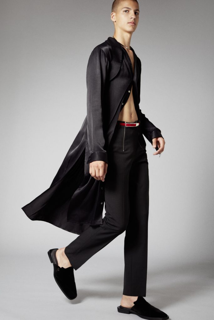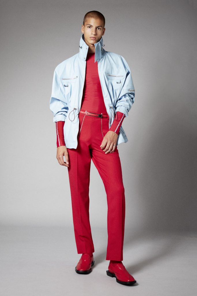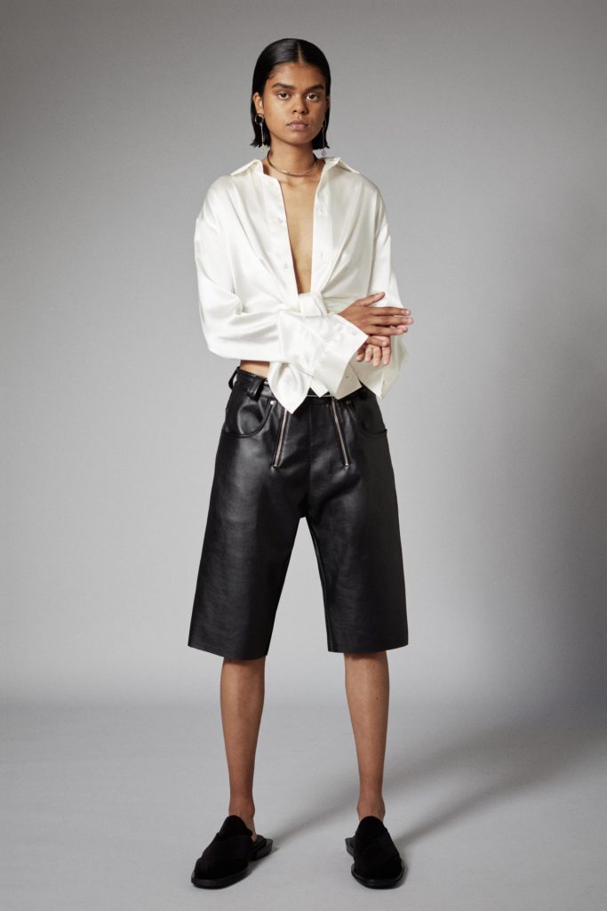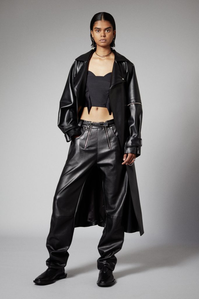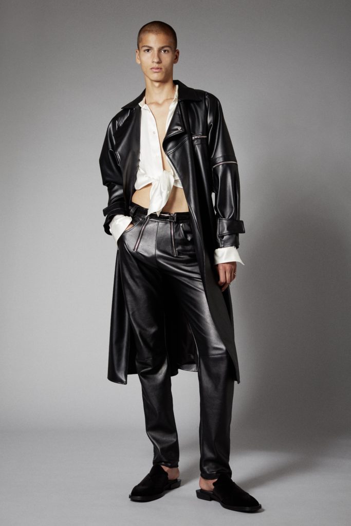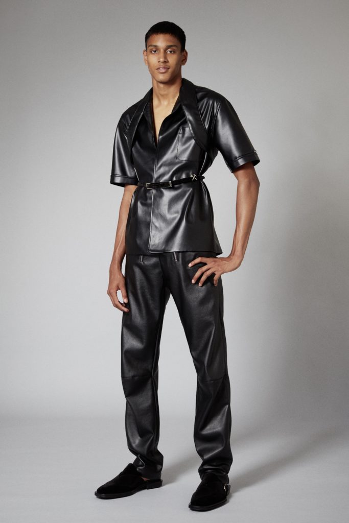 Reoccuring throughout is GmbHÂs double zips, taken from German carpenter uniforms, and put on trousers and shorts in vegan leather. Vegan leather shirts and organic cotton vests have built in harness constructions. The classic GmbH Chappal loafer, inspired by the cross design of traditional Pakistani sandals, are reimagined as mules in signal red and black velvet. Jewellery in sterling silver and recycled resin and off cut semi-precious stones are designed in collaboration with Panconesi. Colour blocked intarsia knits have suggestive peek-a-boo holes, while workwear-inspired contrast topstitches adorn tailored coats in cotton twill. Vegan leather appears both in black and baby blue, while the hardness of the leather is contrasted with flowing satin shirts tied above the midriff. Some shirts and ties are simply made from GmbH logo jacquard lining materials, exemplifying the use of resources.