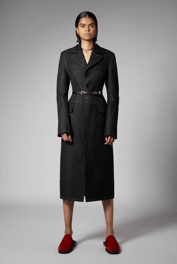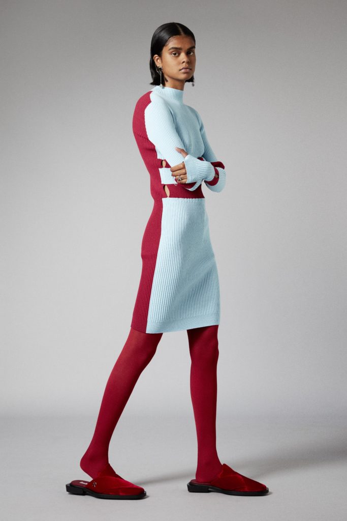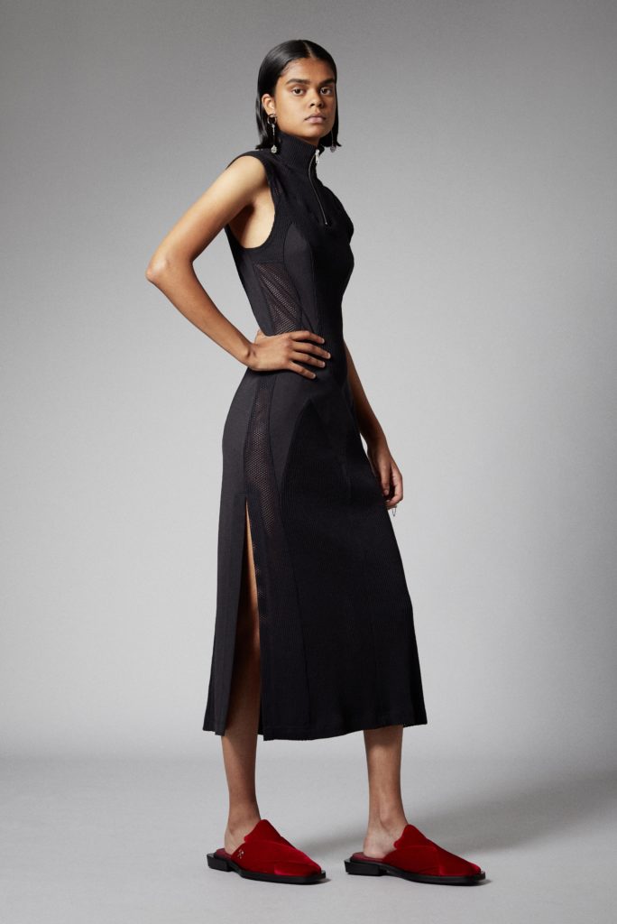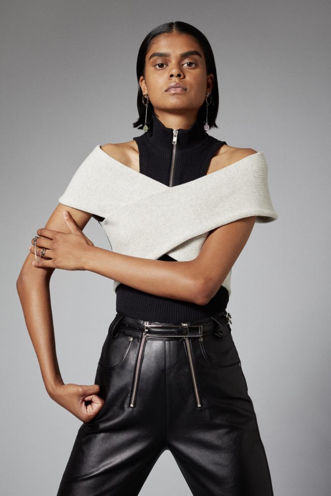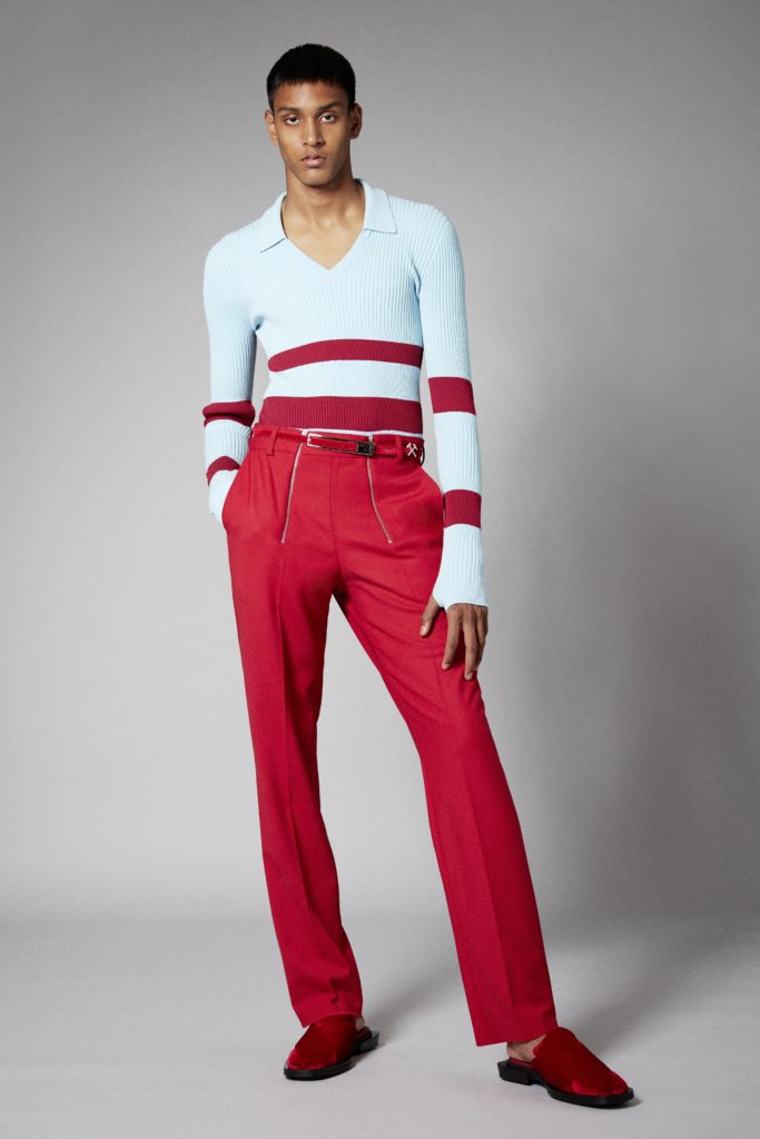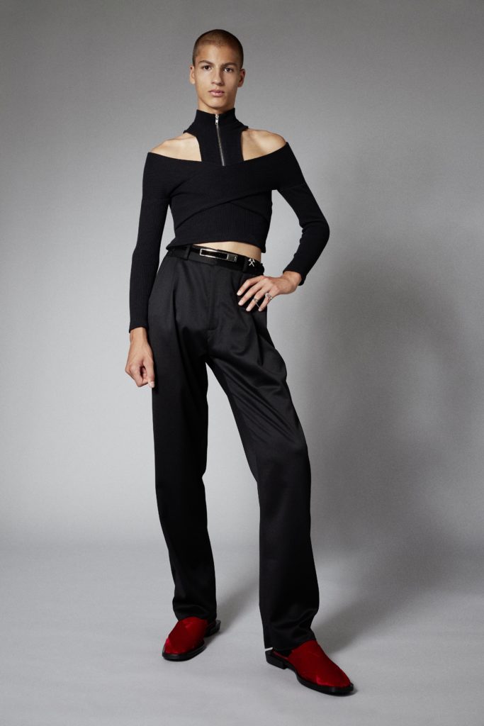 Reoccuring throughout is GmbHÂs double zips, taken from German carpenter uniforms, and put on trousers and shorts in vegan leather. Vegan leather shirts and organic cotton vests have built in harness constructions. The classic GmbH Chappal loafer, inspired by the cross design of traditional Pakistani sandals, are reimagined as mules in signal red and black velvet. Jewellery in sterling silver and recycled resin and off cut semi-precious stones are designed in collaboration with Panconesi. Colour blocked intarsia knits have suggestive peek-a-boo holes, while workwear-inspired contrast topstitches adorn tailored coats in cotton twill. Vegan leather appears both in black and baby blue, while the hardness of the leather is contrasted with flowing satin shirts tied above the midriff. Some shirts and ties are simply made from GmbH logo jacquard lining materials, exemplifying the use of resources.