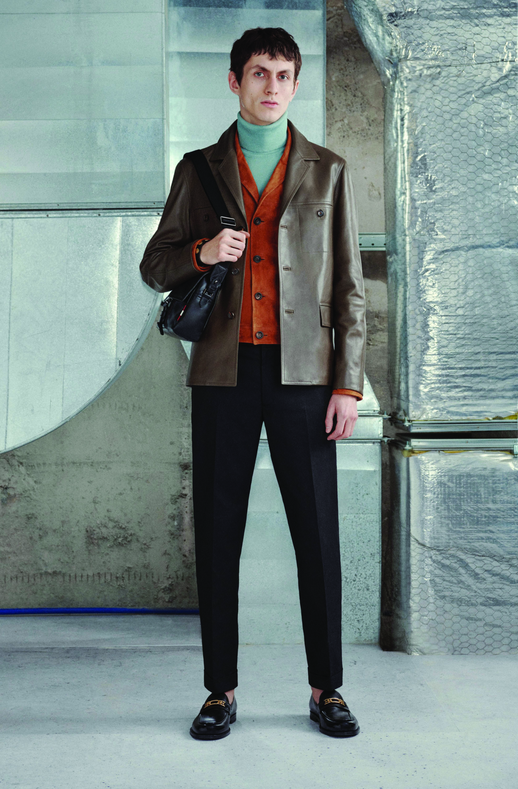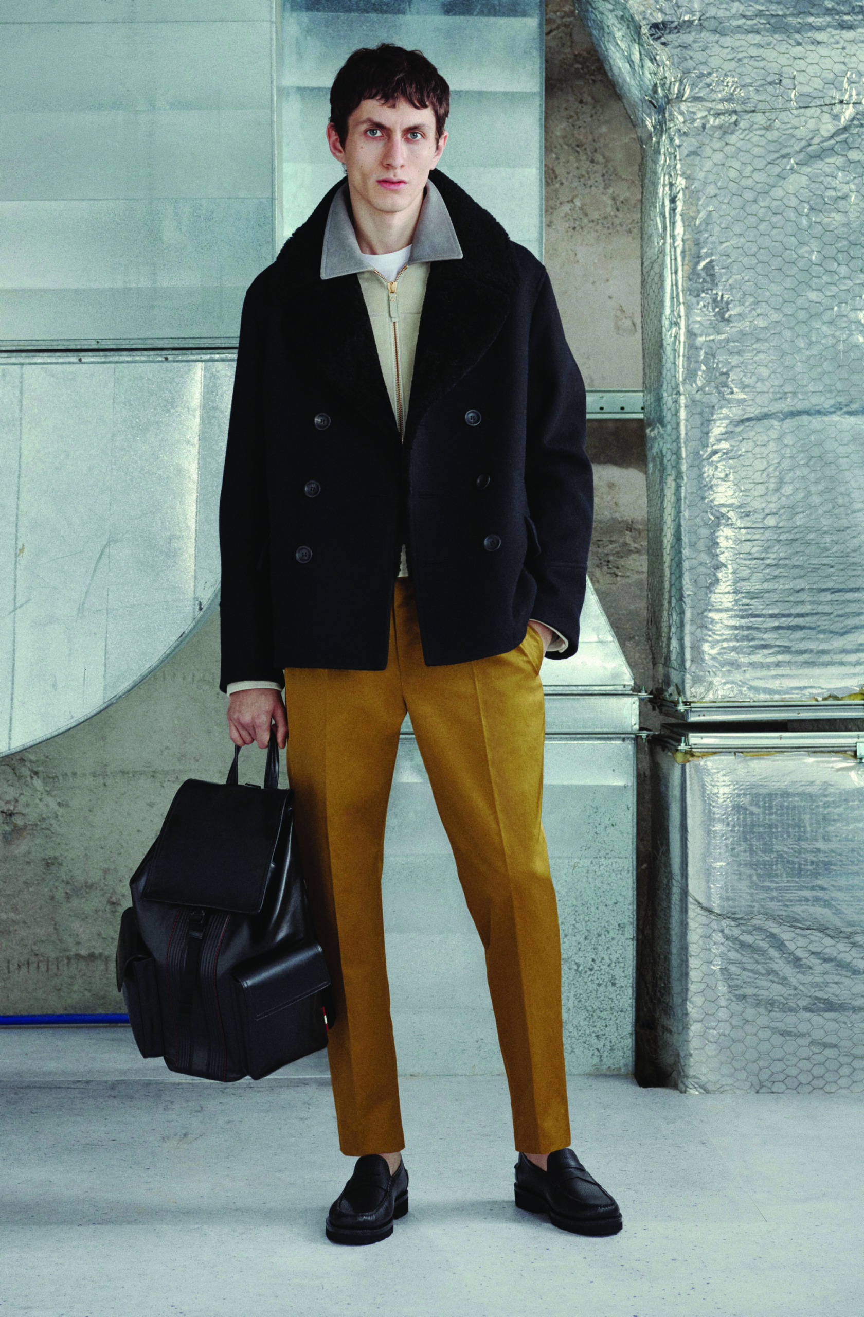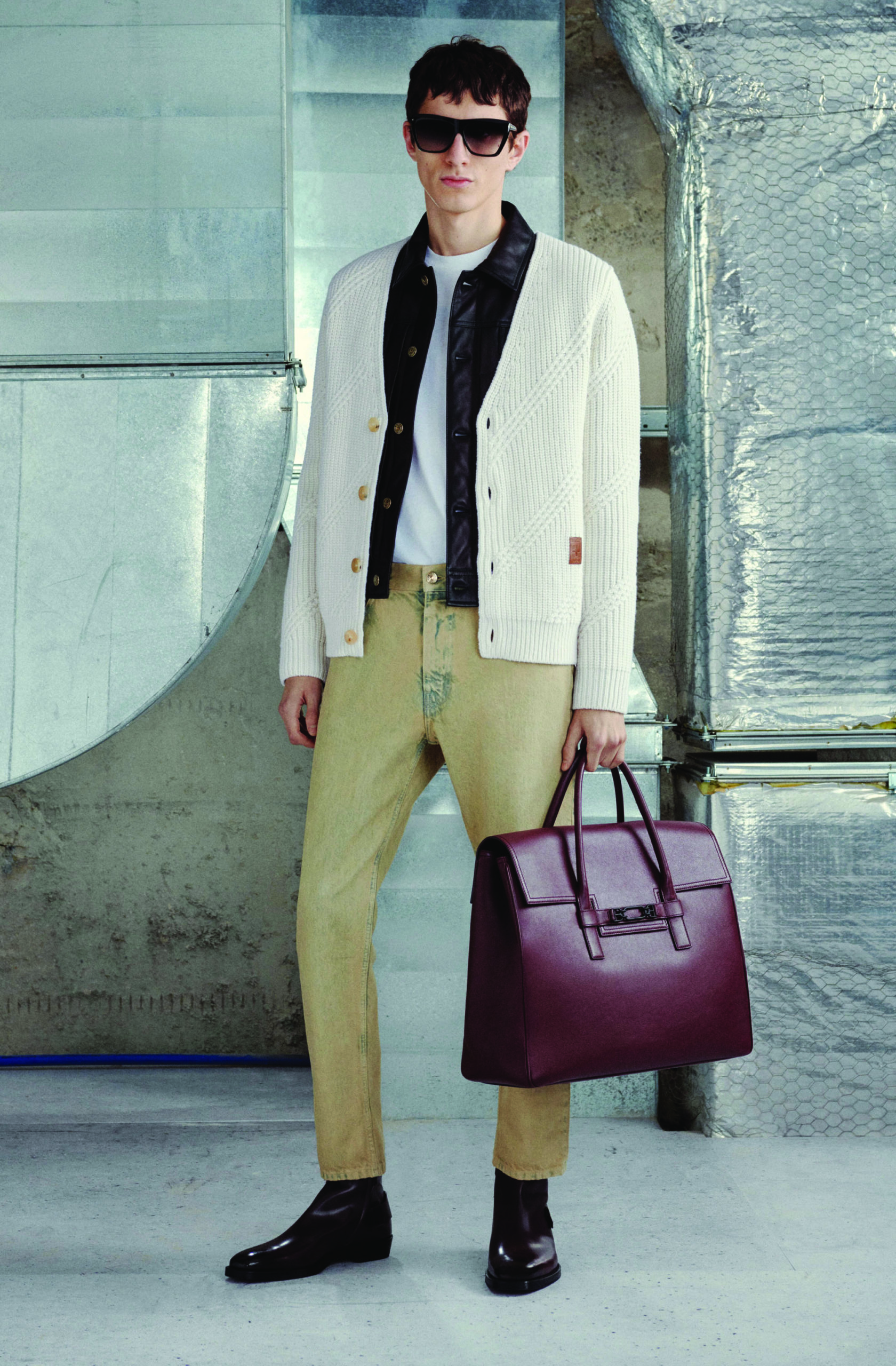Leatherwork reprises its role, whether layered, light plonge, thin shearling or smooth suedes. Warm, woven knits present as luxurious cashmere-cotton flannels, fluid wools with vintage treatments, and technical jacquard. Accessories and shoes see unlined and waterproof sartorial-effect nylons, B-chain jacquards, croc-embossed matte leather and hardware highlights, like the 1851.