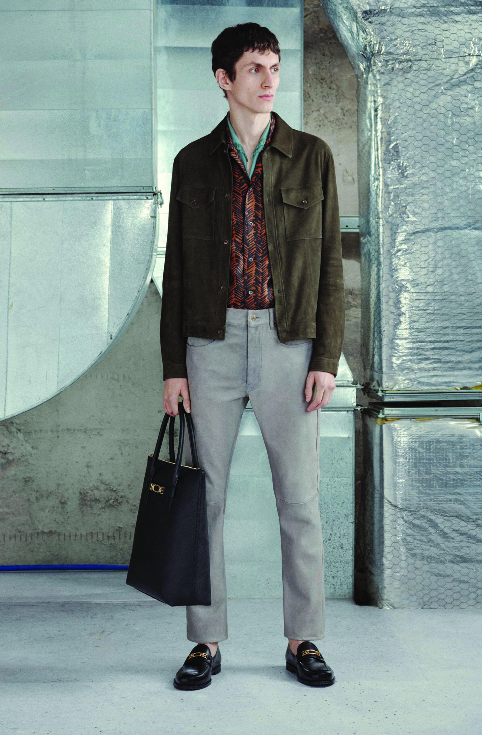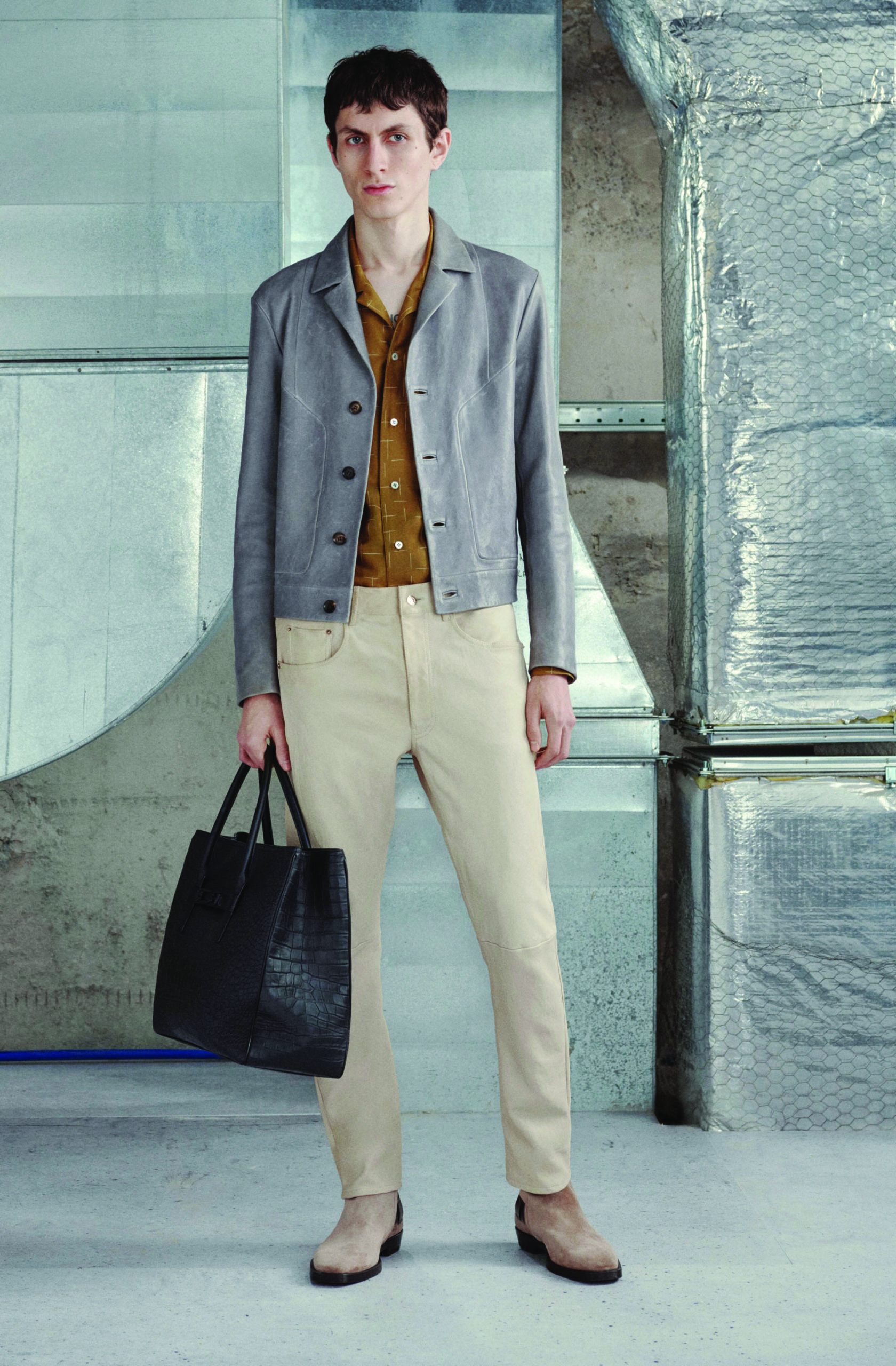 Warm, earthy tones and layered separates feature alongside signature leather jackets, whether cropped or mid-length in shearling and suede details. Sleek printed silk twill shirts and wool knits are paired with light-wash denim or five-pocket leather trousers.
