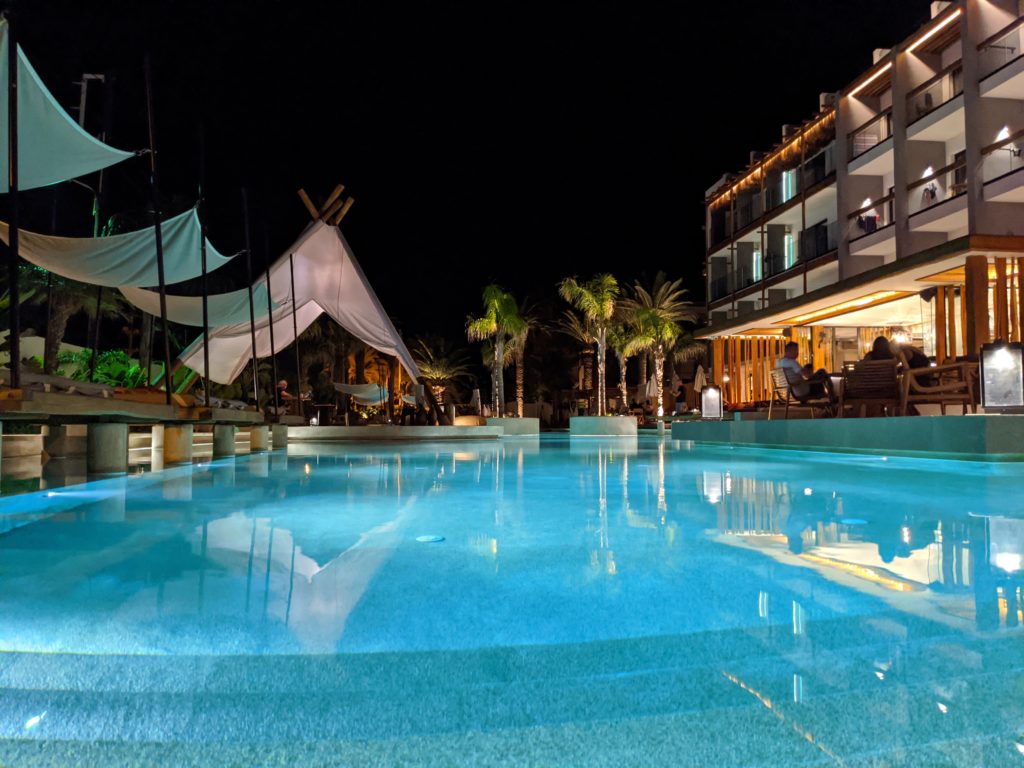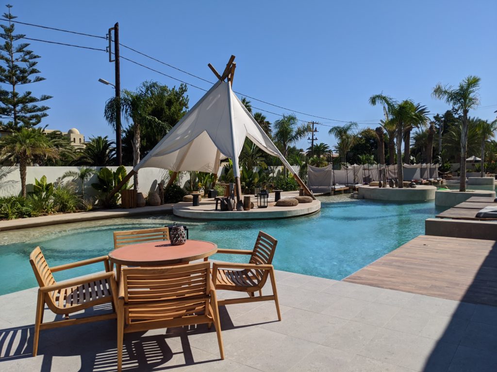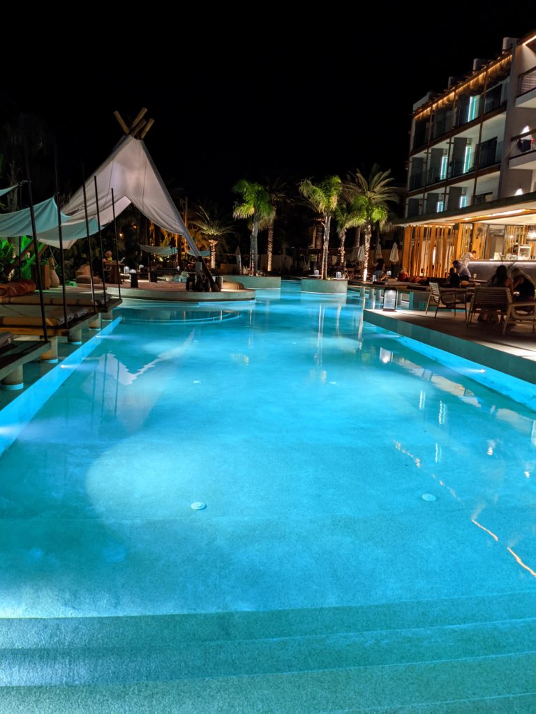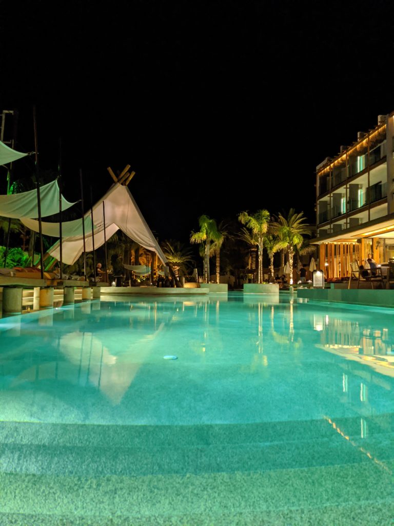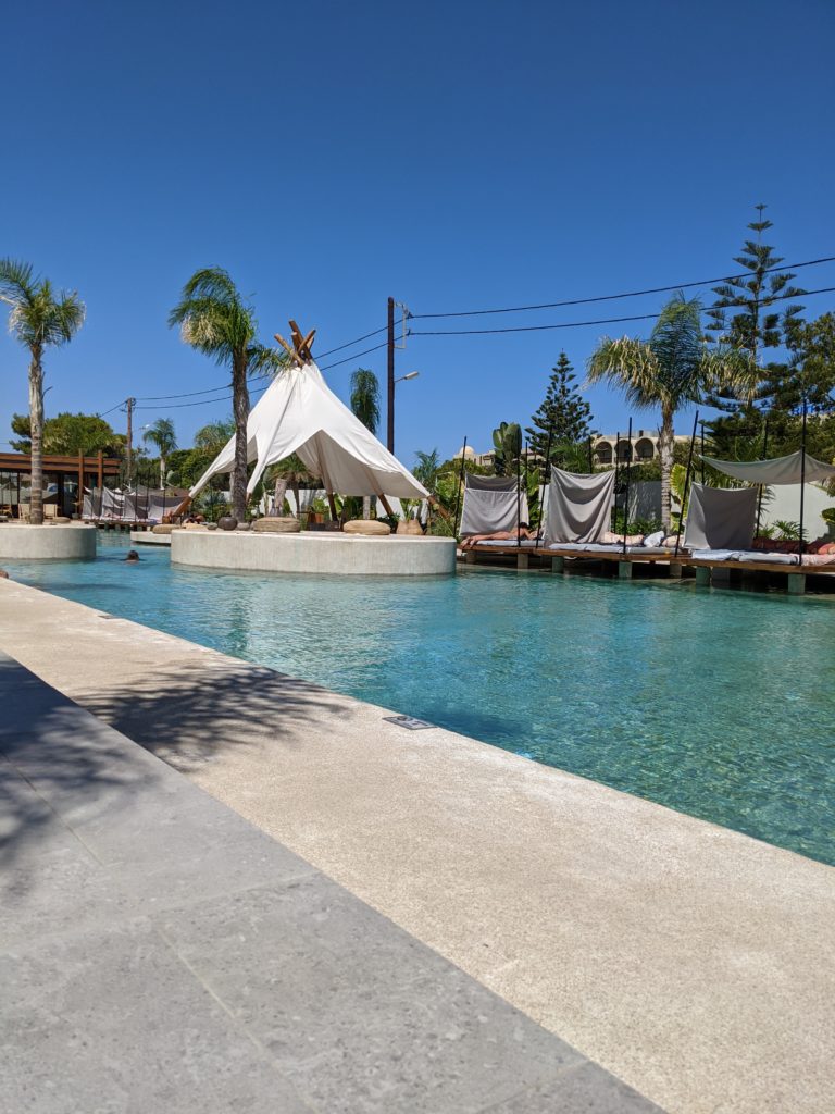 Poumon de l’hôtel, les piscines. Au milieu de l’immense piscine principale un tipi grandiose qui répond aux cactus et autres palmiers. La deuxième piscine quant à elle est calme et entourée de cactus et verdure.