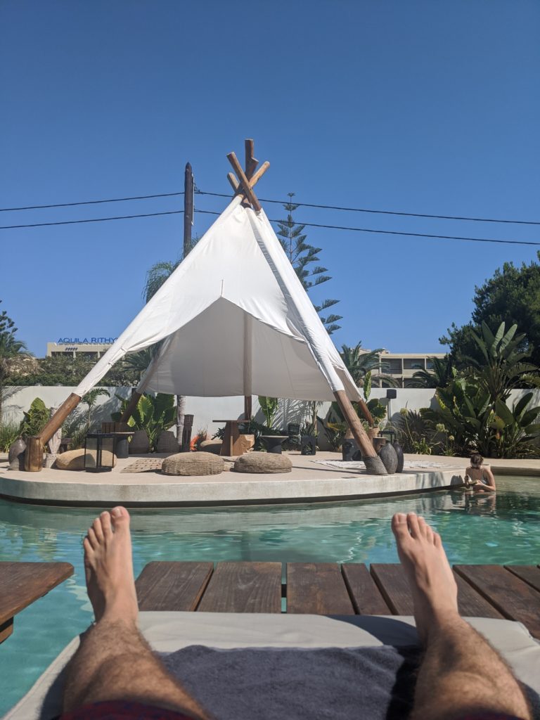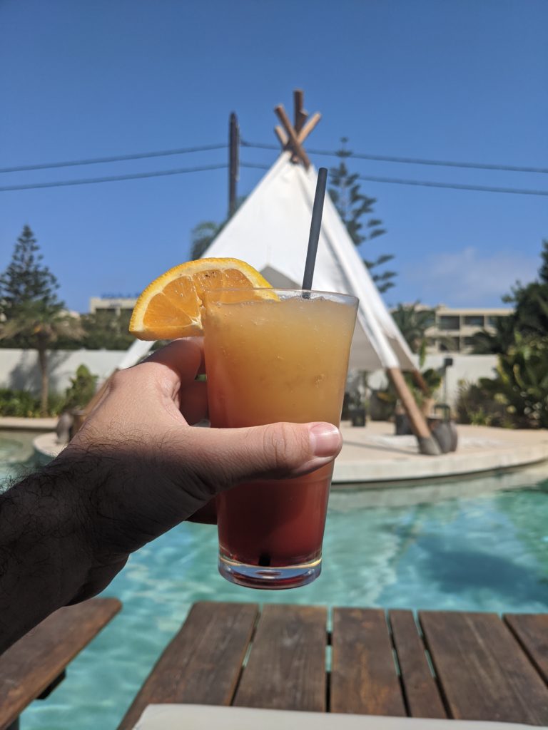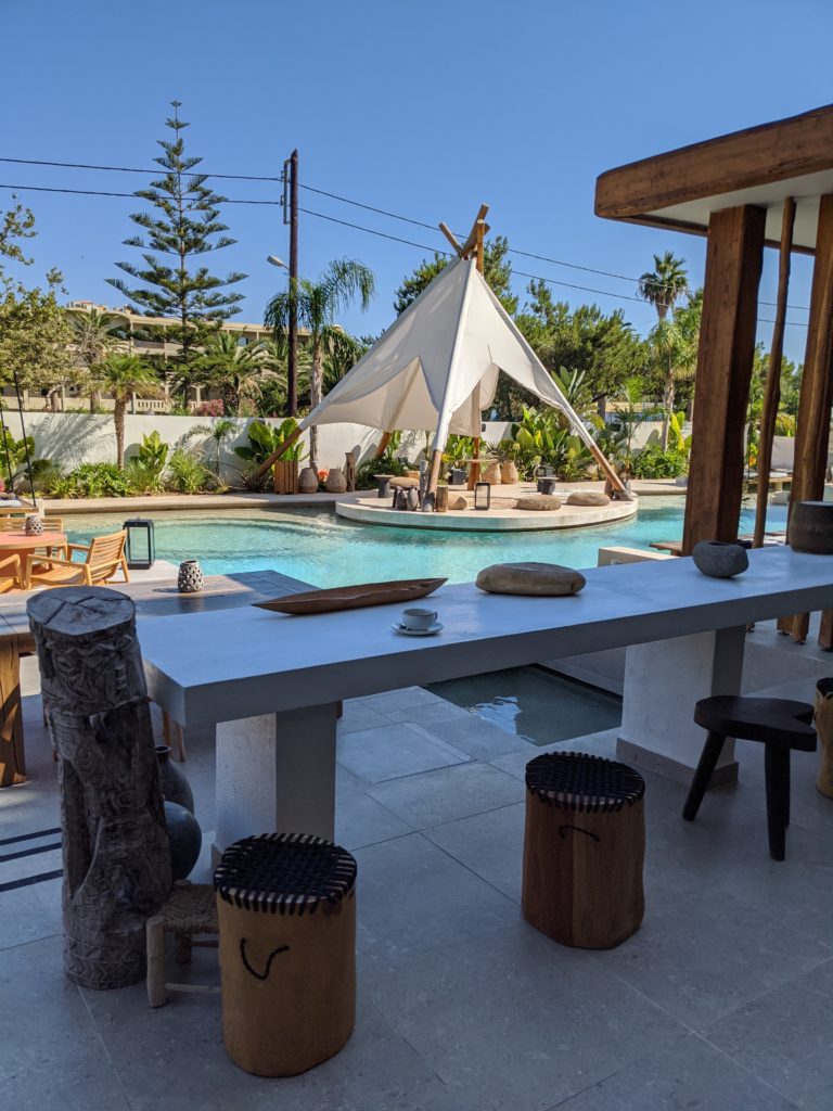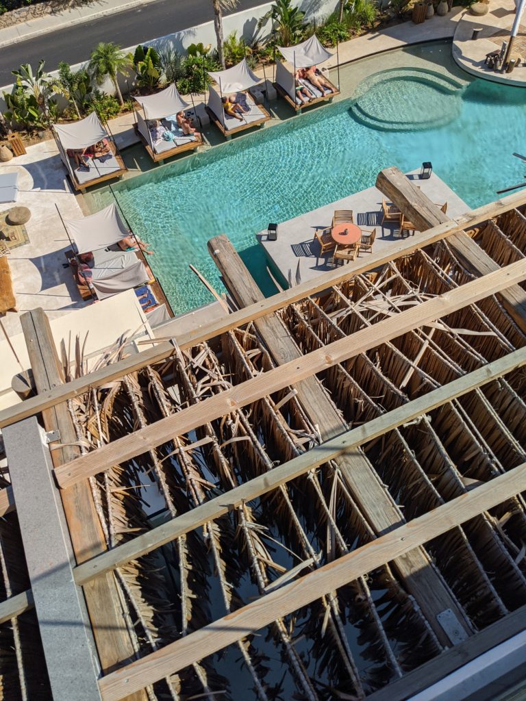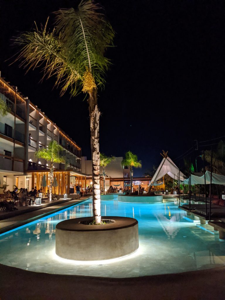 Poumon de l’hôtel, les piscines. Au milieu de l’immense piscine principale un tipi grandiose qui répond aux cactus et autres palmiers. La deuxième piscine quant à elle est calme et entourée de cactus et verdure.
