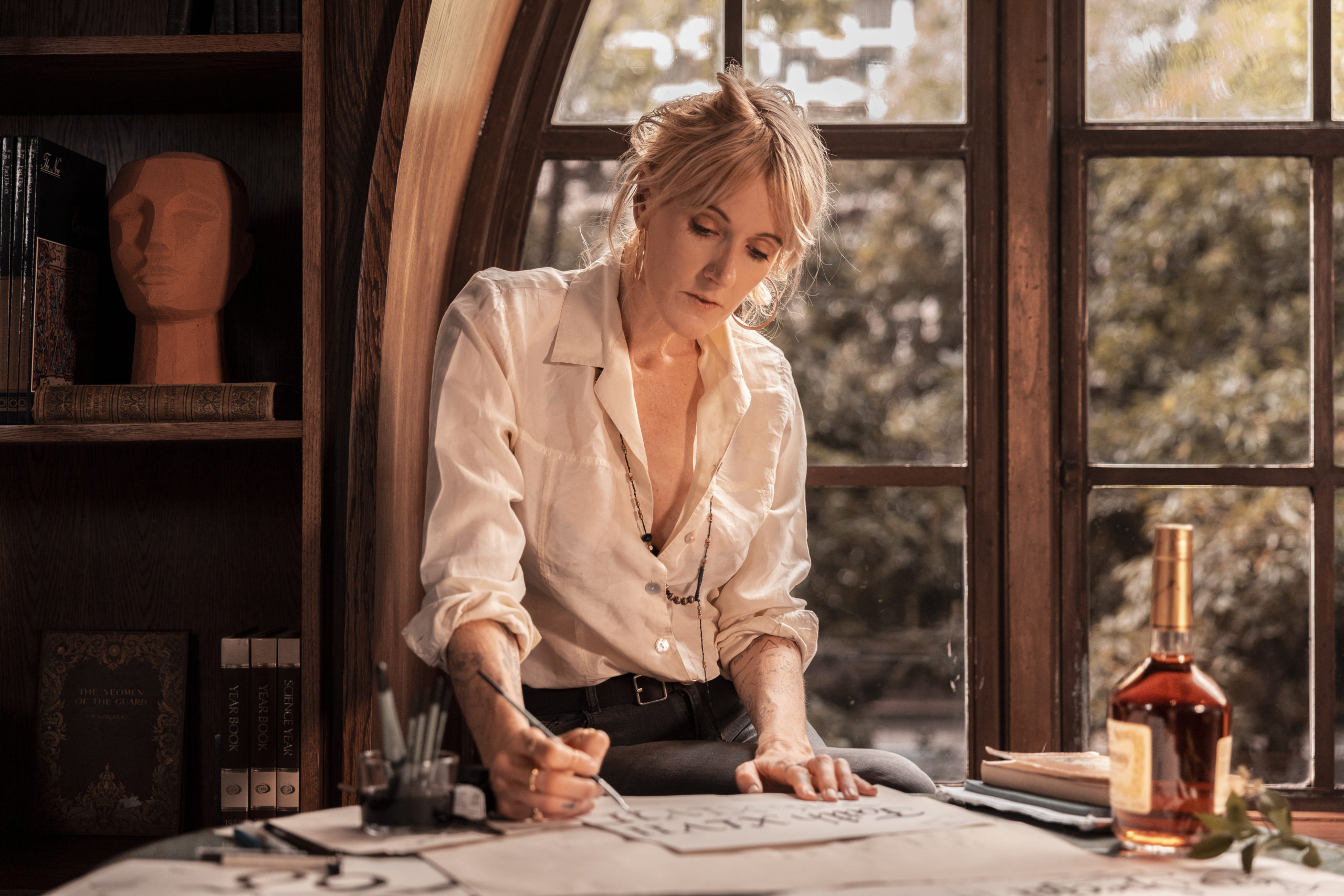 La réinterprétation artistique de Faith XLVII pour cette nouvelle édition limitée est le fruit d’une rencontre. Pour Faith XLVII, sa démarche artistique s’accorde naturellement avec celle de la Maison Hennessy. Lors de sa première visite au Château de Bagnolet, cœur historique de la Maison à Cognac, l’une des premières choses auxquelles l’artiste a été sensible est le temps consacré à l’élaboration des assemblages des cognacs. À ses yeux, le processus complexe de sélection des eaux-de-vie – qui s’appuie sur des siècles de savoir-faire – est un retour aux sources qui permet de prendre le temps et de rendre compte de son importance. « La Maison Hennessy puise ses racines dans des principes simples, qui sont les mêmes depuis que son histoire a commencé il y a plus de 250 ans », observe l’artiste. Le lien entre l’univers de la Maison Hennessy et le sien est tout de suite apparu évident. « Dans mon travail, je suis très attentive aux matières premières et à la manière dont je peux les utiliser pour donner corps à mes œuvres. C’est la même créativité que l’on retrouve aussi dans la façon dont la Maison Hennessy travaille. D’une certaine manière, nous avons en commun de prendre des éléments basiques pour créer quelque chose de nouveau. Ma démarche ressemble à celle du Maître Assembleur : nous sélectionnons tous deux des éléments premiers que nous utilisons au fil du temps pour créer quelque chose de remarquable. » Pour cette bouteille, Faith XLVII a créé une œuvre représentant Hennessy à travers les éléments, la terre et les cycles de la nature. Avec le soleil et le temps en son centre, ses détails complexes rendent hommage à la nature au travers de références à la lune, à la pluie, aux nuages et aux vignes, rehaussées avec les feuilles de vignes dorées. La palette inspirée par les couleurs de la nature associe des éléments dorés avec « des tons rappelant la terre », tandis que des lettrages rendent hommage aux inscriptions à la craie sur les barriques séculaires dans le Chai du Fondateur à Cognac.