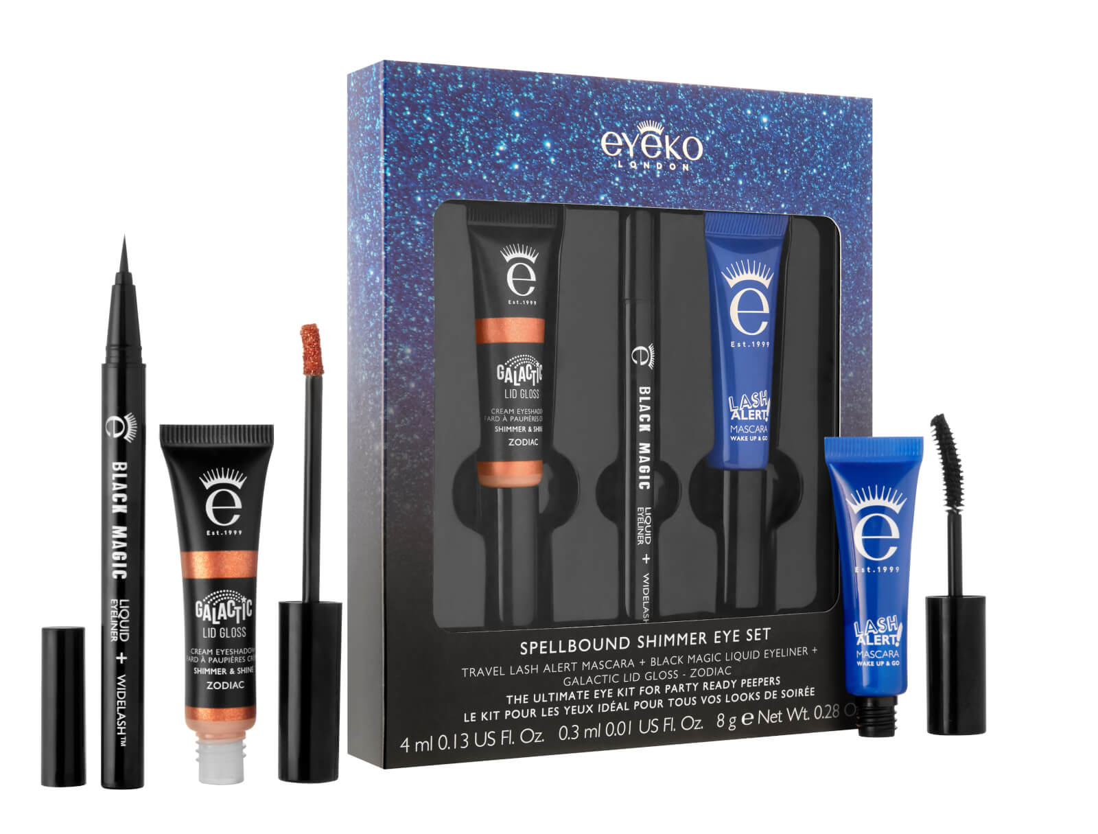 Brillez de mille feux avec ce coffret comprenant : – Le Galactic Lid Gloss Zodiac – 8 g, pour des paupières scintillantes en quelques secondes. – Le Black Magic Liquid Eyeliner – 0,4 ml, pour intensifier le regard. – Le Lash Alert Mascara – 4 ml. Un mascara et un soin réunis en un seul produit ! Sa formule végétale riche en caféine et en fibres soulève les cils à la racine pour plus de volume et un effet recourbé grâce à sa brosse en hélice.