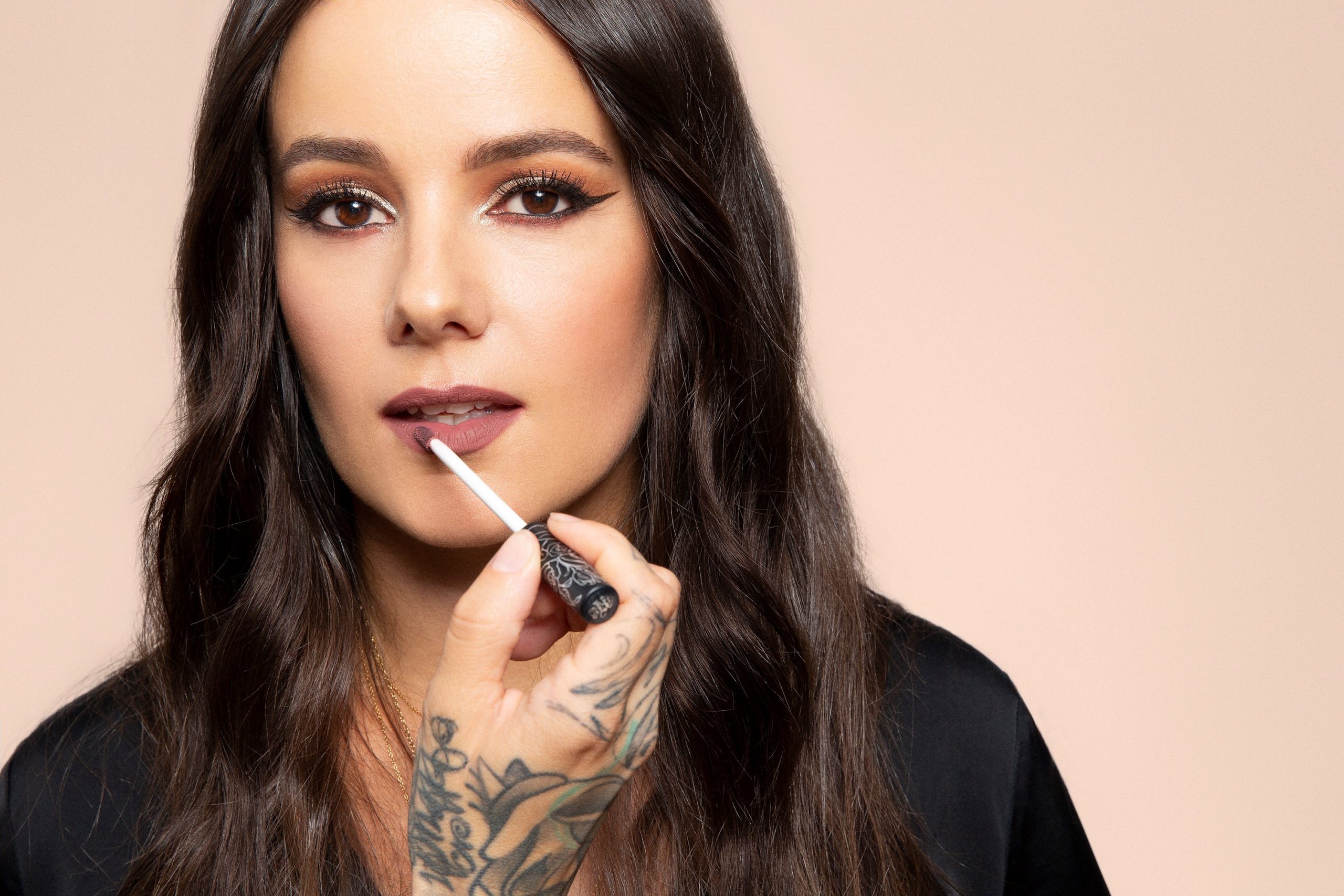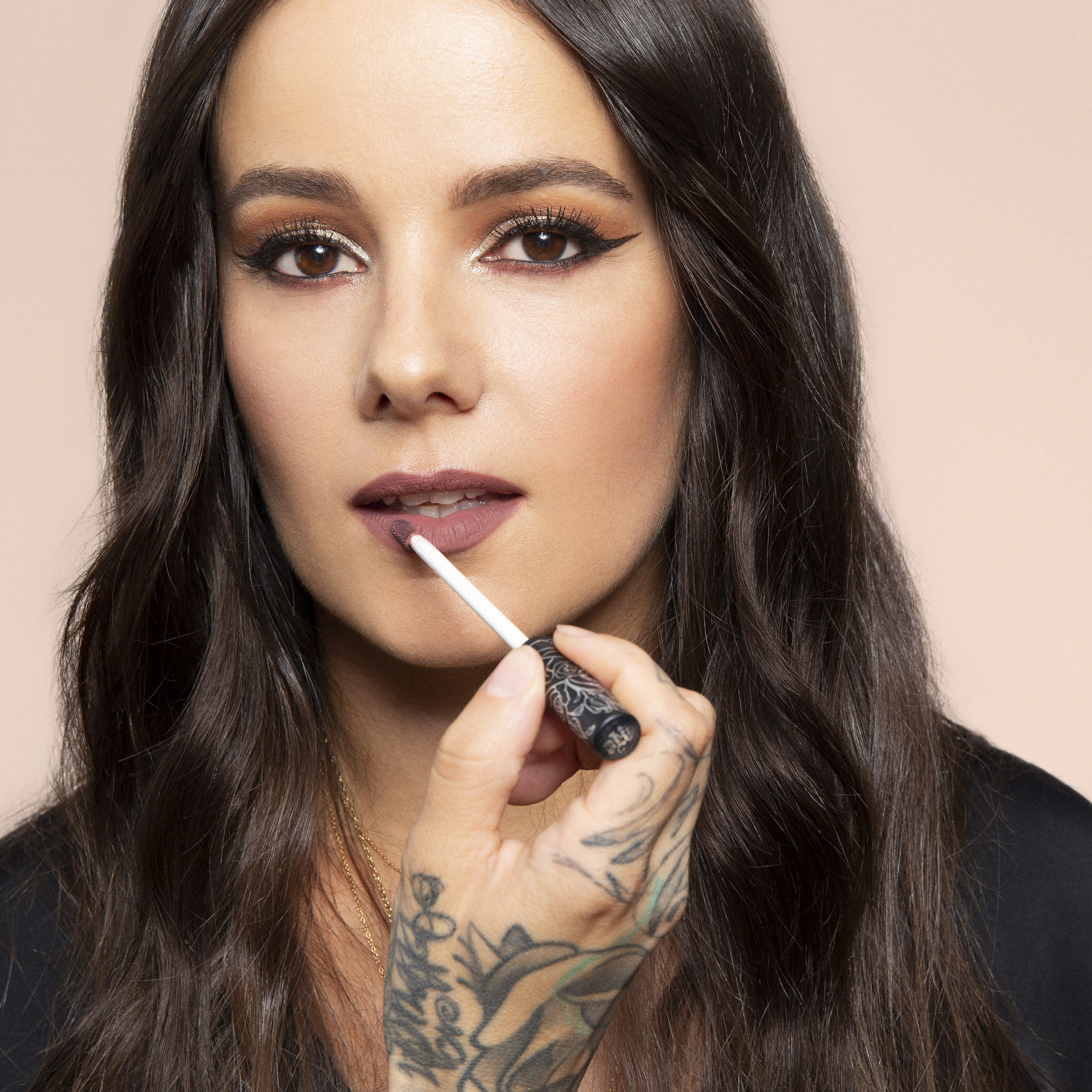 La jolie brunette prête son visage pour incarner Lolita, la teinte bois de rose iconique et universelle de KVD Vegan Beauty.