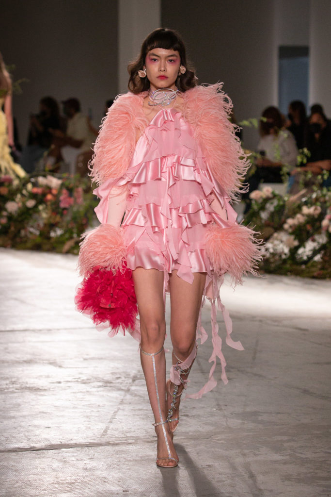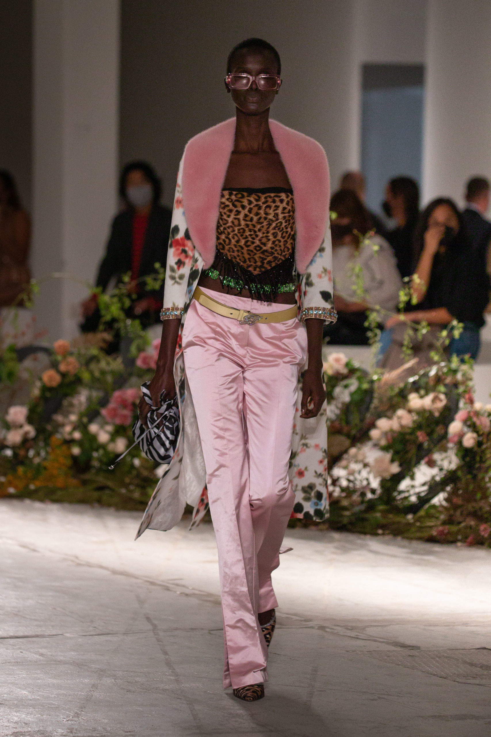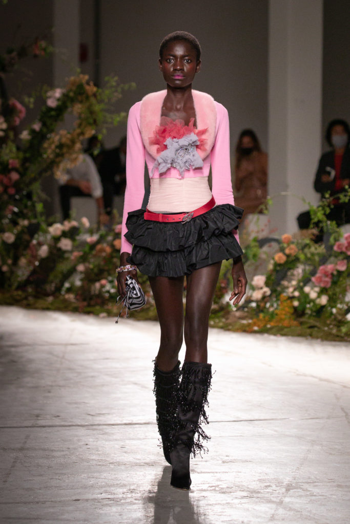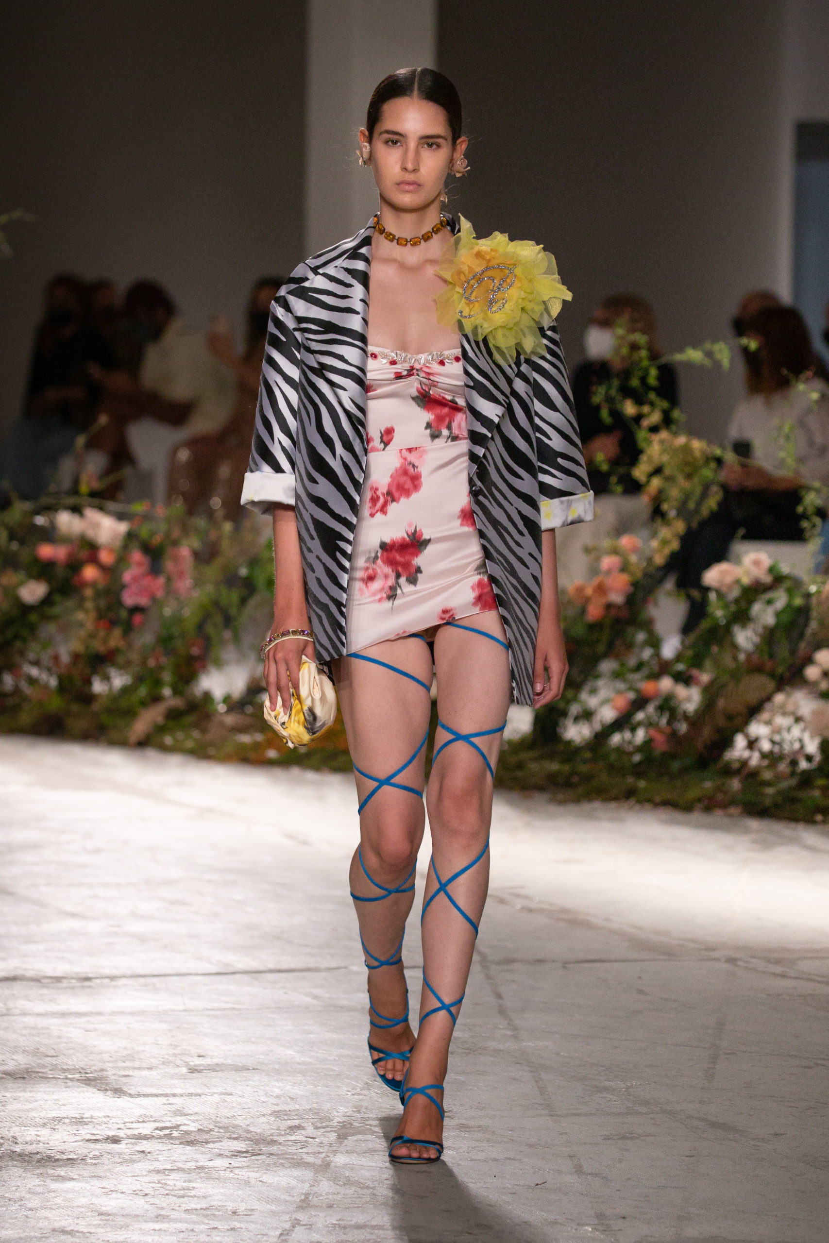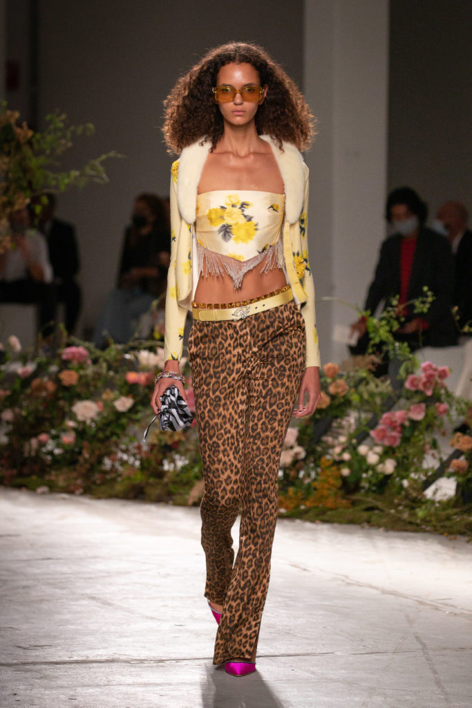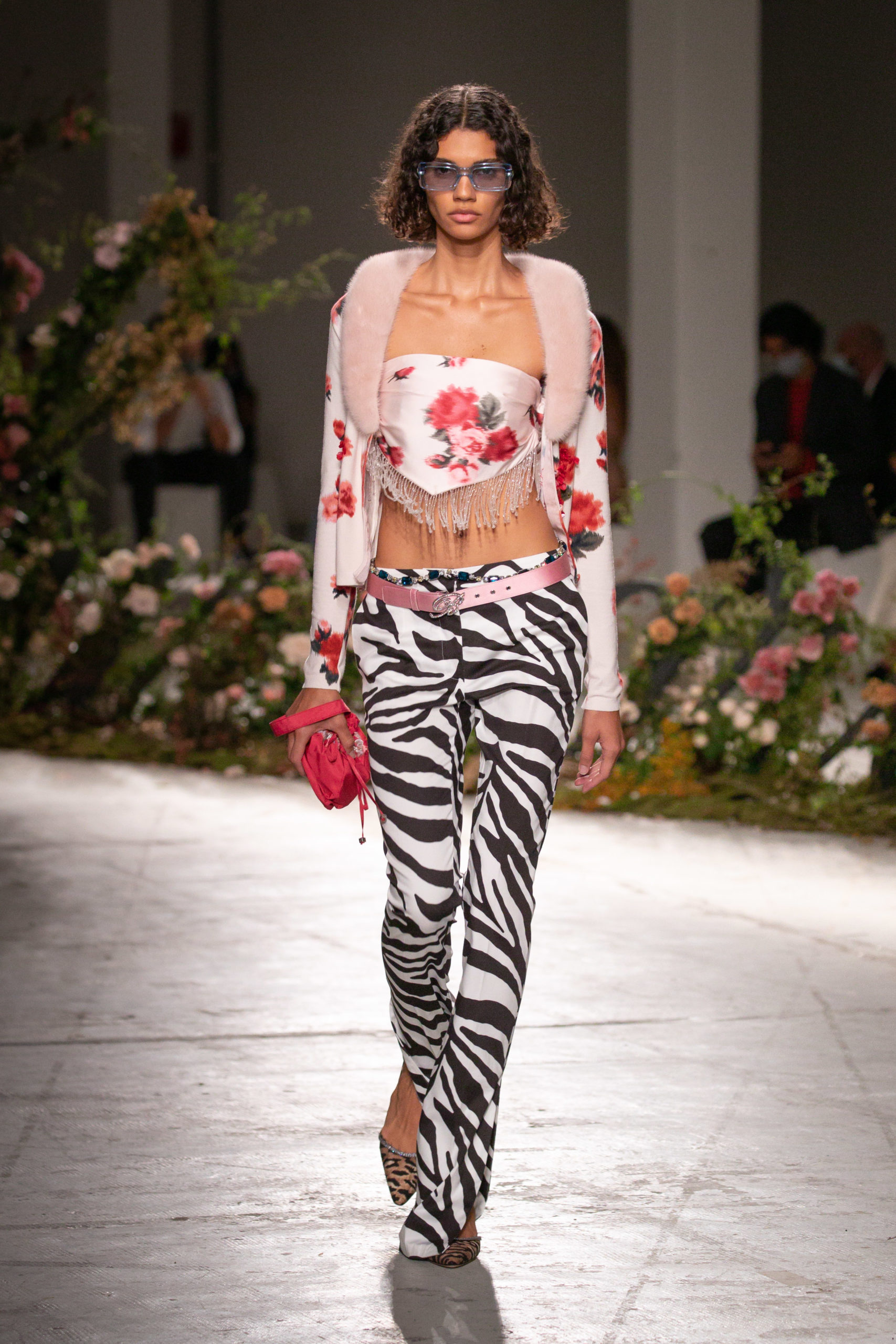 Rich embellishments are one of Blumarine’s glamourous trademarks, beautifying linear, slender shapes, almost minimal in their ‘90s ease. The bias-cut slipdresses; the lithe yet tight silhouettes; the sexy pencil skirts enhanced by plays of tiny ruffles would’ve certainly appealed to Sex and The City’s Carrie Bradshaw and to her playful, effortless style. Mixing with gusto contrasting prints — animalier and orals, zebra and butterflies — is an expressive exercise of eccentric freedom.