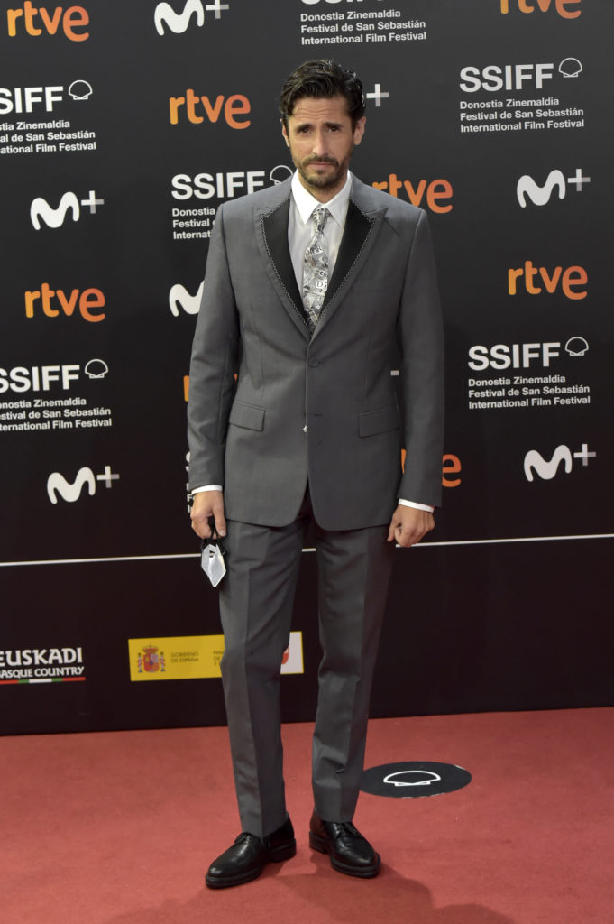 Juan Diego Botto wore a Dior Winter 2020-21 men’s collection grey wool peak lapel suit with fabric oppositions and stitching details at lapel, a classic white cotton shirt and a black and white silk tie with ‘Dior and Judy Blame’ print