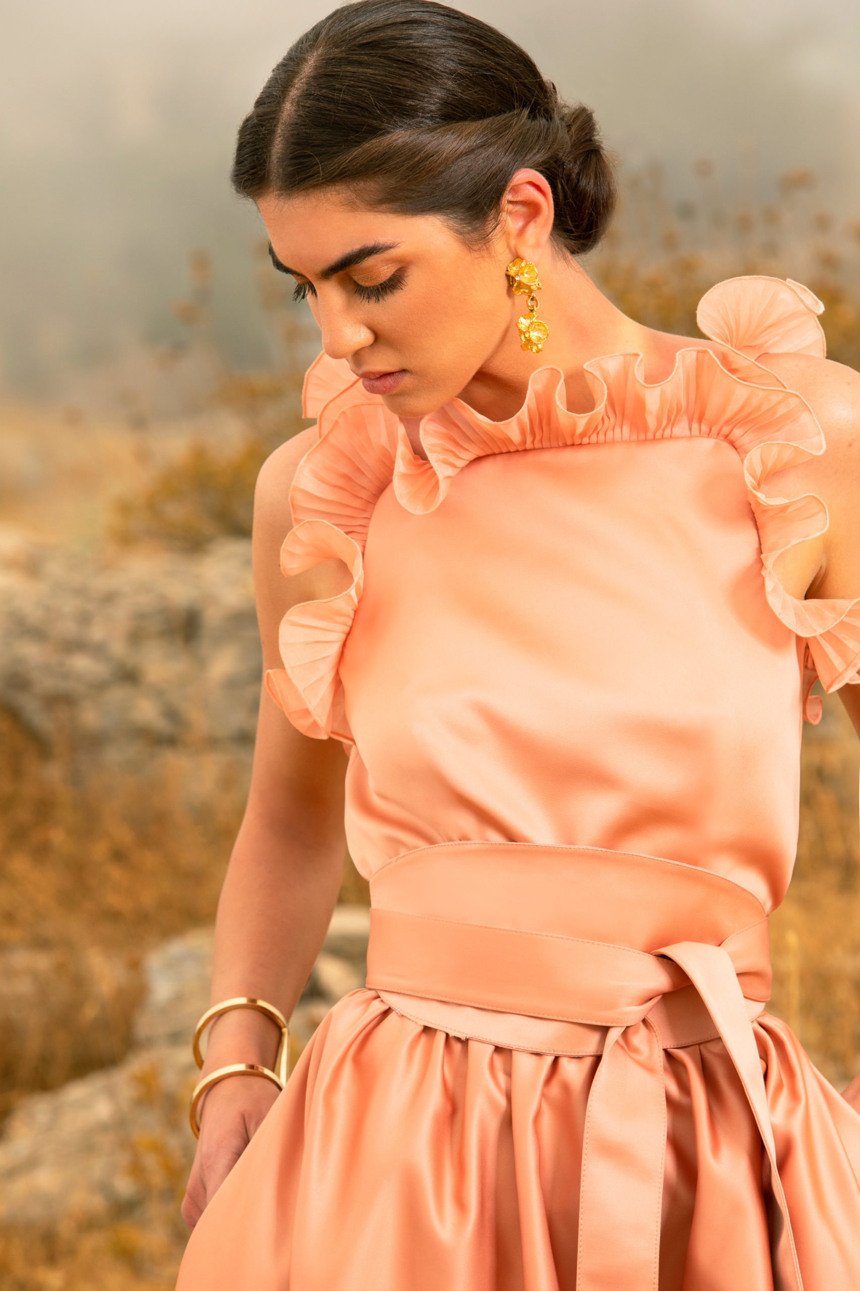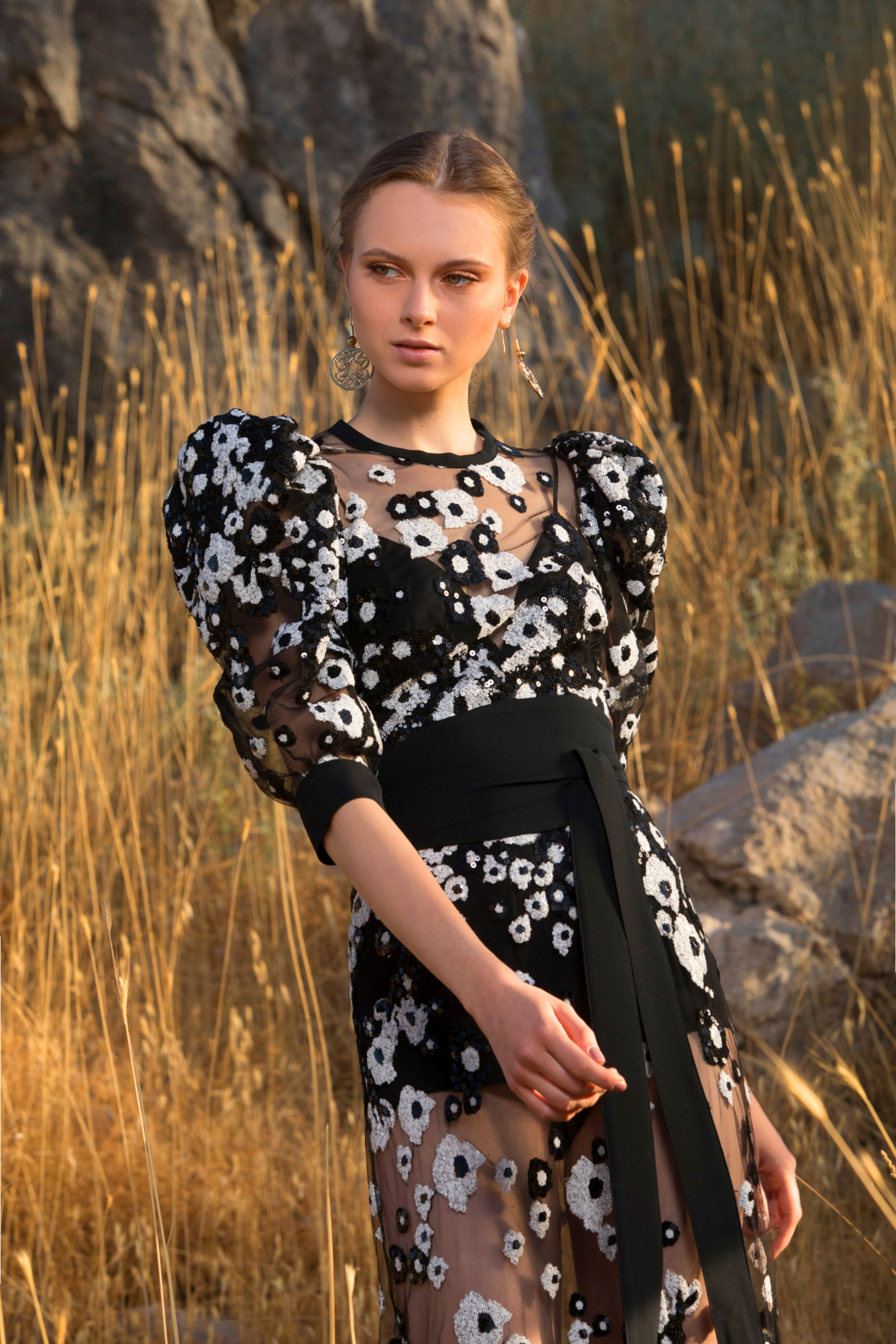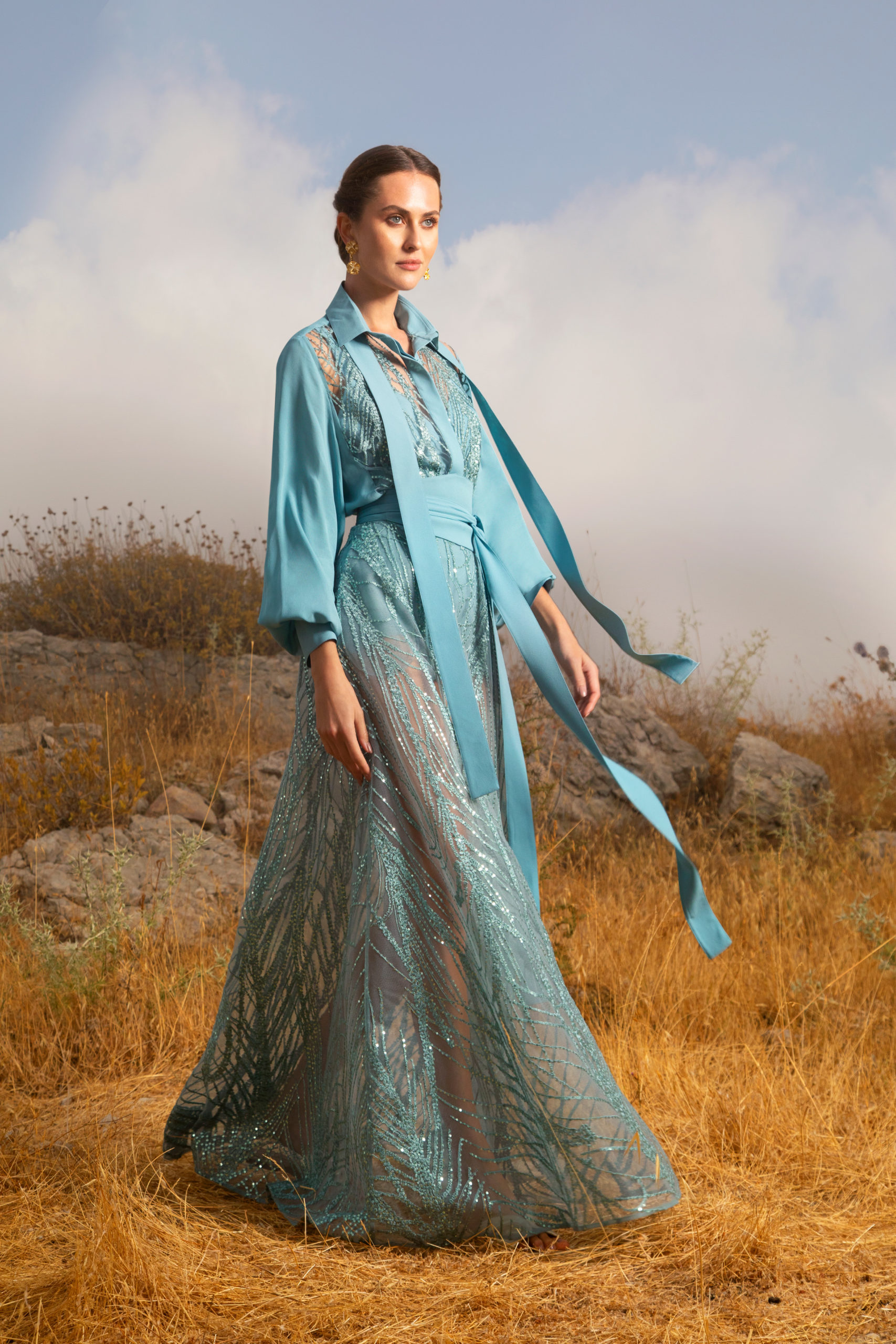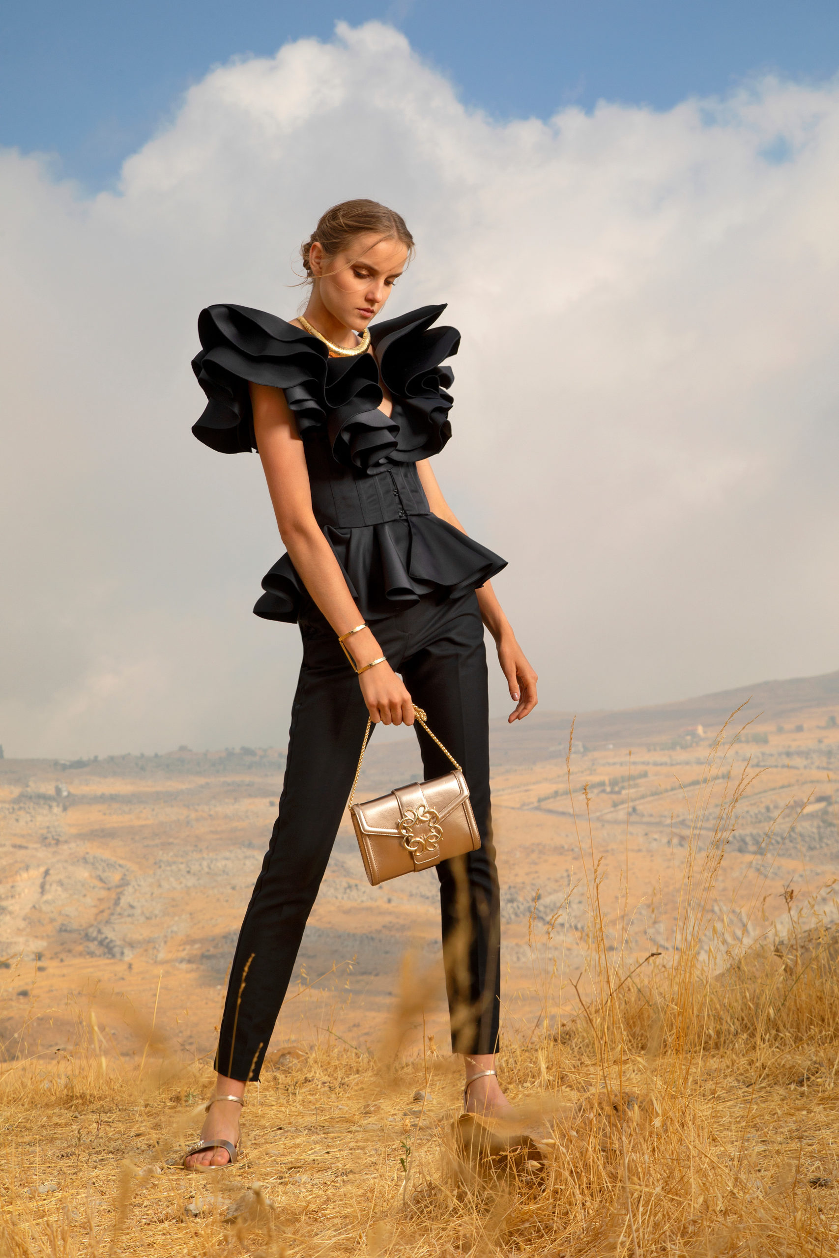 Avançant telle une traînée de poudre, ces femmes se rejoignent en une célébration subtile pour former ensuite un groupe éclatant. Les longues manches papillon, les bordures à volants froncés et les traines spectaculaires flottent à l’unisson au rythme de leurs danses. Pour le côté pratique, certaines femmes complètent leurs looks avec des sacs à main monogrammé ELIE SAAB, ou avec des lunettes à verres miroirs et larges montures carrées pour le côté mystérieux. Elles se chaussent de ballerines en cuir doré à motifs tourbillonnants leur permettent d’évoluer à leur aise. La ceinture ELIE SAAB, qui épouse la taille, apporte la touche finale à chacune de ces silhouettes.