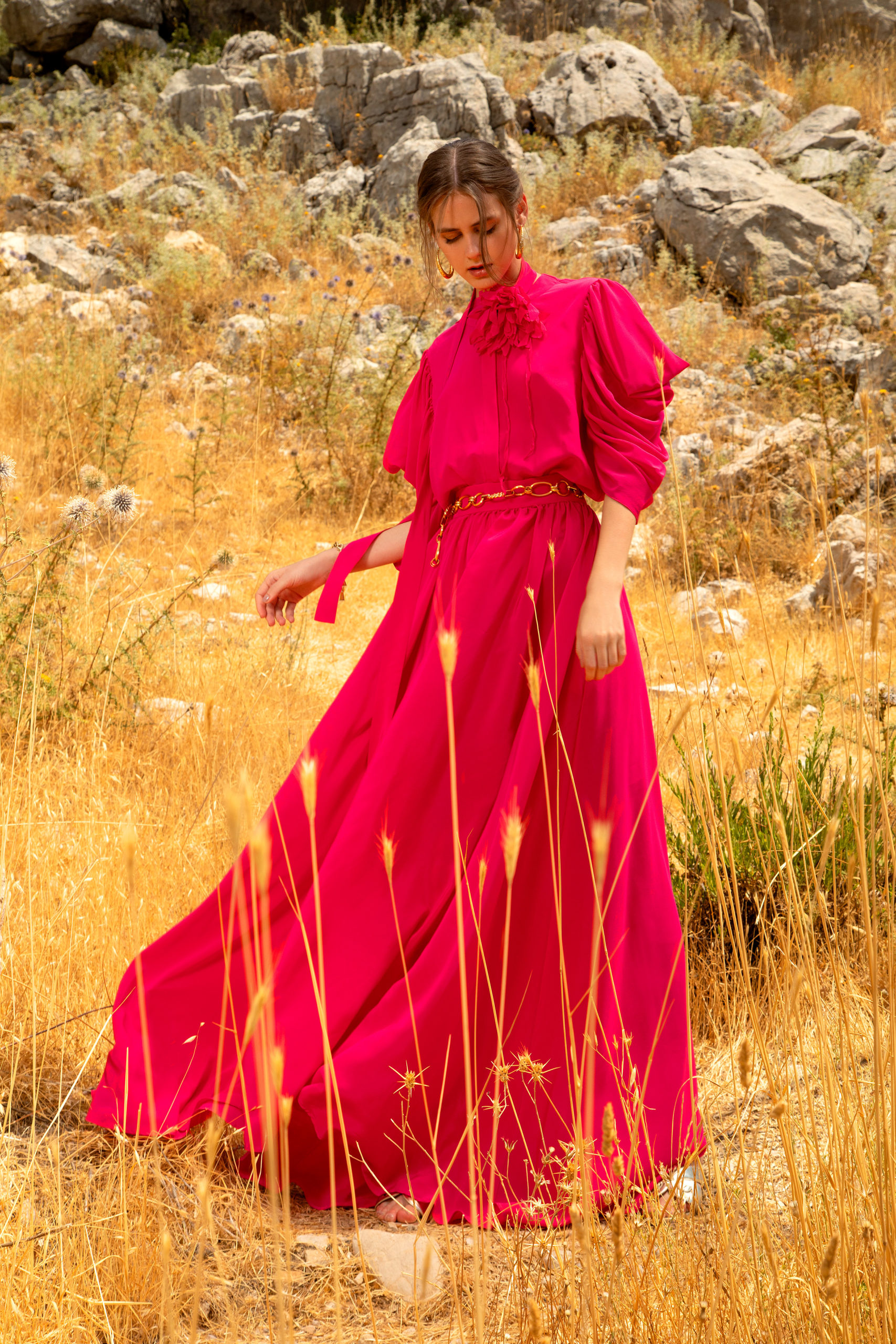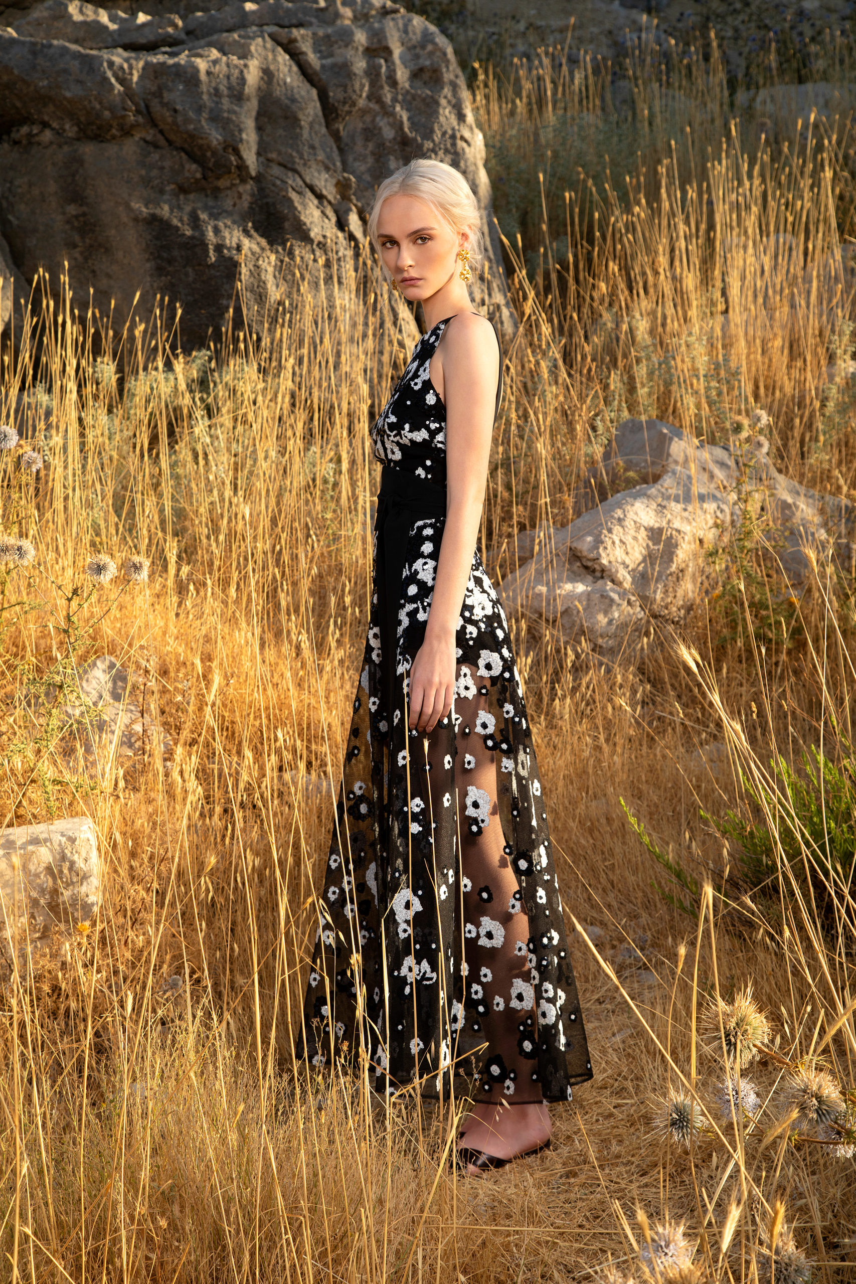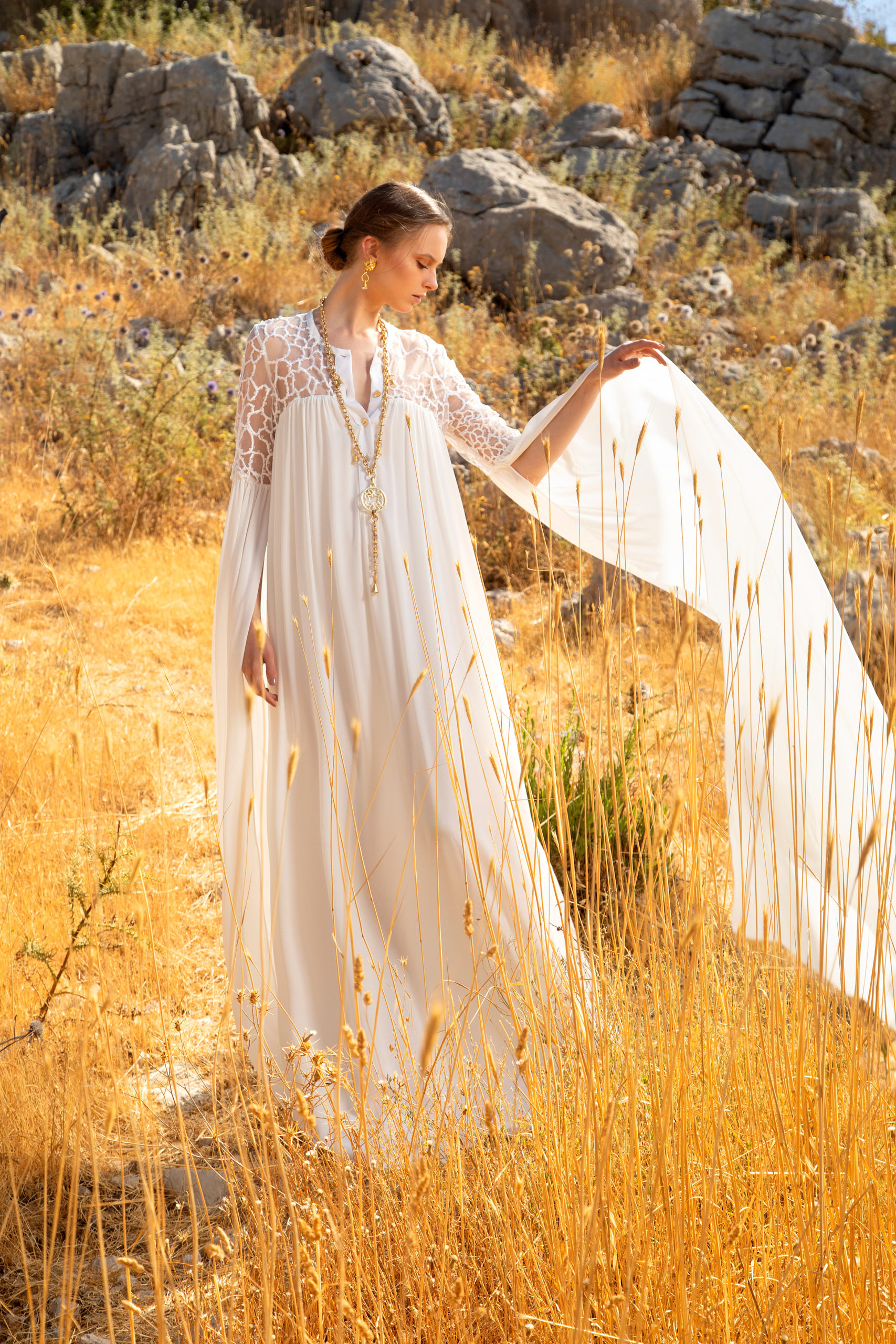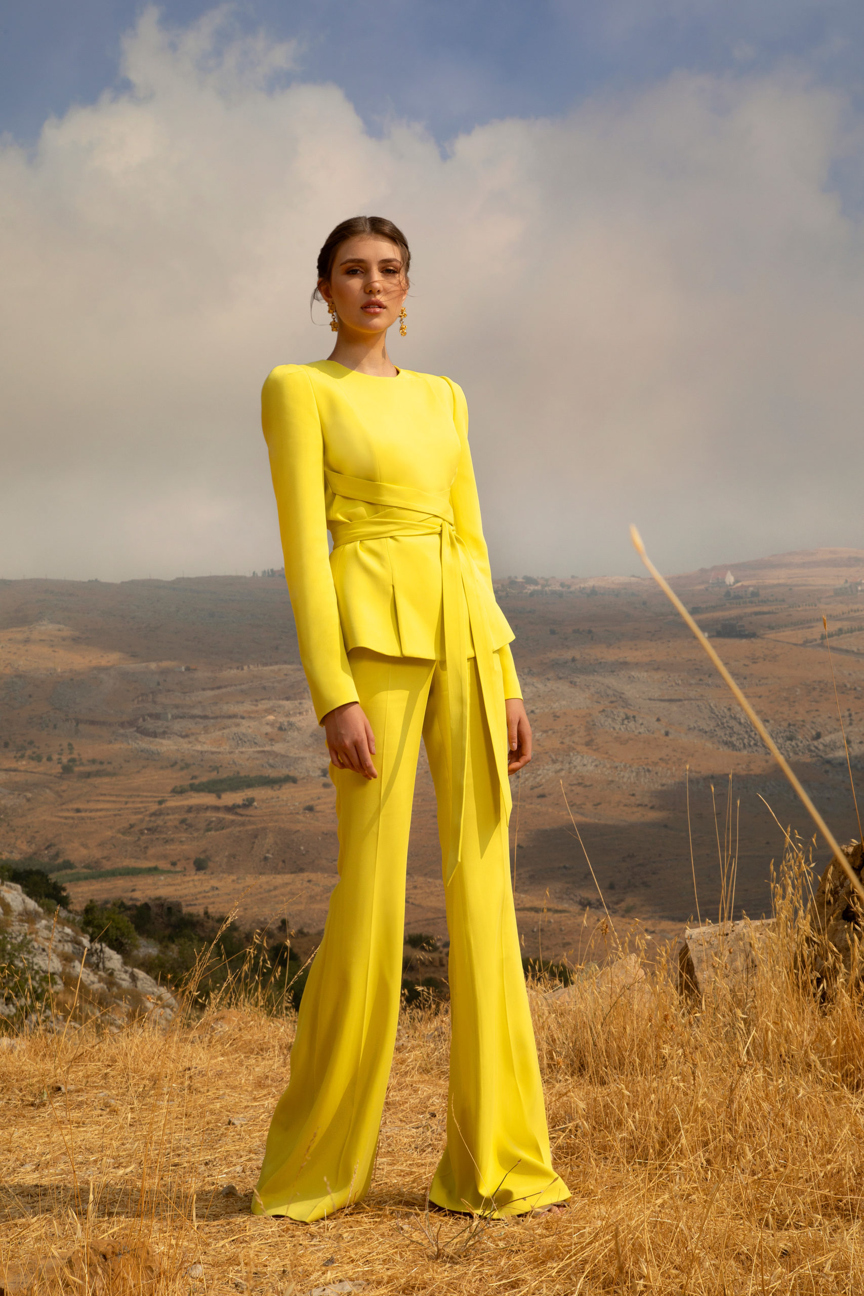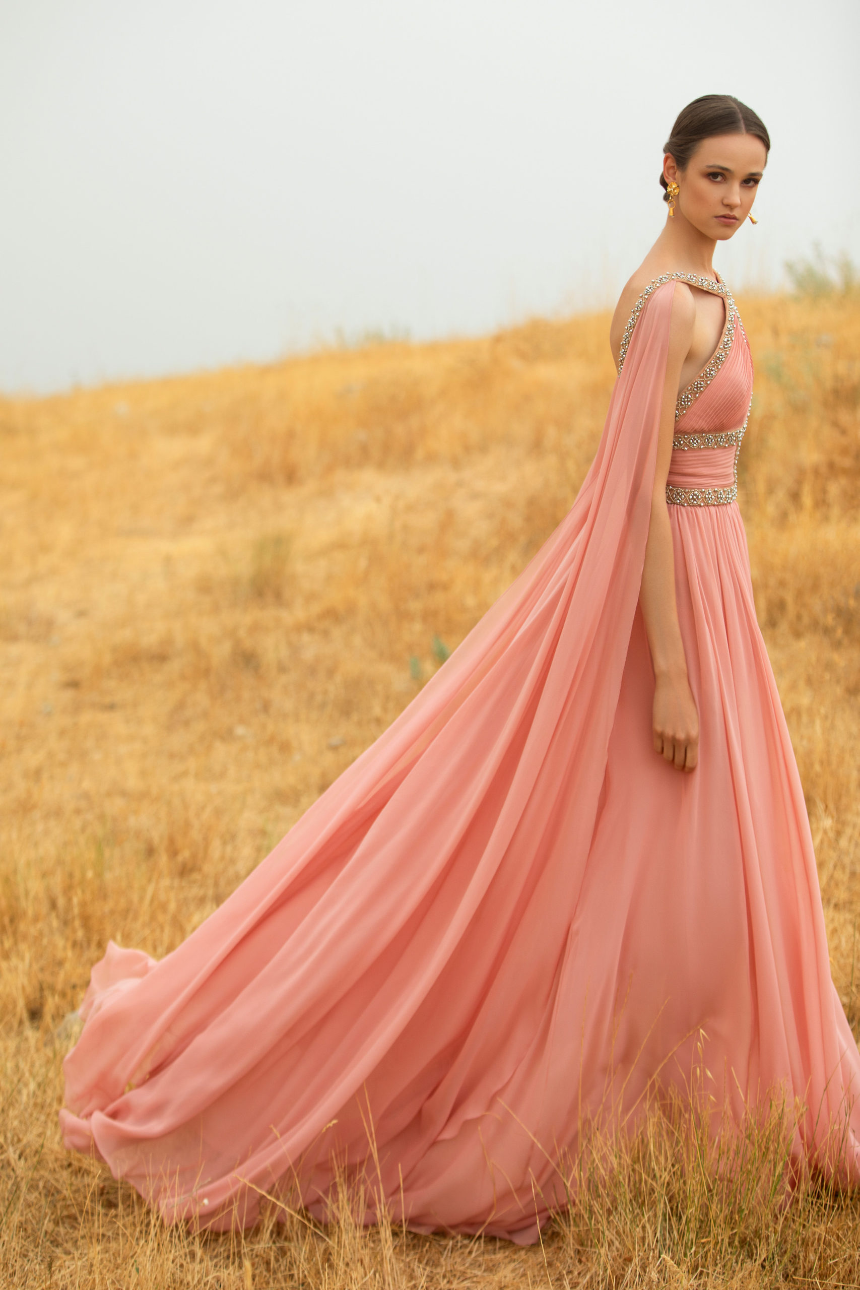 Avançant telle une traînée de poudre, ces femmes se rejoignent en une célébration subtile pour former ensuite un groupe éclatant. Les longues manches papillon, les bordures à volants froncés et les traines spectaculaires flottent à l’unisson au rythme de leurs danses. Pour le côté pratique, certaines femmes complètent leurs looks avec des sacs à main monogrammé ELIE SAAB, ou avec des lunettes à verres miroirs et larges montures carrées pour le côté mystérieux. Elles se chaussent de ballerines en cuir doré à motifs tourbillonnants leur permettent d’évoluer à leur aise. La ceinture ELIE SAAB, qui épouse la taille, apporte la touche finale à chacune de ces silhouettes.