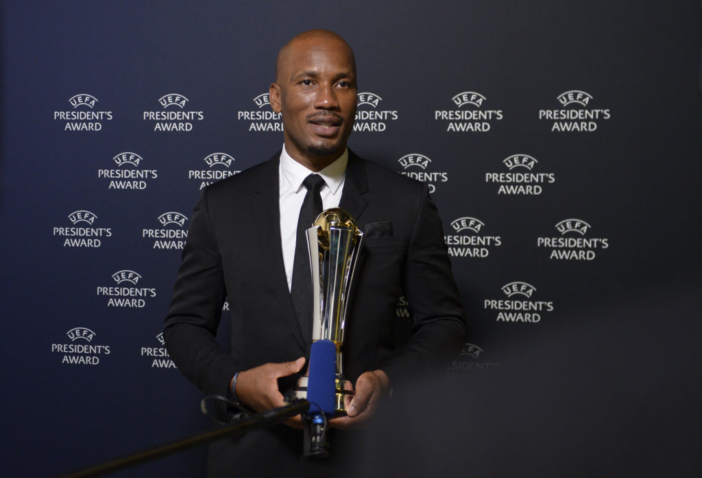 GENEVA, SWITZERLAND – OCTOBER 01: UEFA President’s award recipient Dider Drogba during the UEFA Champions League Group Stage Draw at the RTS studios on October 01, 2020, in Geneva, Switzerland (Photo by Robert Hradil – UEFA/UEFA via Getty Images)