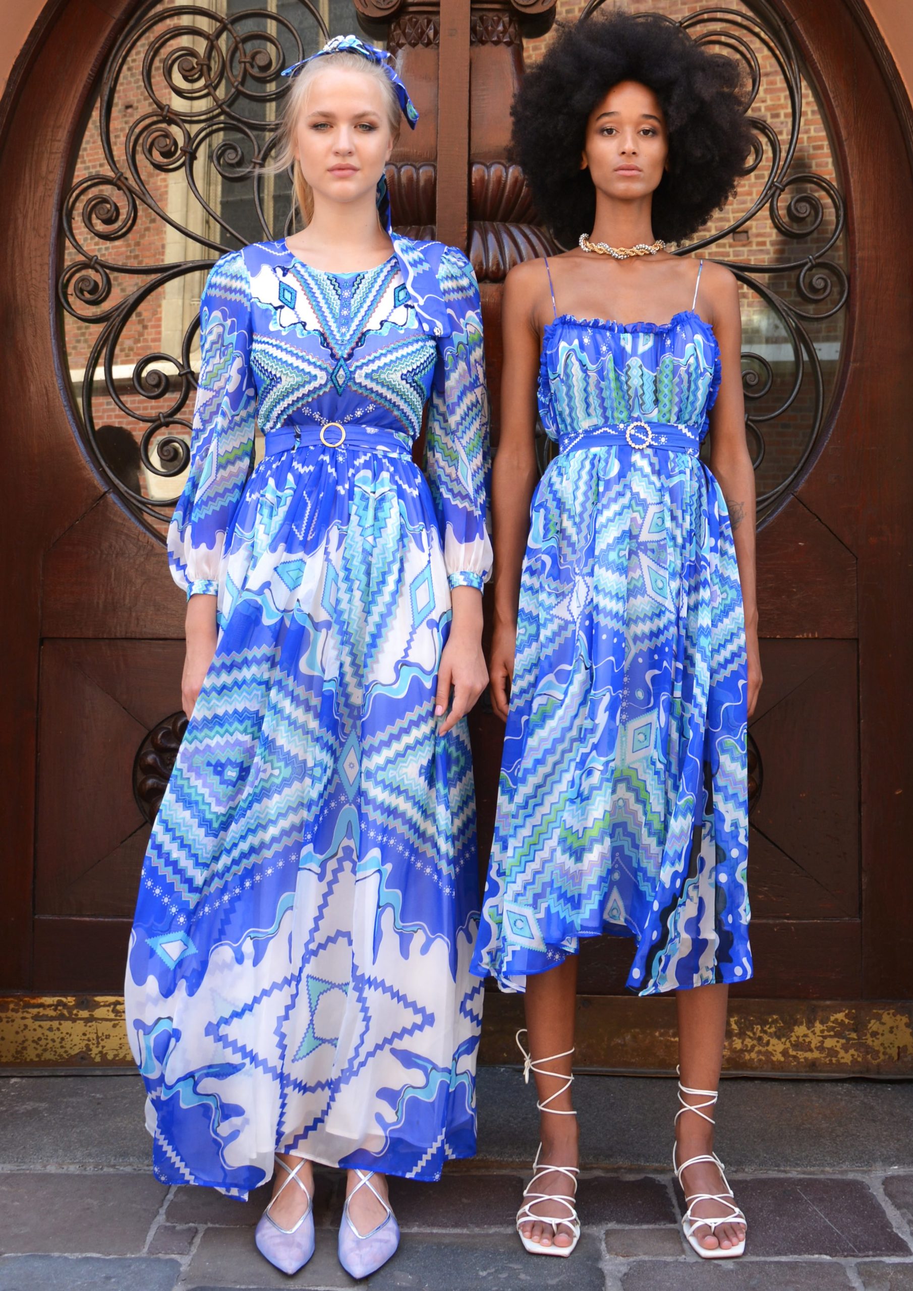 Drops, bubbles in shades of blue and aqua green printed on the light chiffon make those dresses that smell of spring fluid.