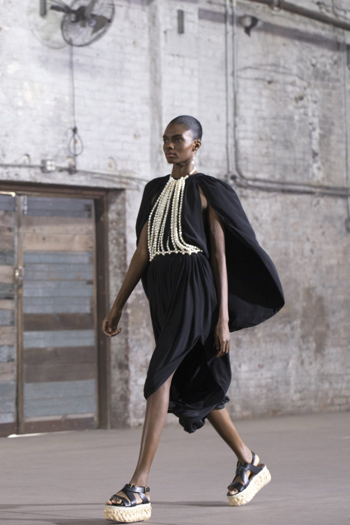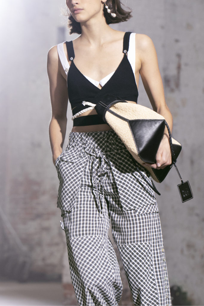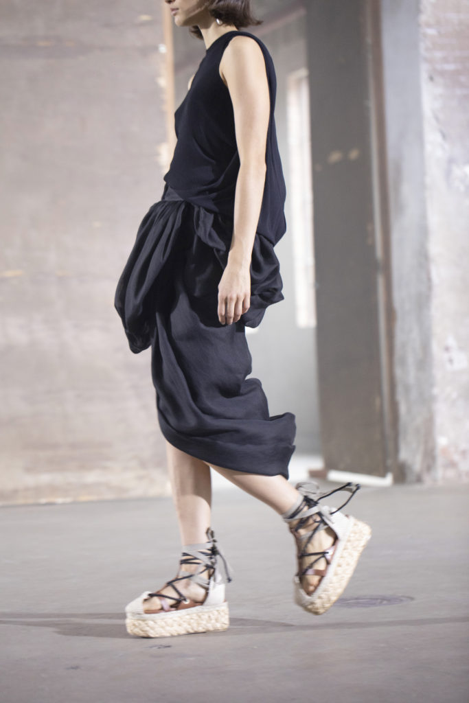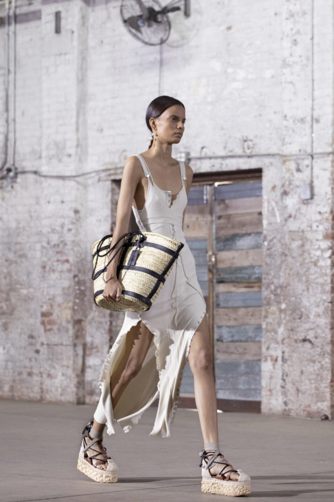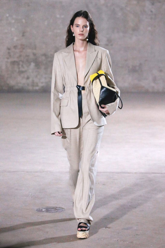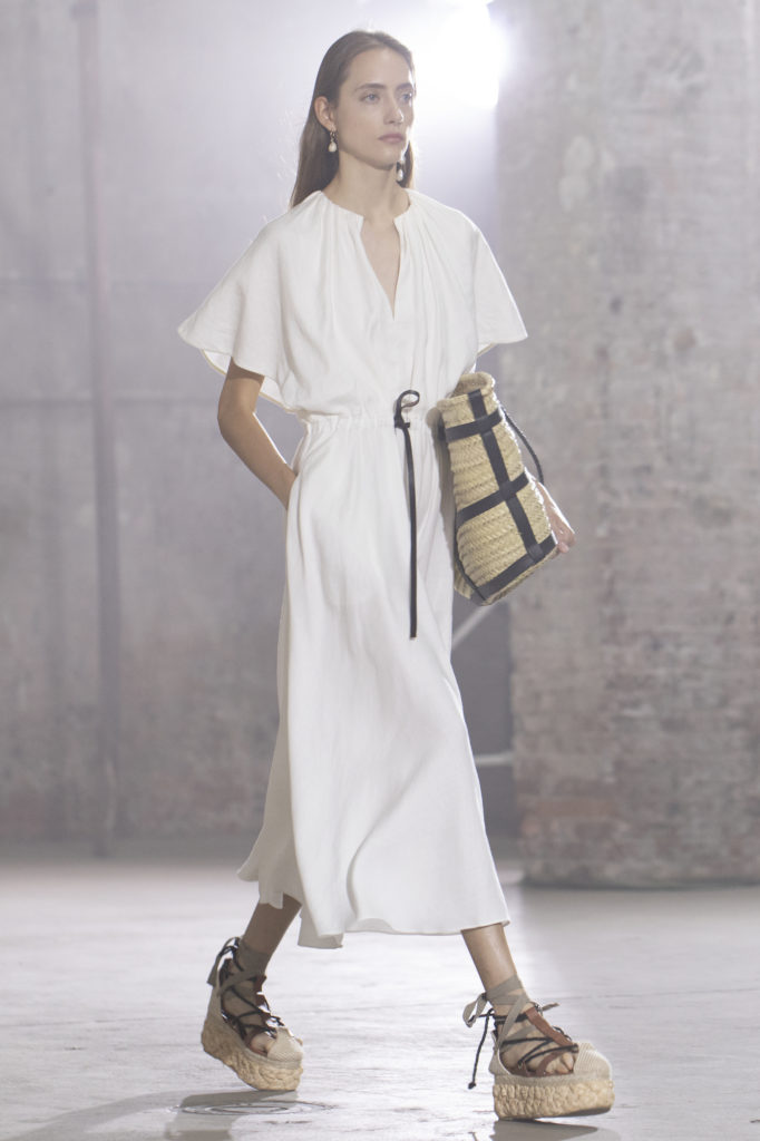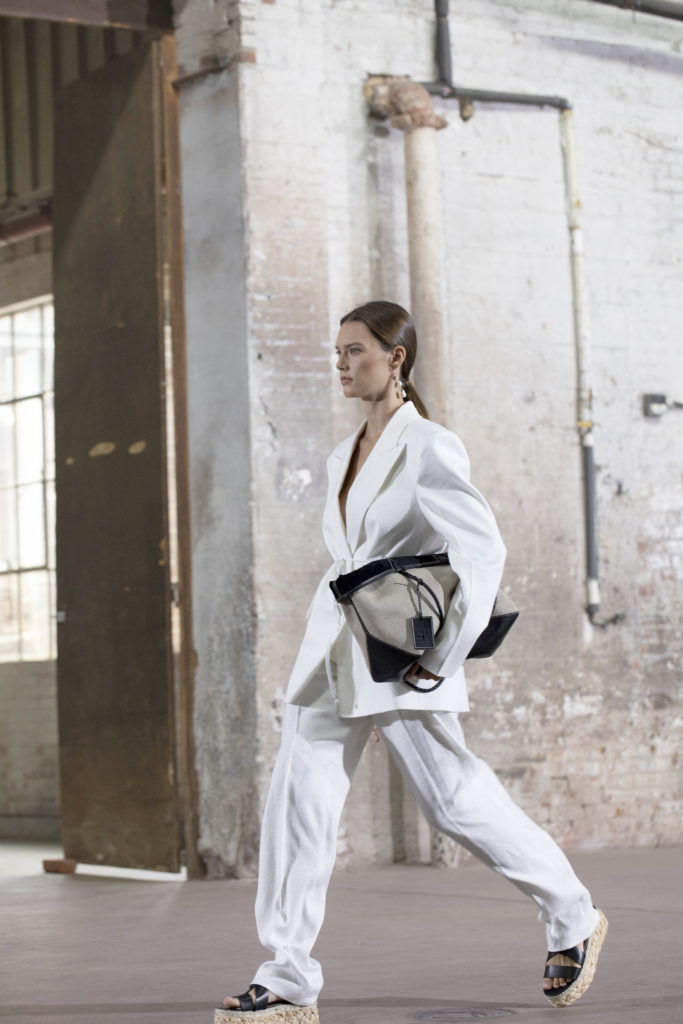 For Spring, Joseph worked with humble materials, sculptural volumes, and minimalist prints while drawing on varied textures to add a hint of imperfection. Grounding accessories include braided platforms, a caged raffia tote for Summer, reversible textured totes, thick belts that were constructed with more flexibility and ease, and Swarovski crystal pearl caged body pieces.