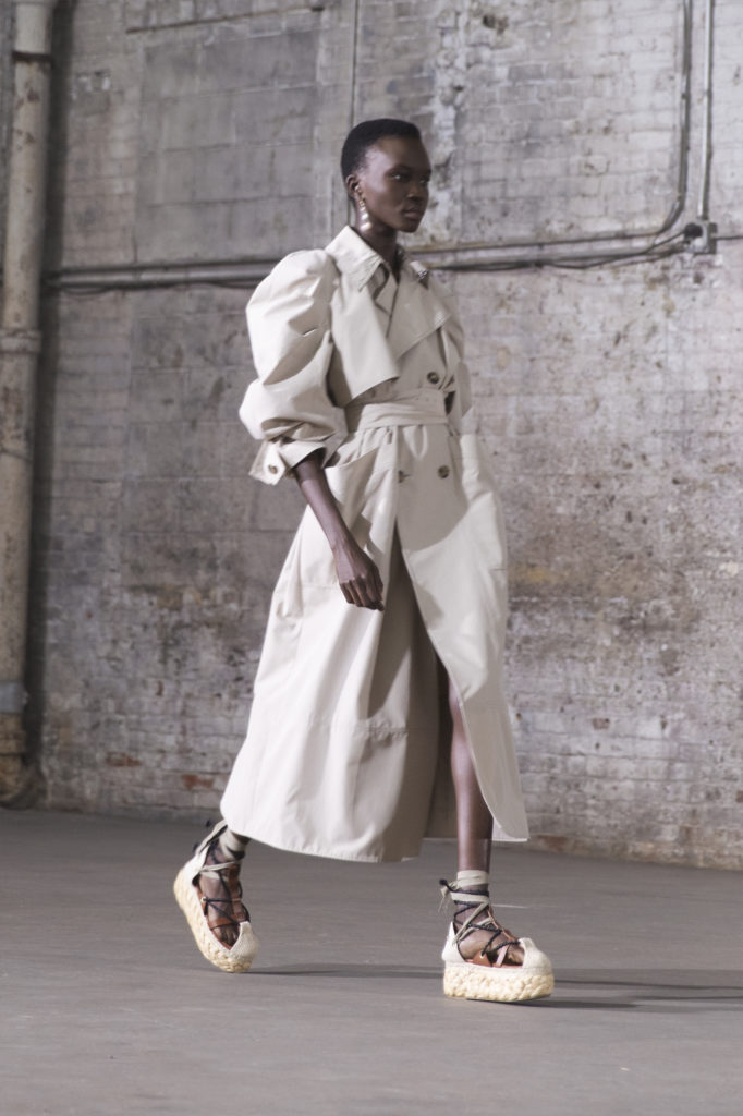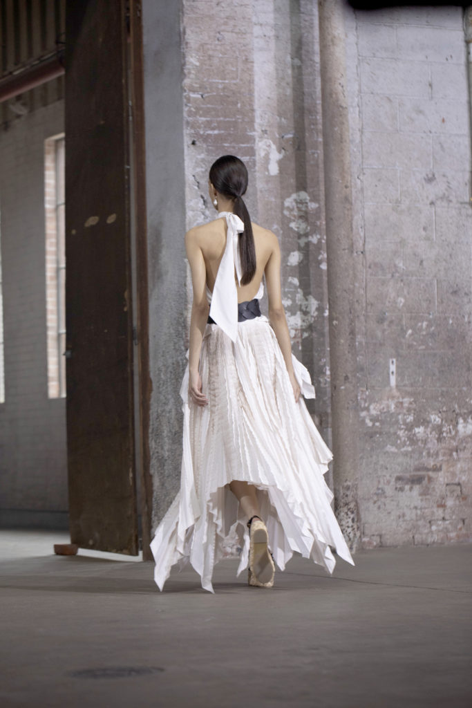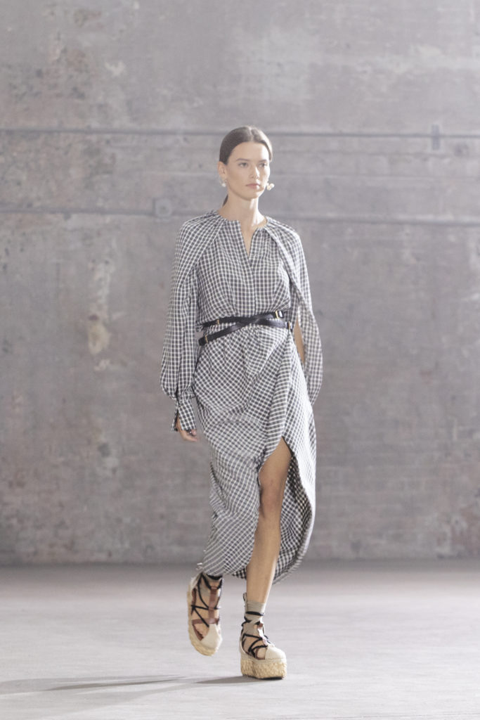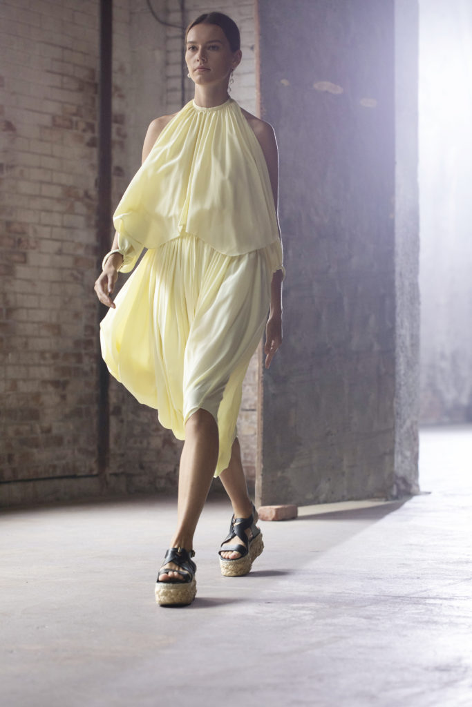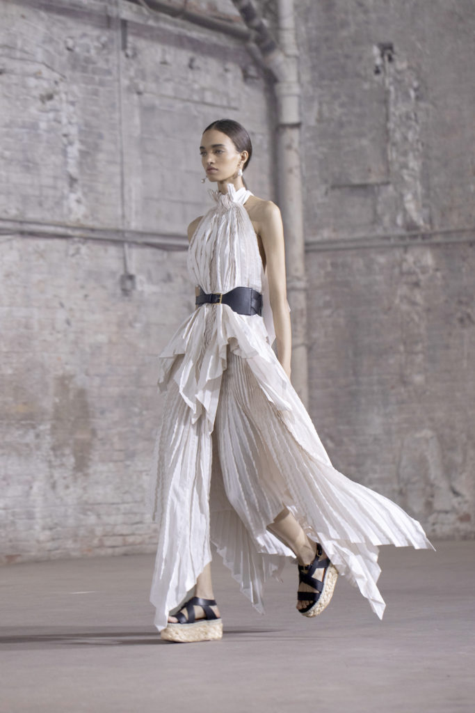 The iconic Altuzarra suiting is reimagined with an ‘80s influence on tailoring and proportions: drapey and oversized blazers, wide-leg pants, and adjustable belts to nip the waist and reign in volume. As the collection progresses, the silhouettes become unbound ending with unabashed, liberated volume in a double layered handkerchief hem dress.