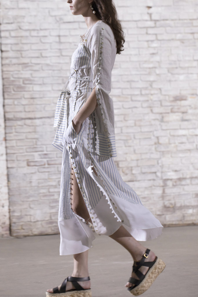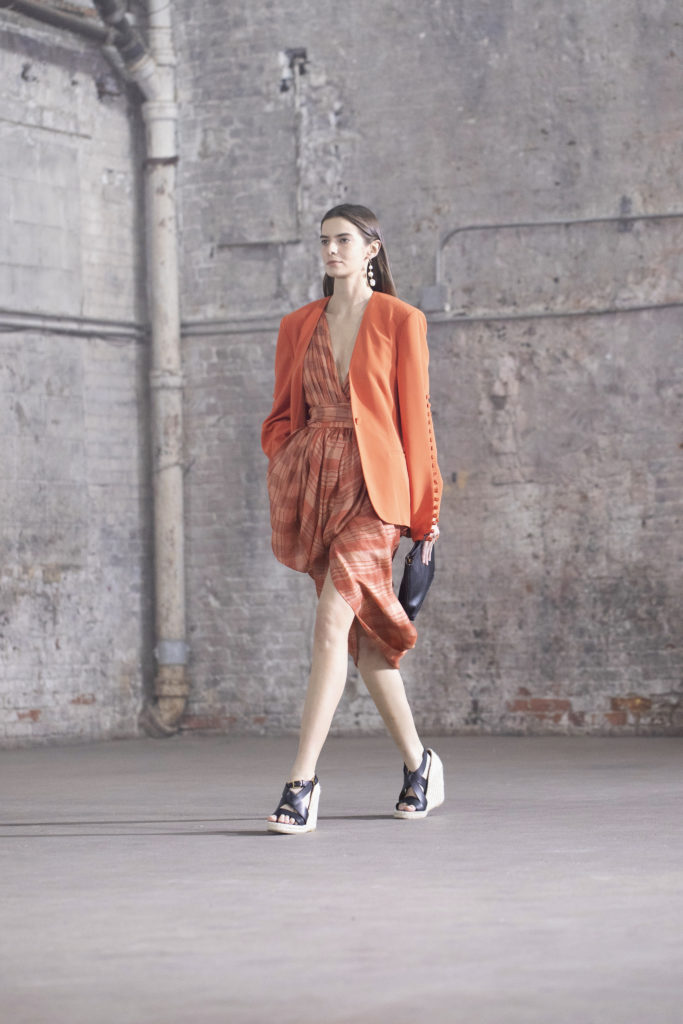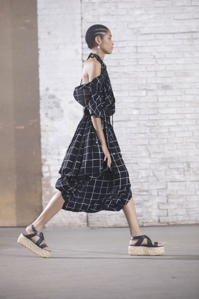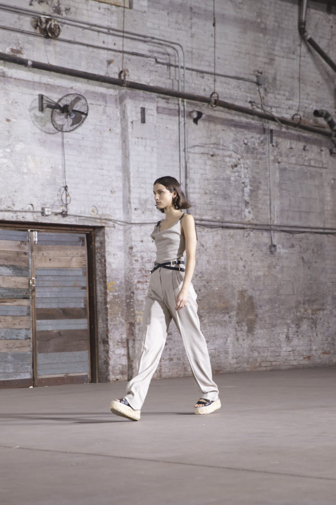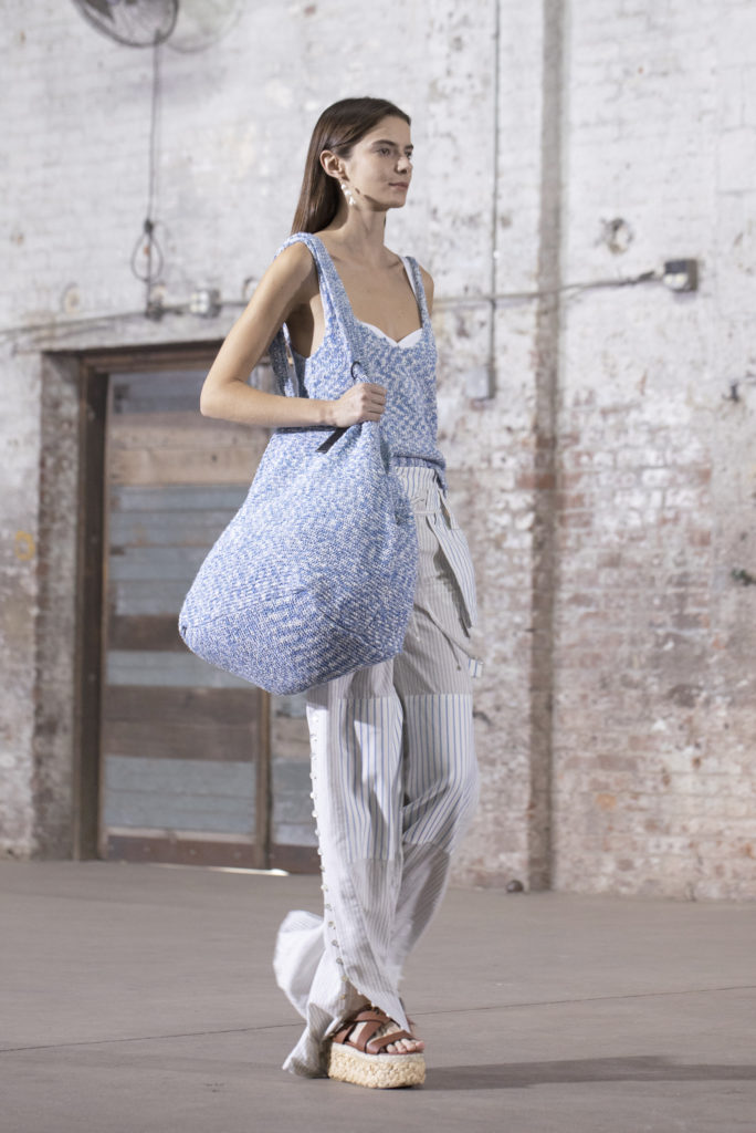 The iconic Altuzarra suiting is reimagined with an ‘80s influence on tailoring and proportions: drapey and oversized blazers, wide-leg pants, and adjustable belts to nip the waist and reign in volume. As the collection progresses, the silhouettes become unbound ending with unabashed, liberated volume in a double layered handkerchief hem dress.
