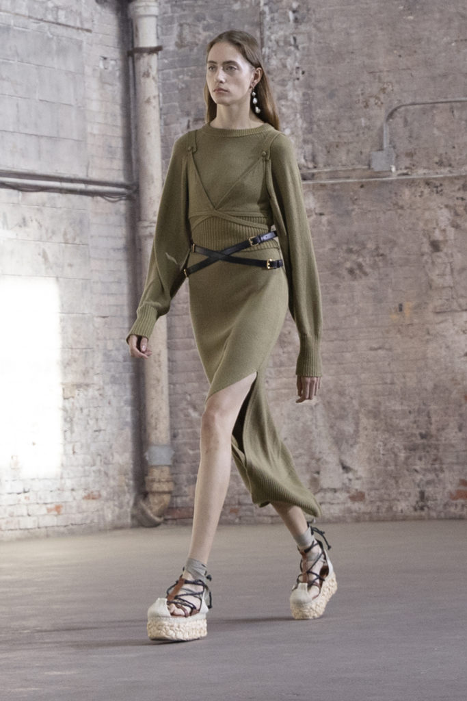 Set against the raw backdrop of the space, the collection combines divergent emotions of ease and polish, expressed in a range of designs that evolve through the show. Joseph embraced volume for Spring in new shirtdress and skirt designs, along with a classic trench updated with ballooning sleeves. The cathartic silhouettes meet restrained volume through wrapping, darting, and billowing yet refined peplums. Knits were rethought with wrapped bodices, cold shoulders, and self-covered multi-button details that offer versatile wearability. Committed to sustainable innovation in design, the collection includes a colorful knitted capsule that upcycles deadstock fabrics from past seasons, creating one-of-a-kind pieces.