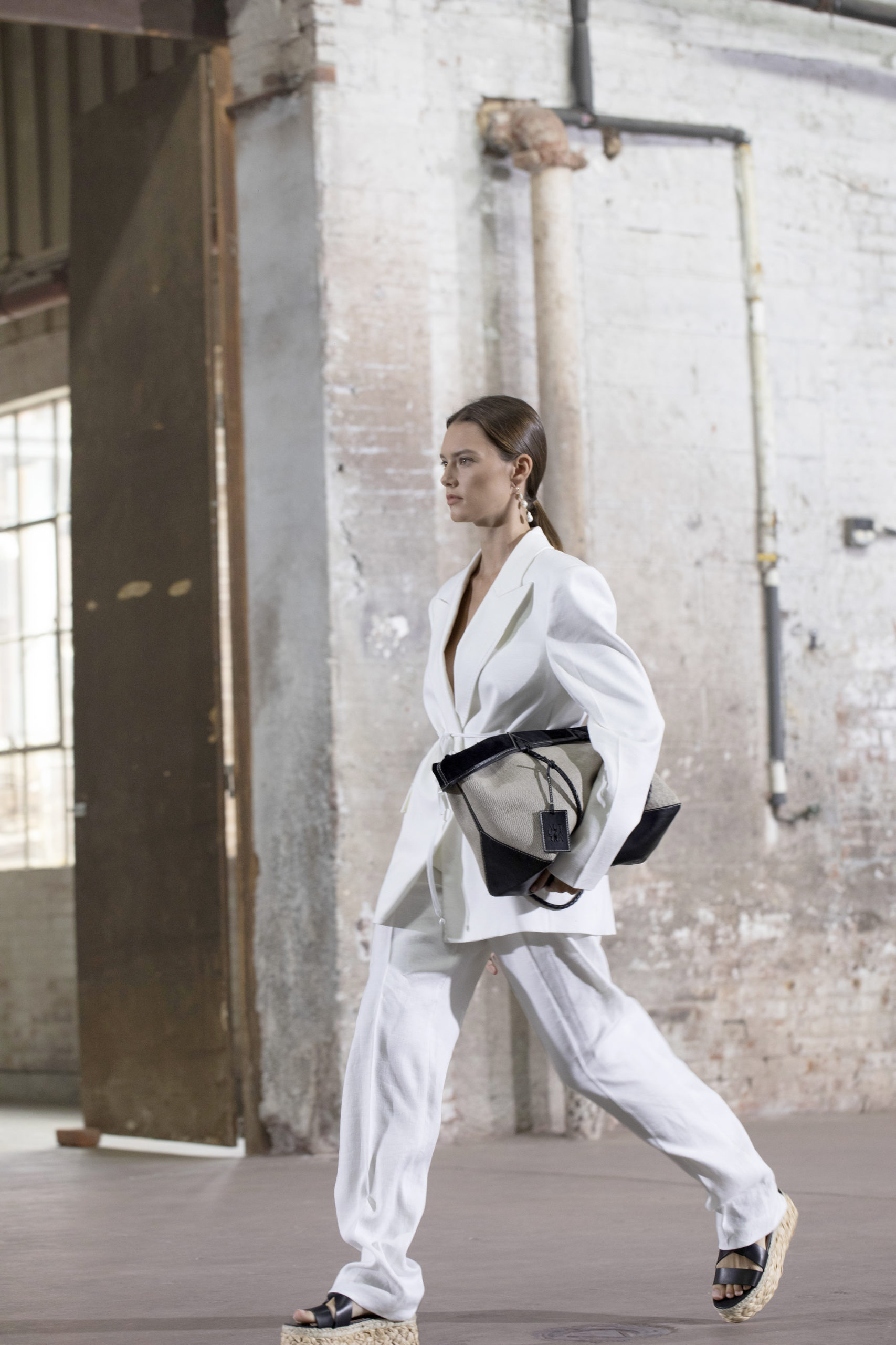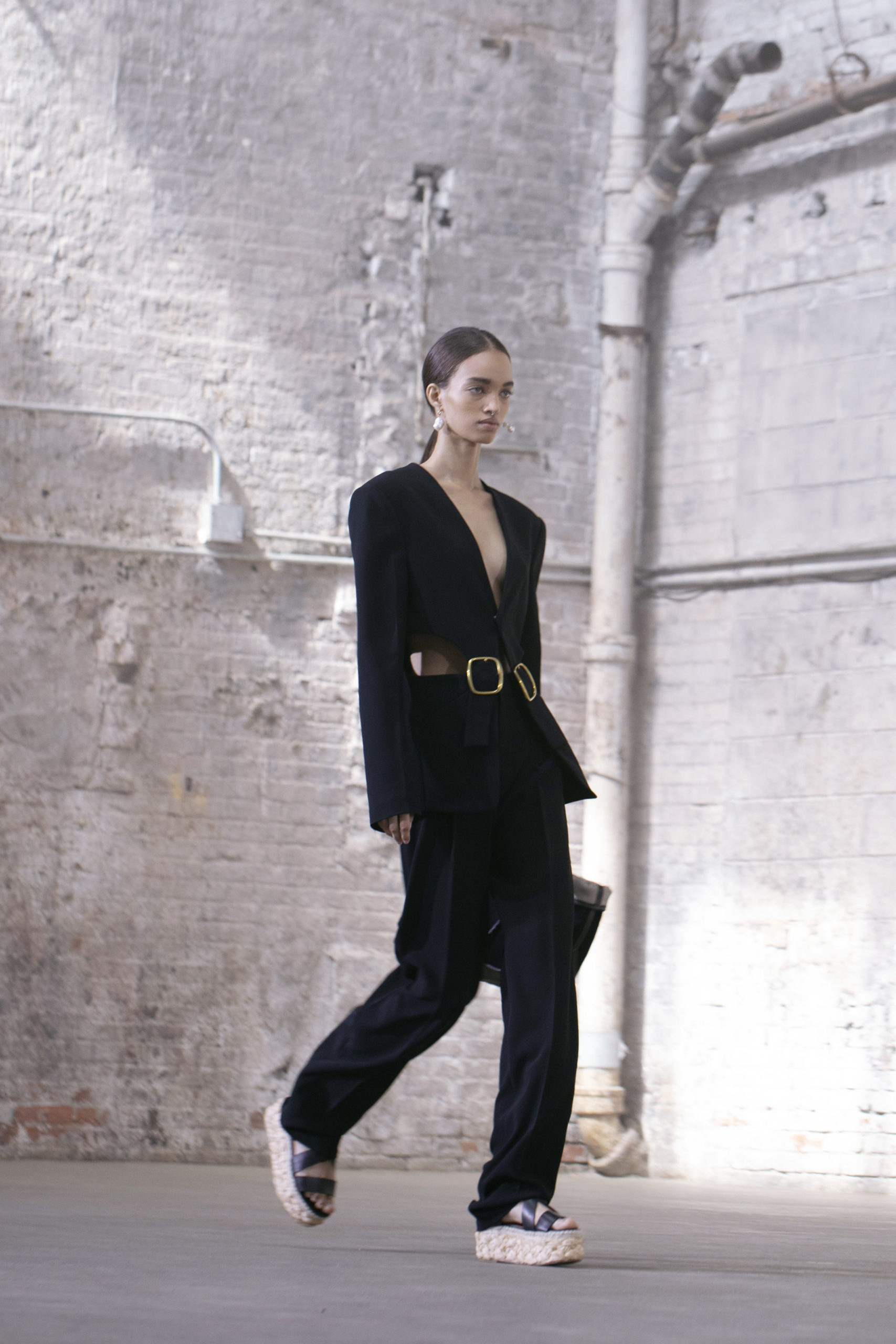 The iconic Altuzarra suiting is reimagined with an ‘80s influence on tailoring and proportions: drapey and oversized blazers, wide-leg pants, and adjustable belts to nip the waist and reign in volume. As the collection progresses, the silhouettes become unbound ending with unabashed, liberated volume in a double layered handkerchief hem dress.