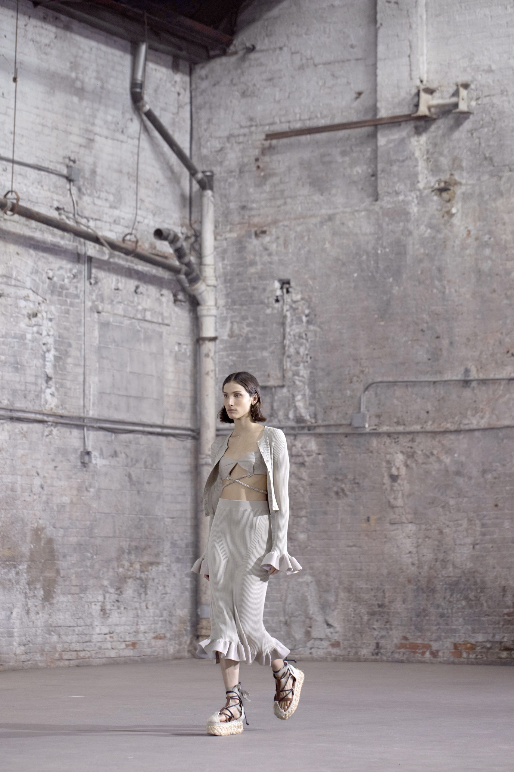 Set against the raw backdrop of the space, the collection combines divergent emotions of ease and polish, expressed in a range of designs that evolve through the show. Joseph embraced volume for Spring in new shirtdress and skirt designs, along with a classic trench updated with ballooning sleeves. The cathartic silhouettes meet restrained volume through wrapping, darting, and billowing yet refined peplums. Knits were rethought with wrapped bodices, cold shoulders, and self-covered multi-button details that offer versatile wearability. Committed to sustainable innovation in design, the collection includes a colorful knitted capsule that upcycles deadstock fabrics from past seasons, creating one-of-a-kind pieces.