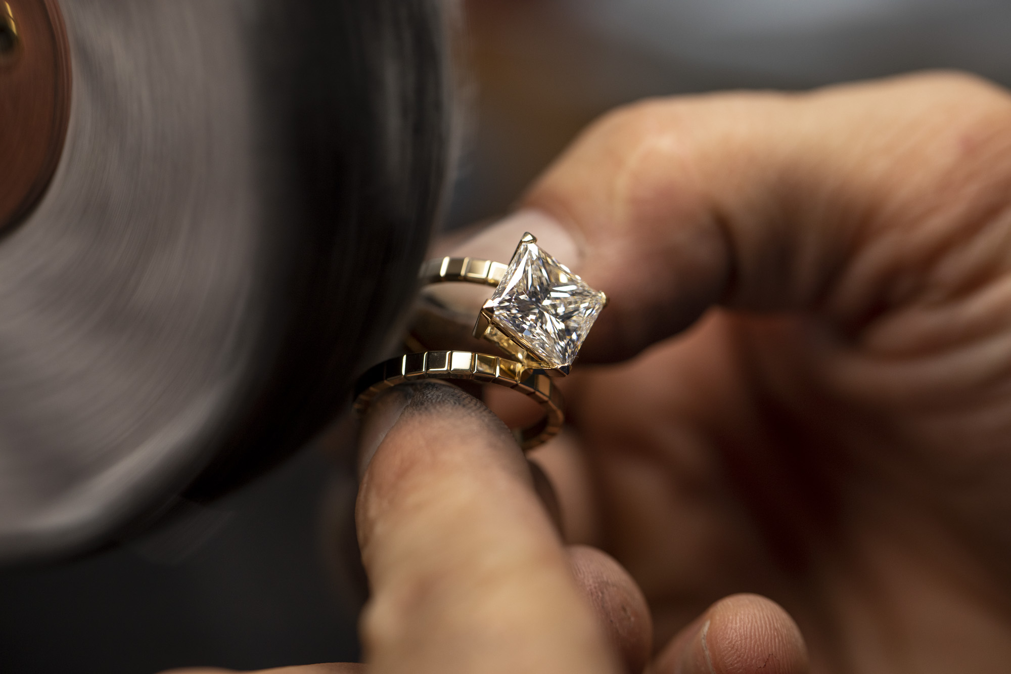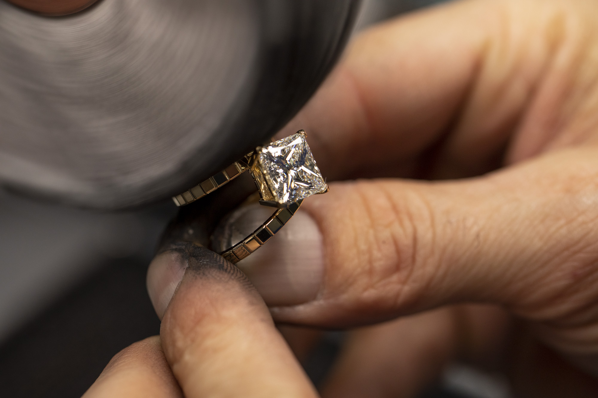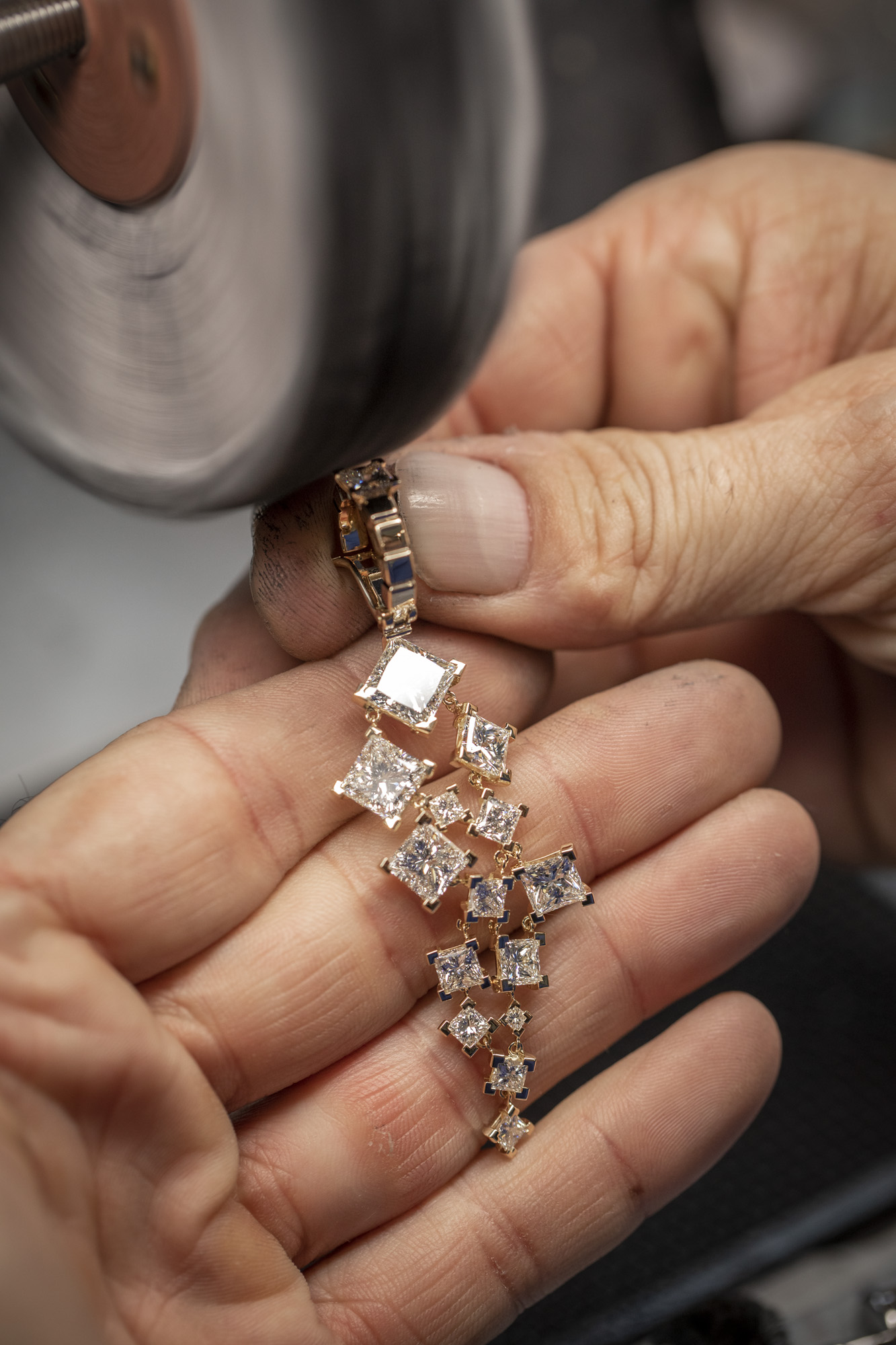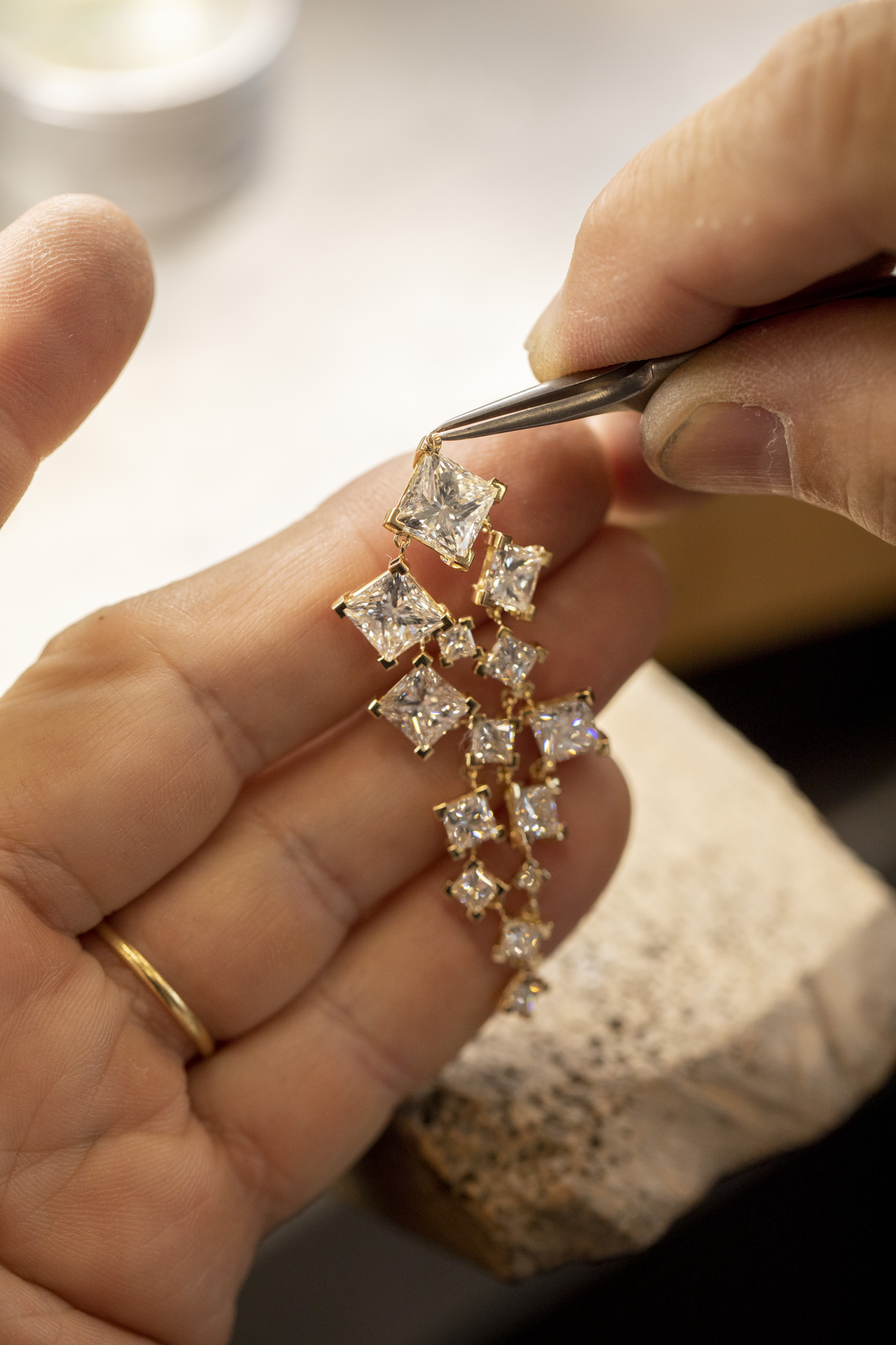 Le résultat est un ensemble de boucles d’oreilles polyvalent et en constante évolution qui convient à chaque moment de la journée ainsi qu’une magnifique bague comportant un diamant taille princesse de 5,73 carats.