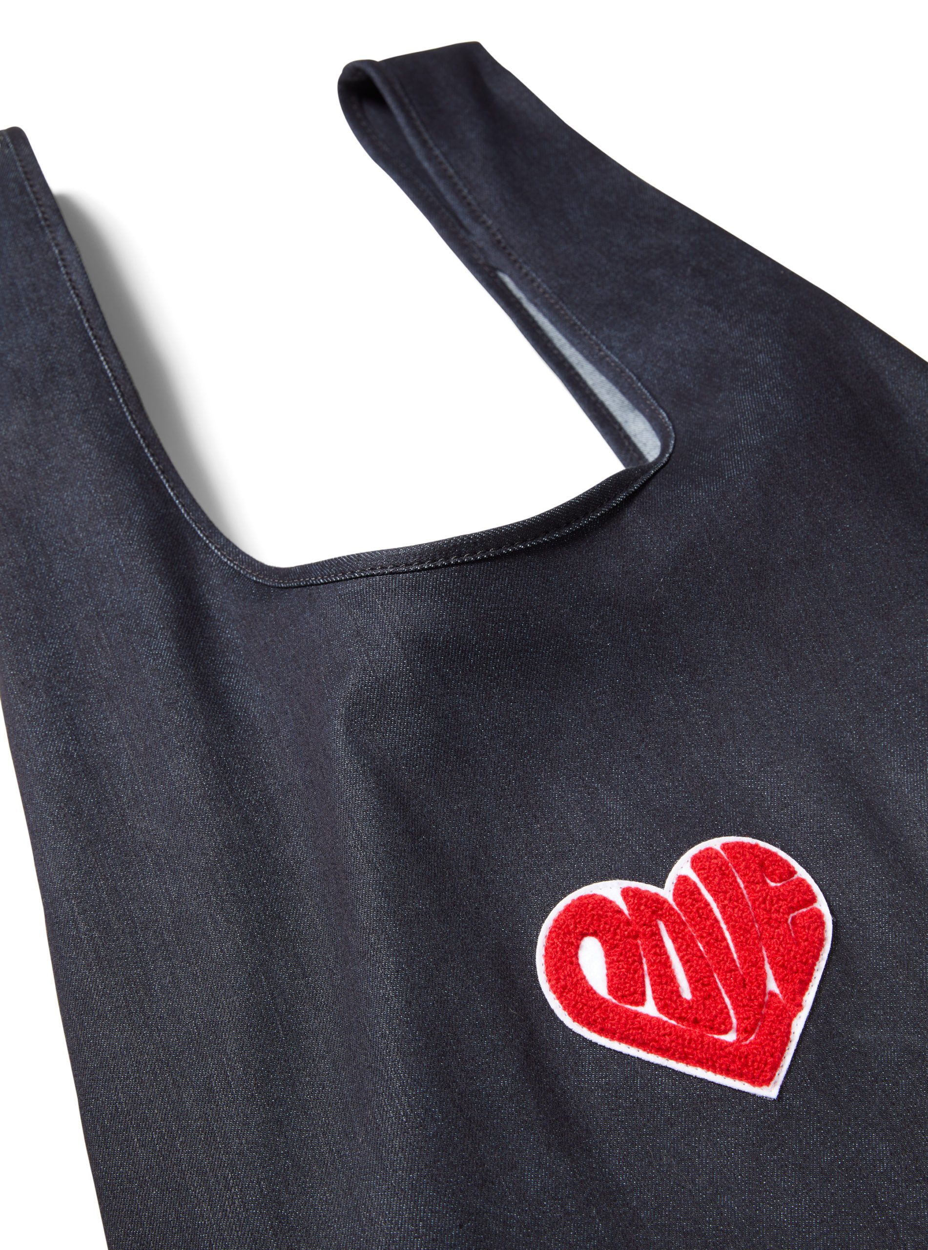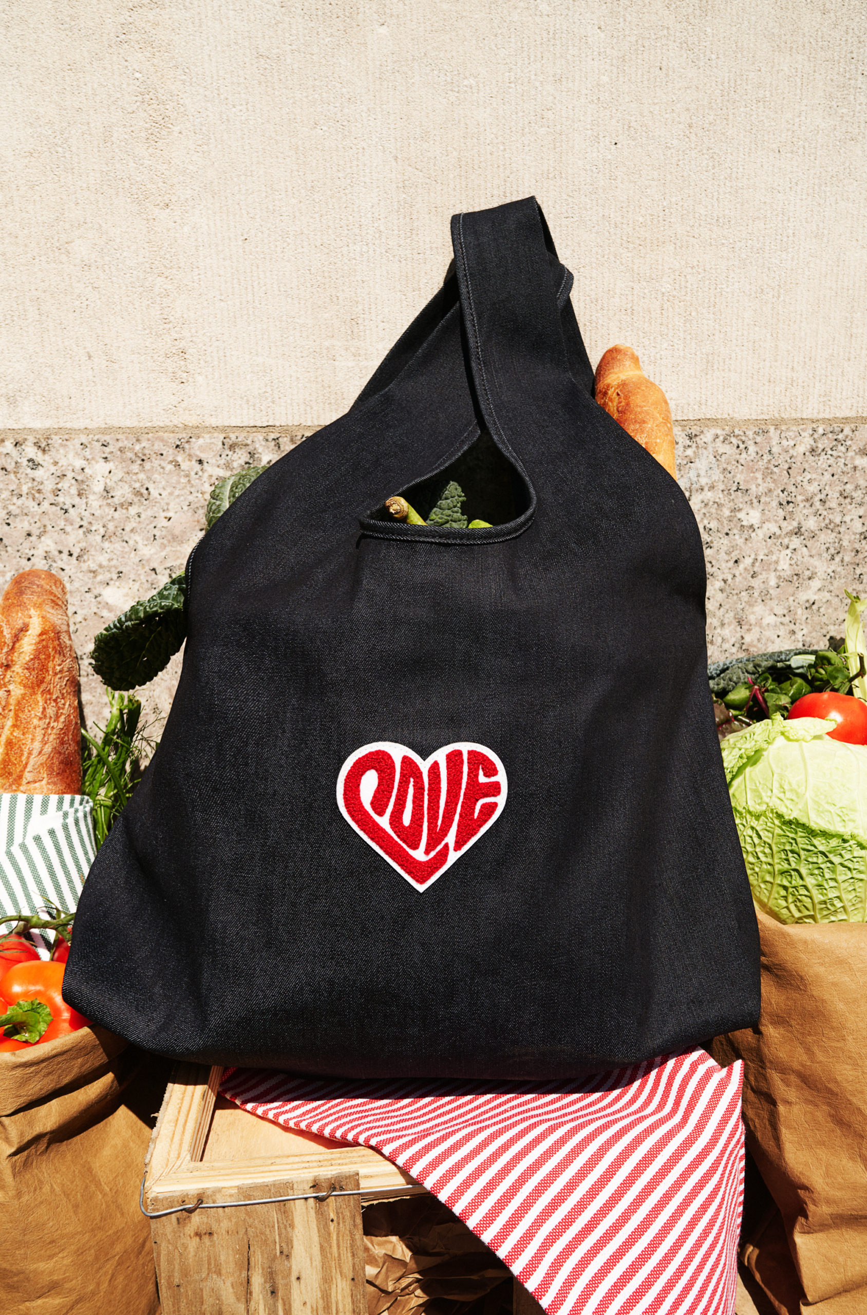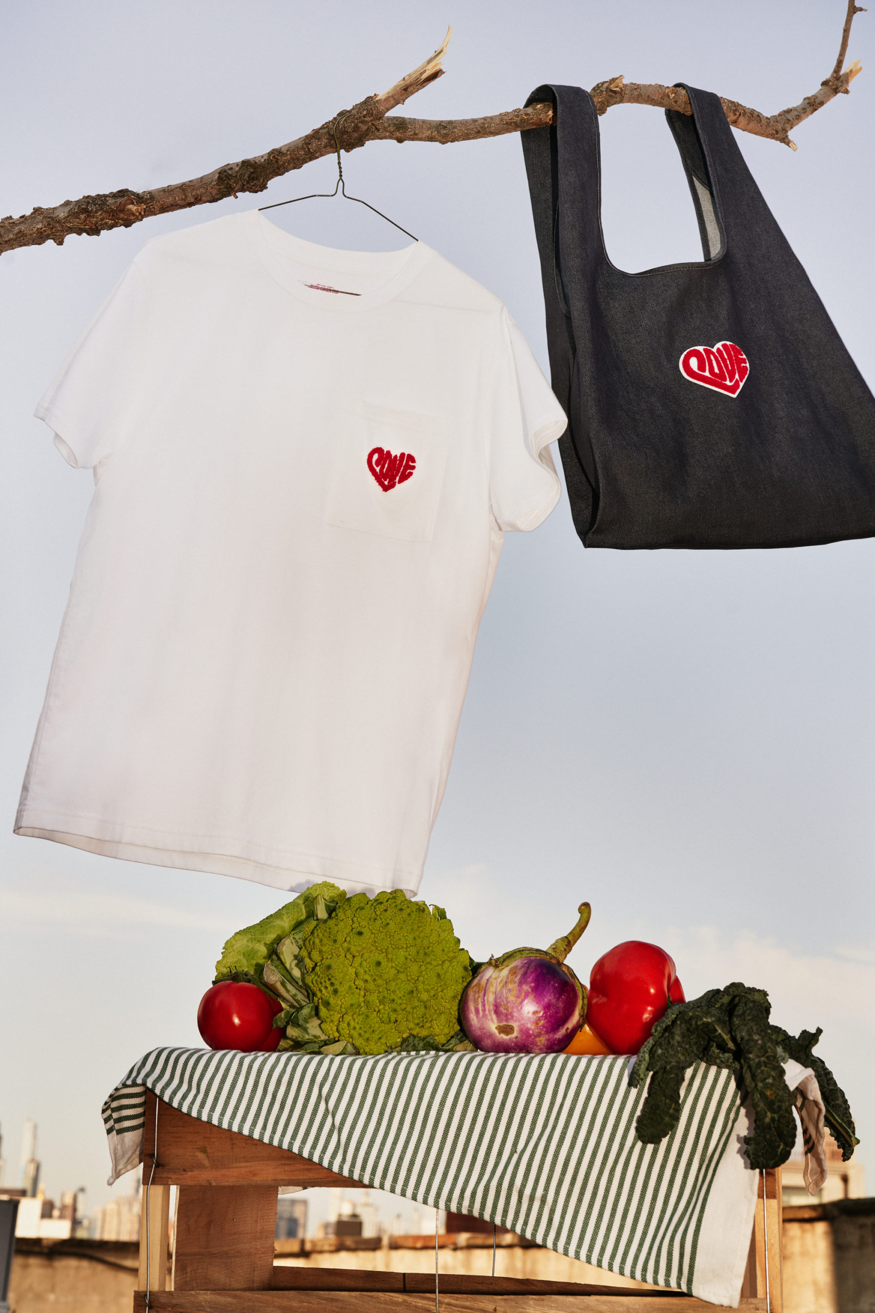 Sur la photo, les employé(e)s portent les articles de la campagne Watch Hunger Stop 2020 : un t-shirt blanc en 100 % coton bio, 35 euro, et un cabas en denim avec 25 % de polyester recyclé Repreve® , 55 euro. Les deux sont décorés d’un coeur rouge. Tous les bénéfices des ventes de ces deux articles iront au PAM.