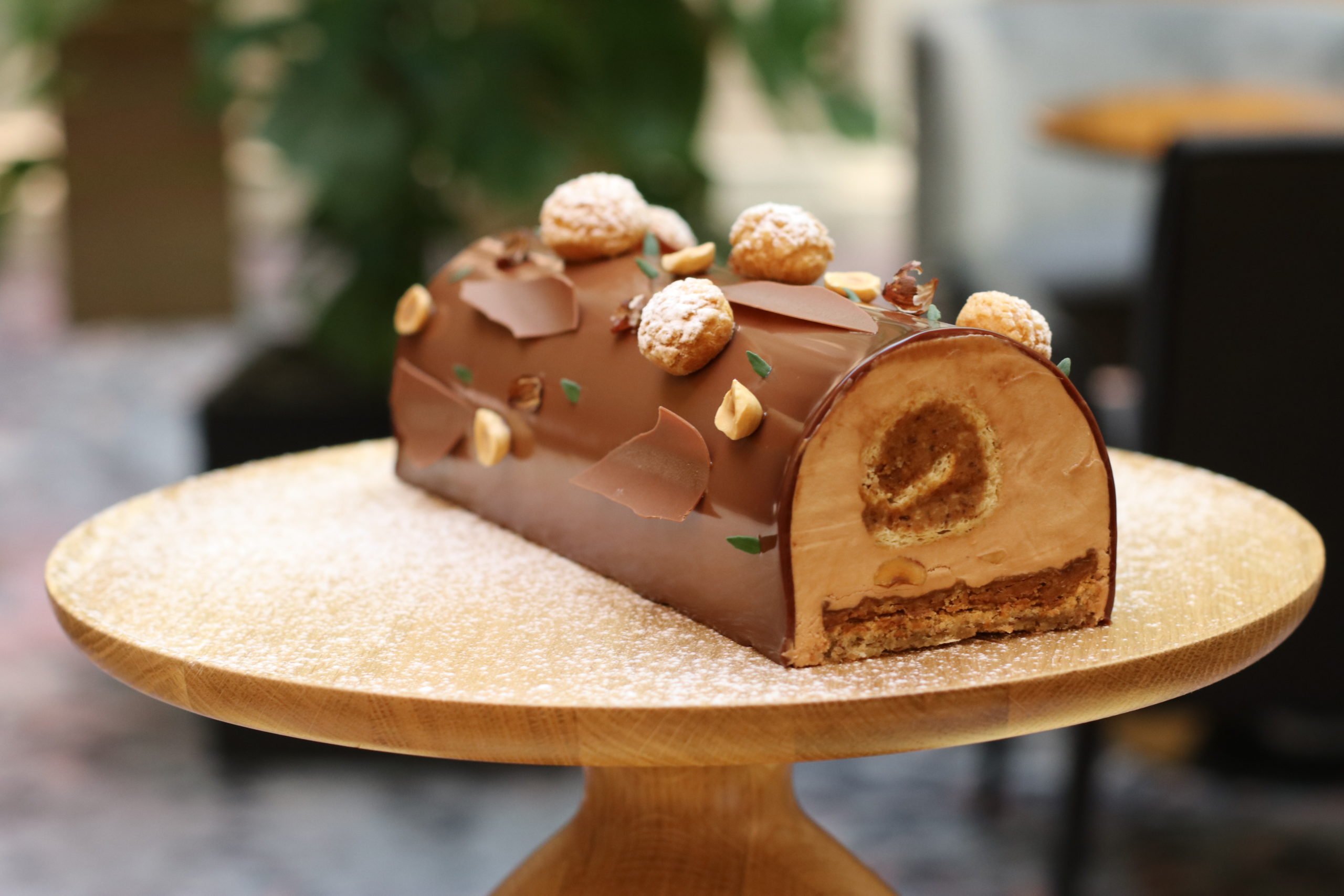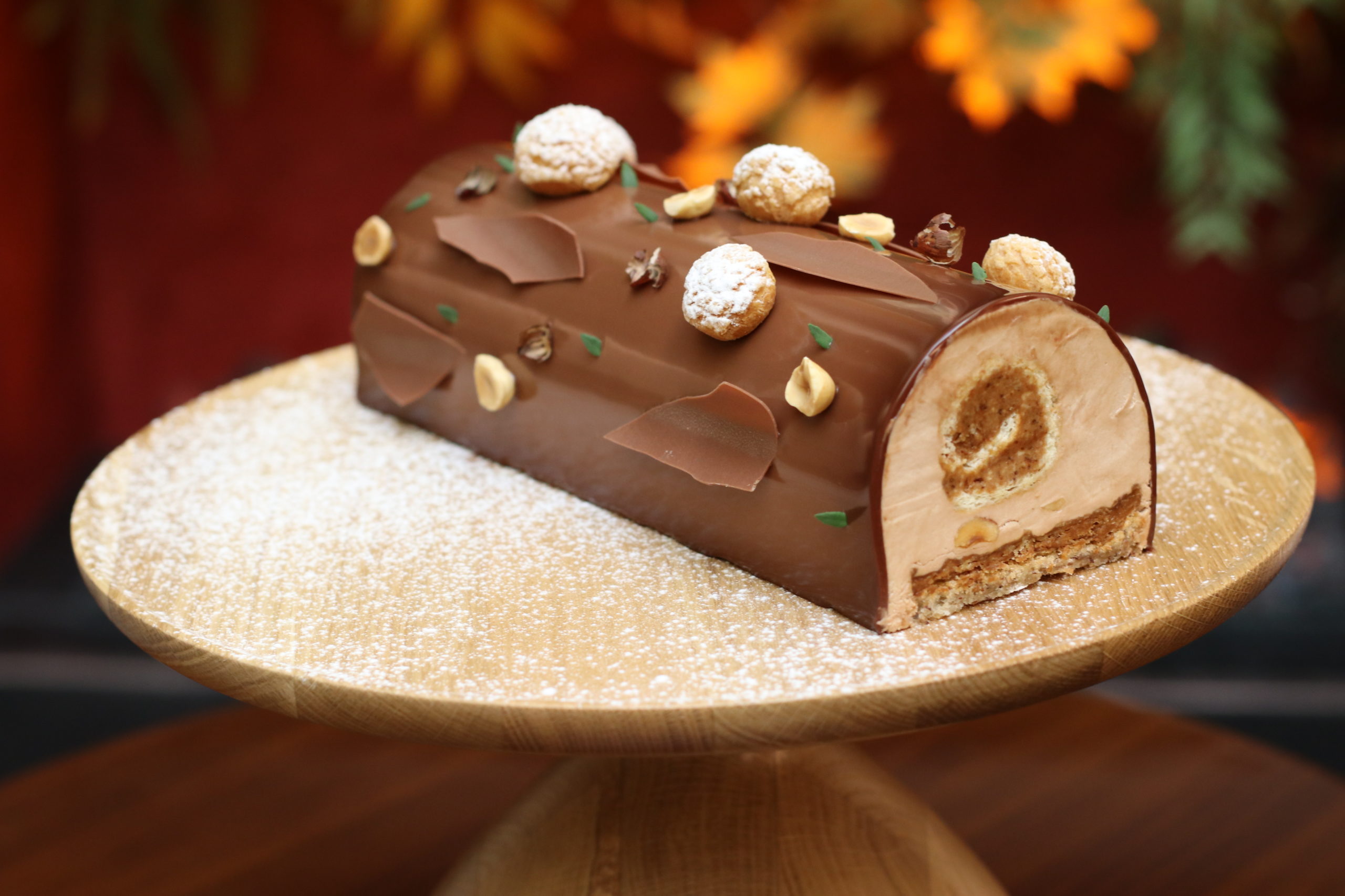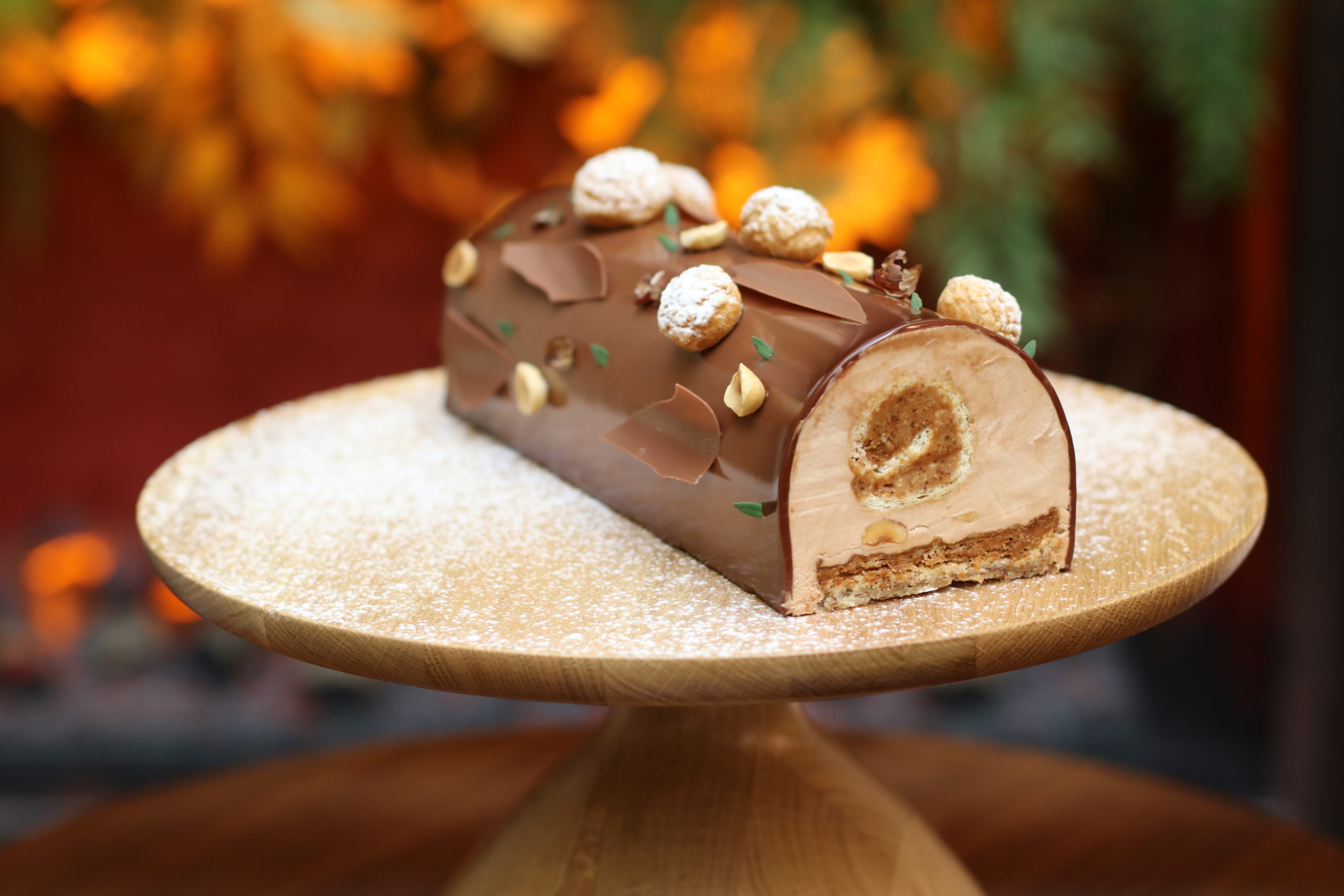 Composé d’un biscuit moelleux noisette au miel de Châtaignier, d’un croustillant noisette, d’un biscuit roulé aux praliné thym-citron, d’une mousse au chocolat lait onctueuse ainsi que d’un glaçage Gianduja, le dessert emblématique est inspiré de la saison hivernale.